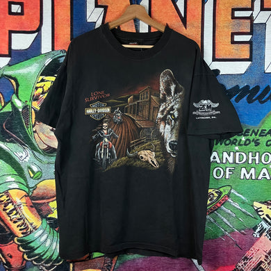 Vintage 90s Harley Davidson “Lone Survivor” Biker and Wolf Western Graphic Logo Tee Size XL