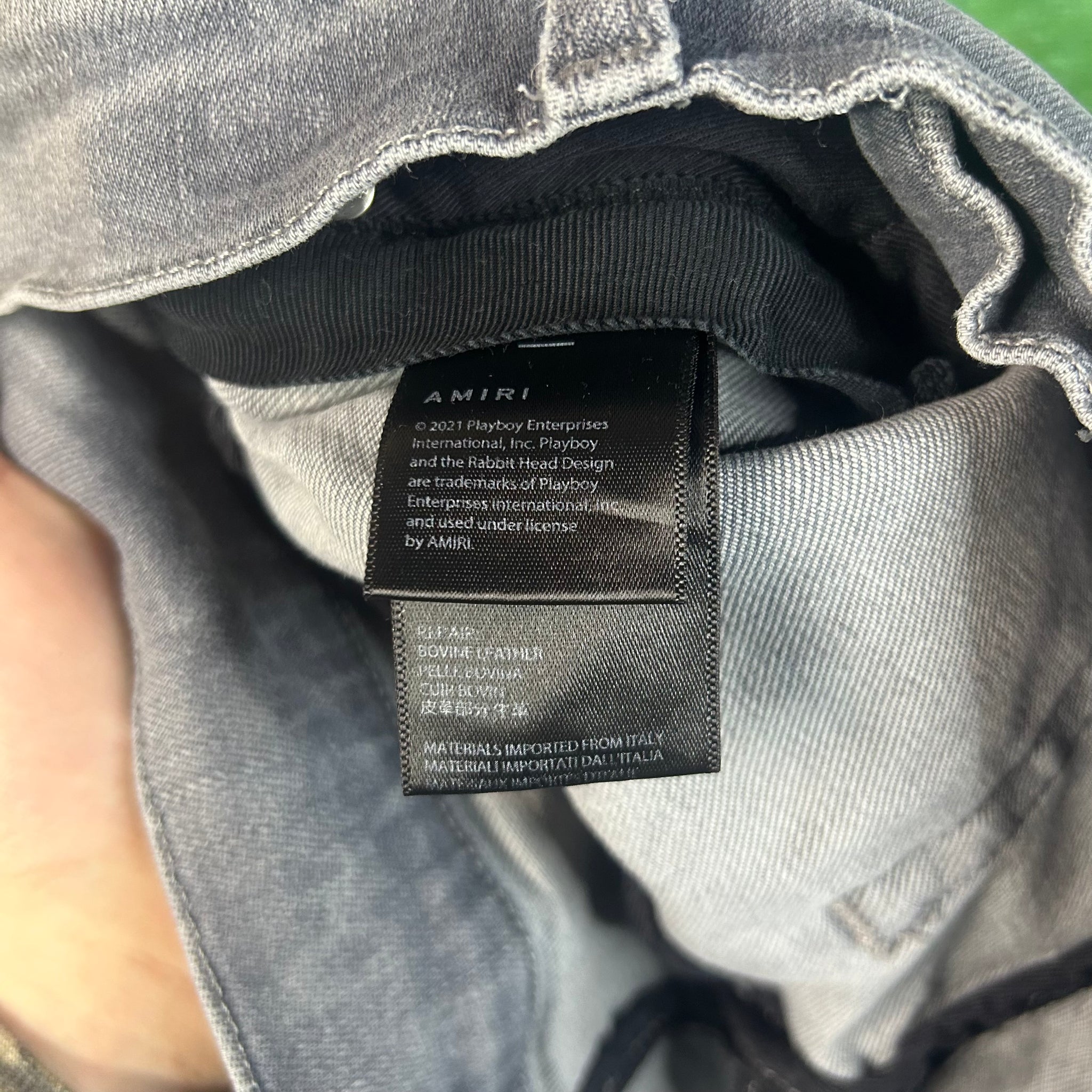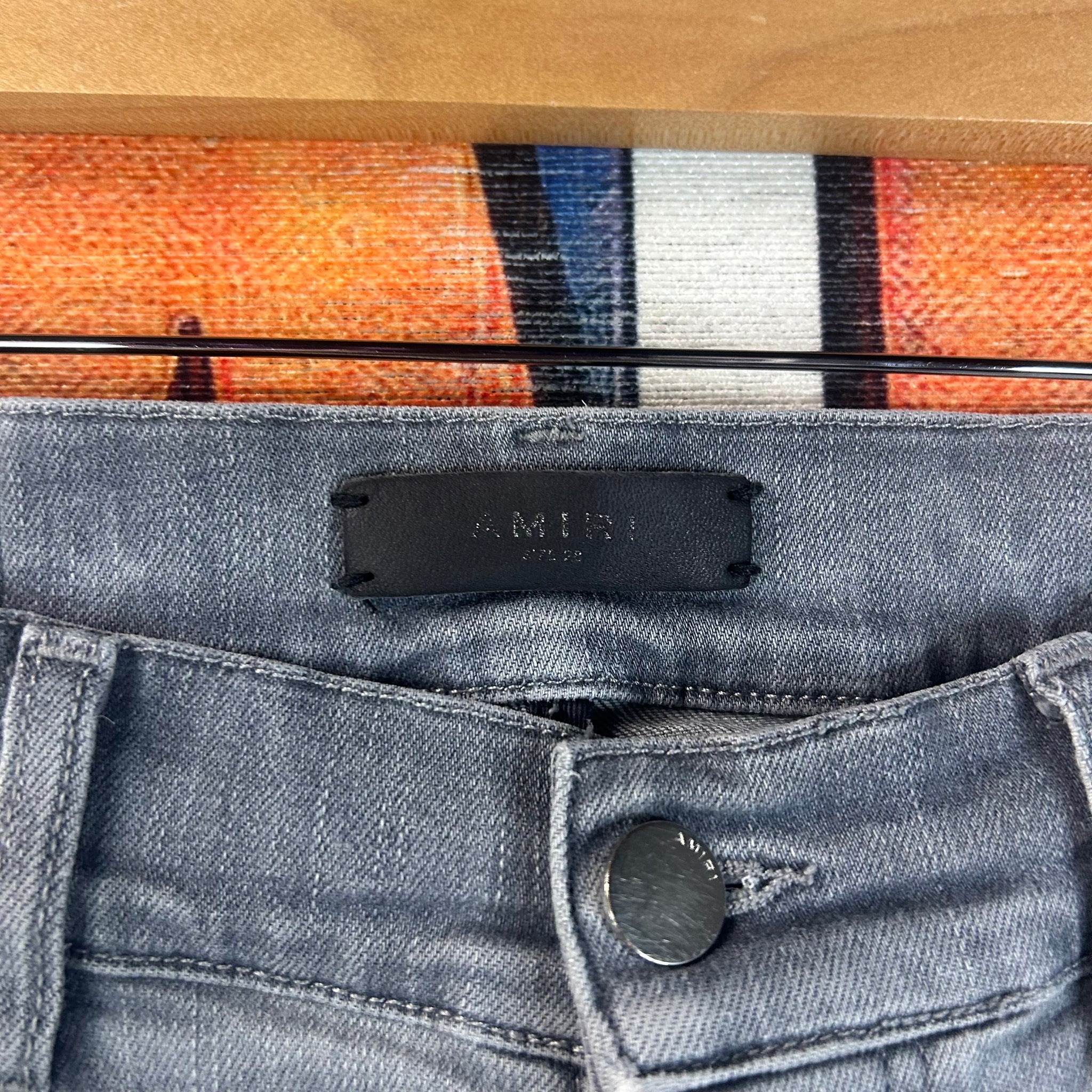Amiri MX1 jeans in grey featuring signature distressing and a skinny fit silhouette. Premium stretch denim construction with rock-inspired detailing for streetwear appeal. All flaws if any shown in photos.