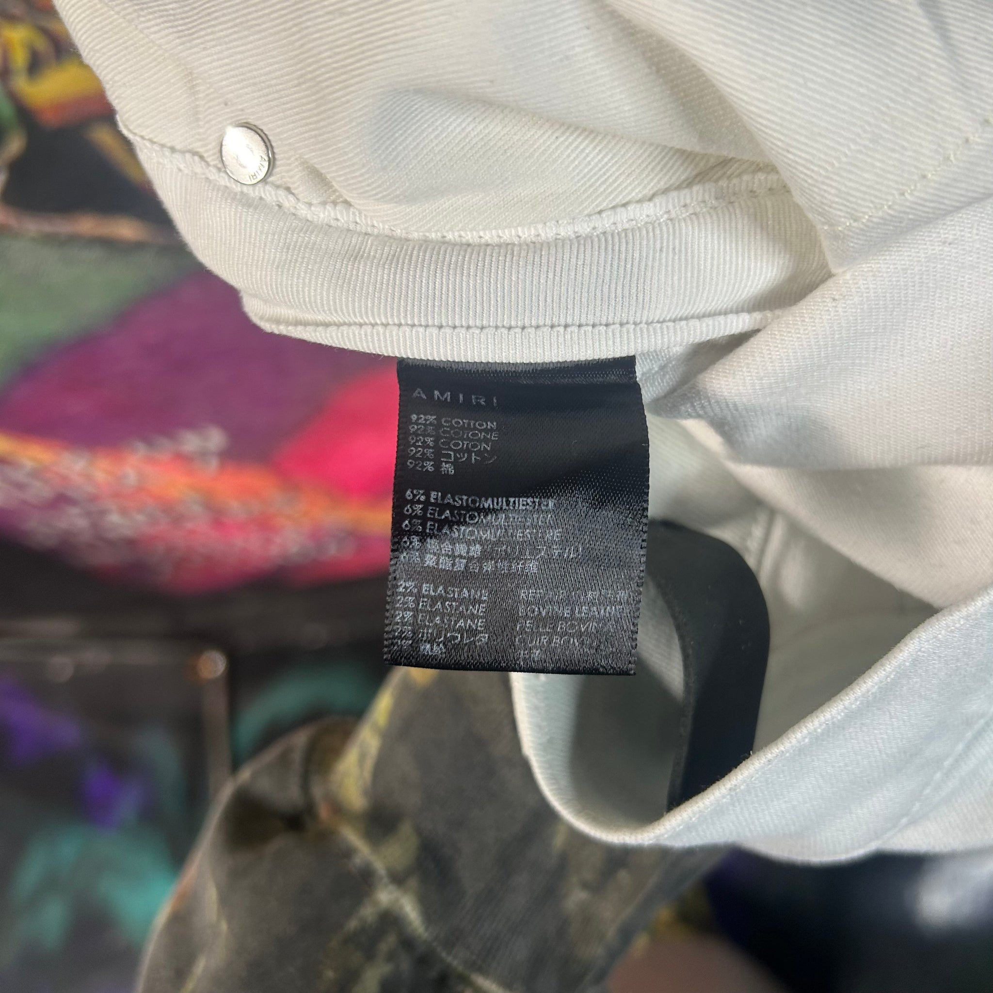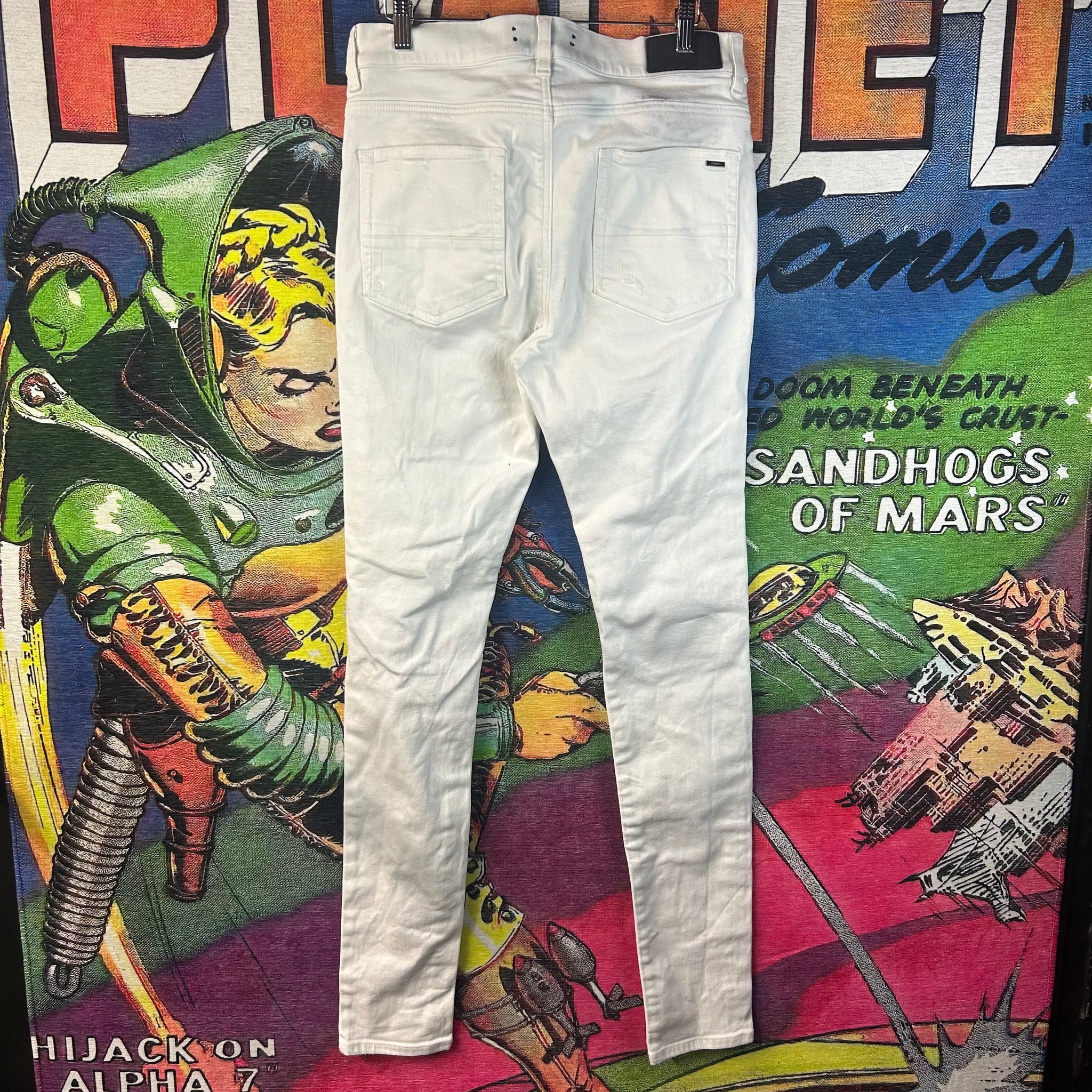 Amiri MX1 jeans in white featuring a slim skinny fit with signature distressing and premium denim construction. Perfect for streetwear and luxury fashion styling. All flaws if any shown in photos.