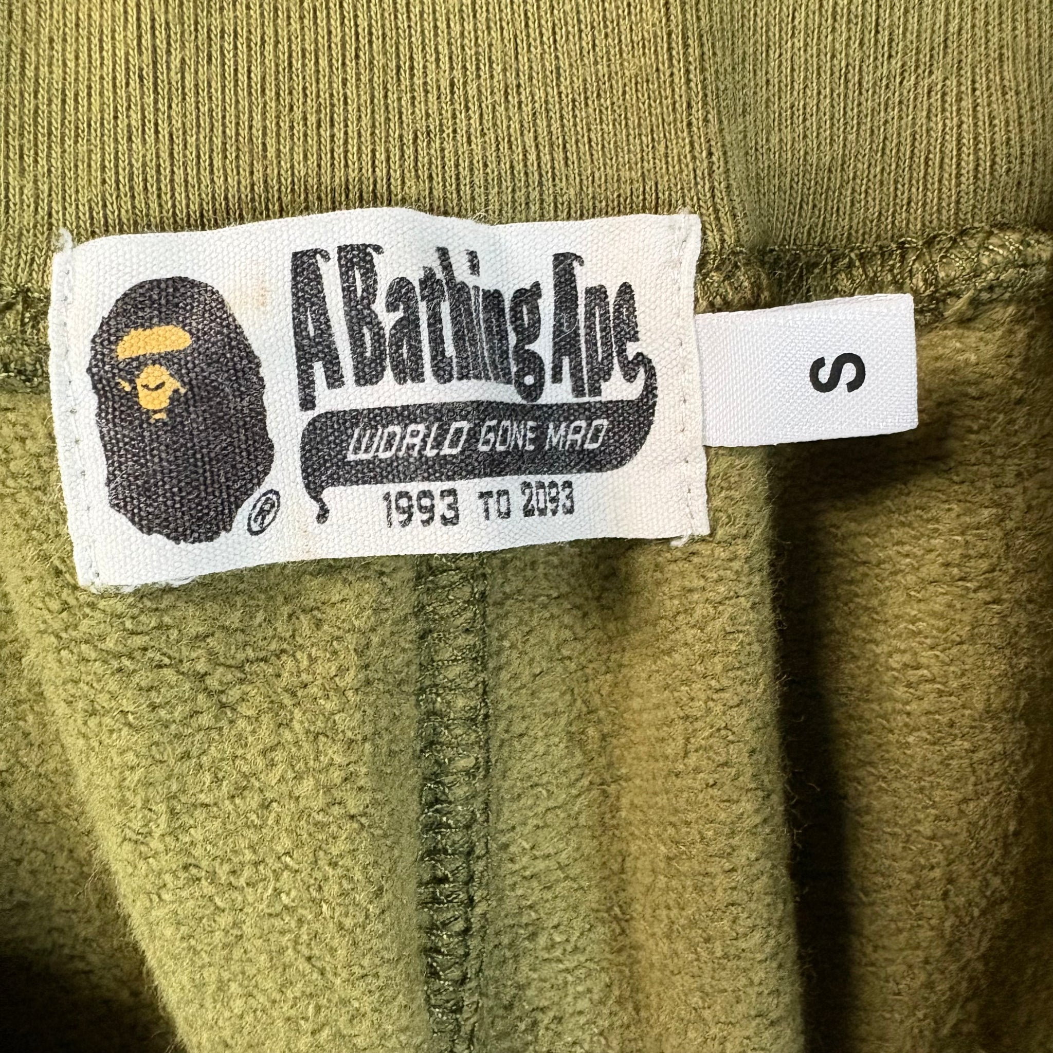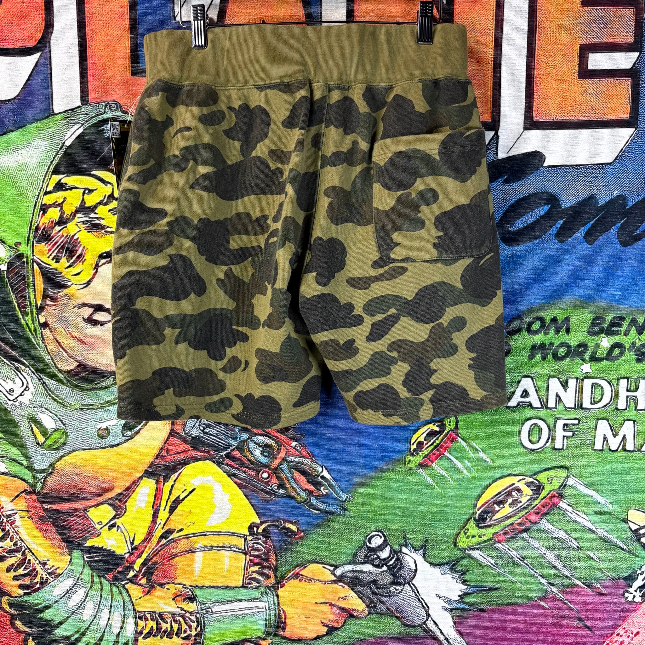 Classic BAPE 1st Camo sweat shorts in the signature green colorway, crafted from soft midweight fleece for everyday comfort. Features the iconic allover 1st Camo print, clean hem finish, and a comfortable elastic waistband for an easy fit. A timeless streetwear staple from A Bathing Ape, perfect for warm-weather rotation, and this pair comes in Size Small.