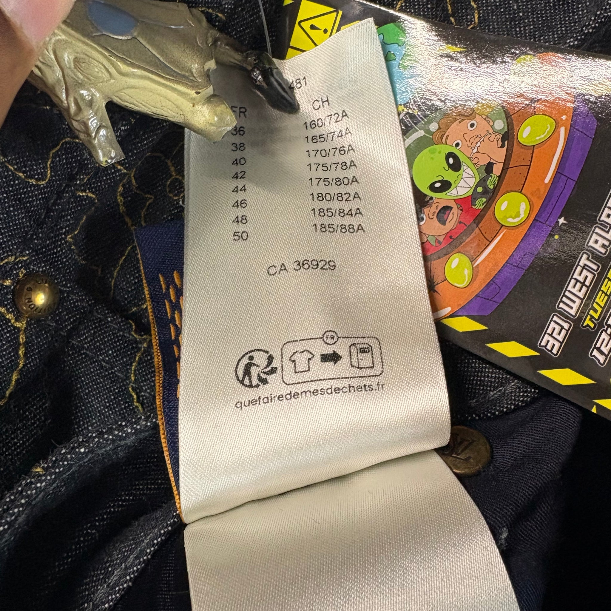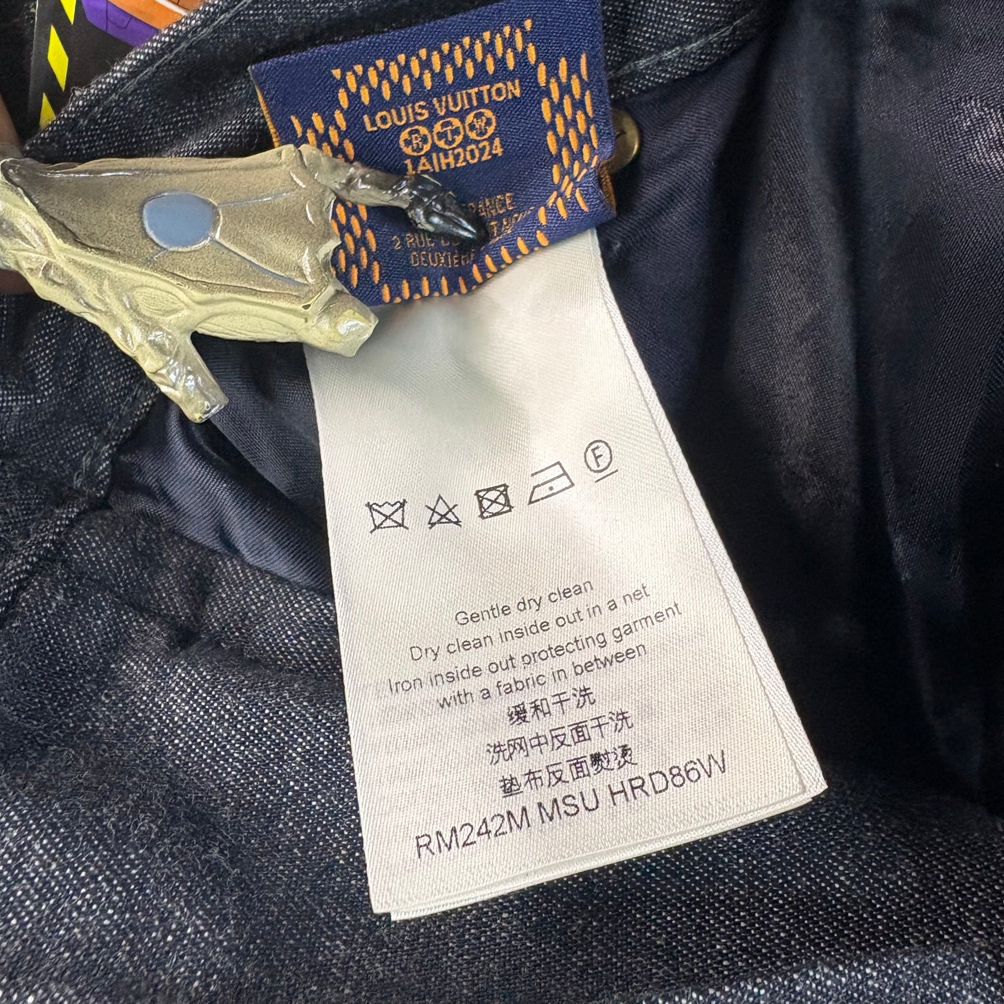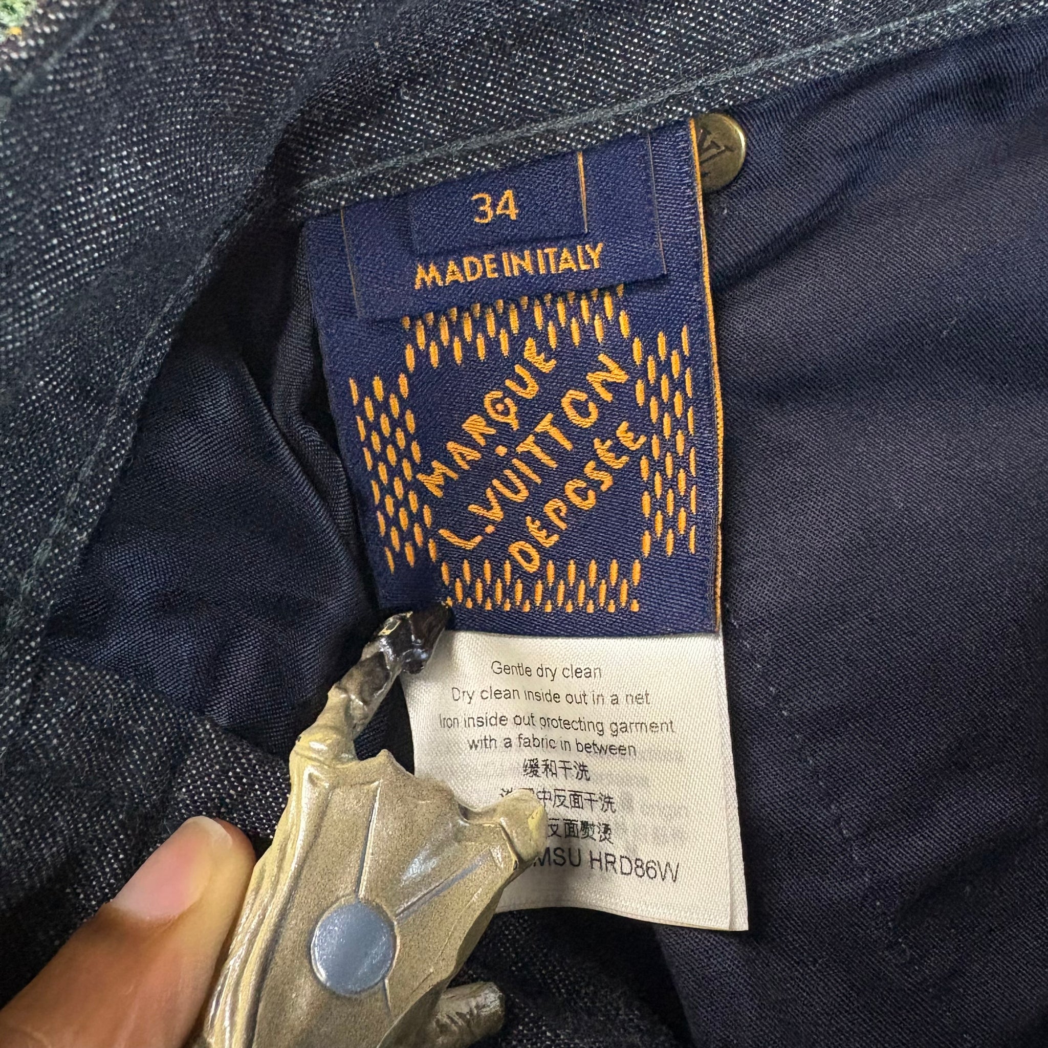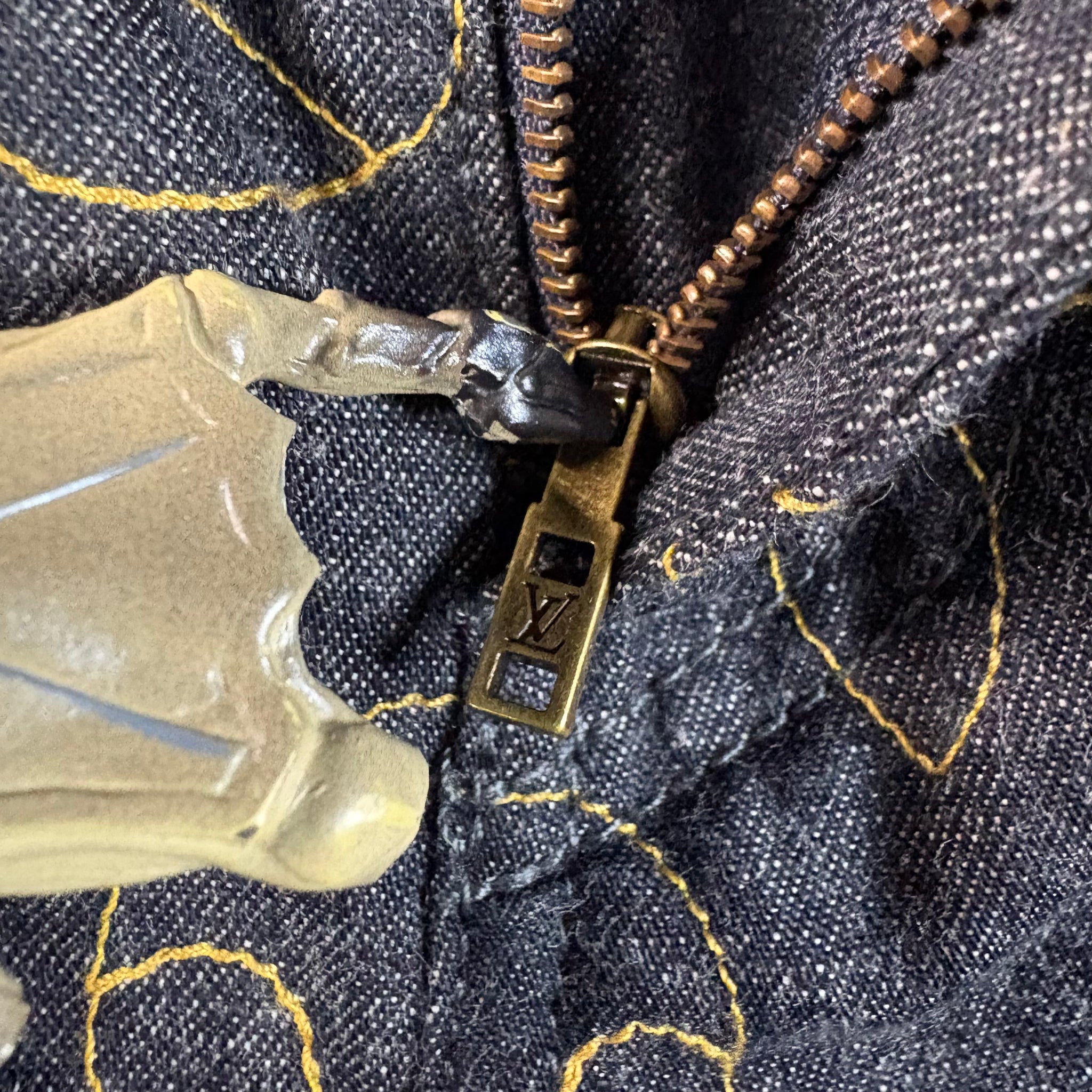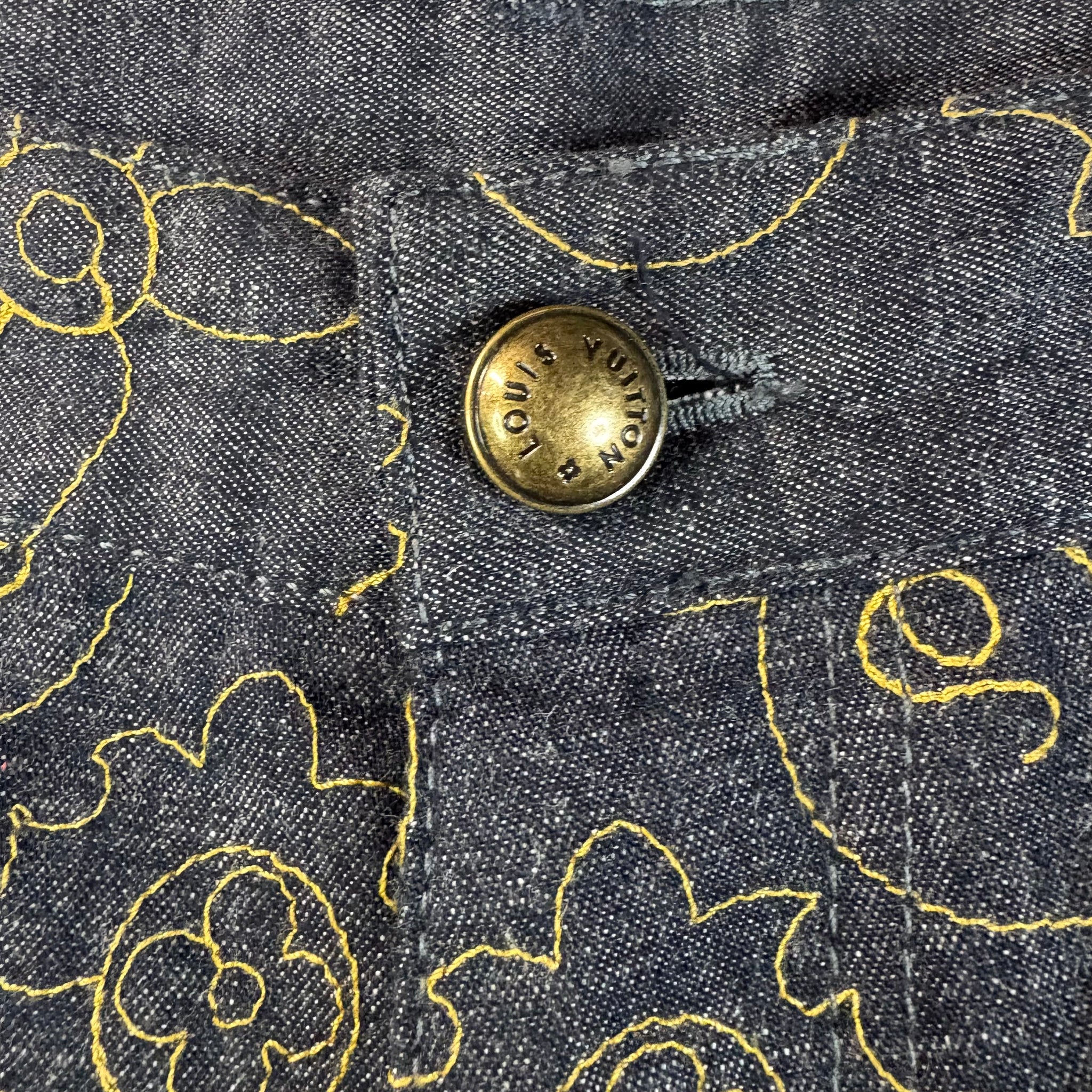 Elevate your wardrobe with these Louis Vuitton denim pants, featuring the iconic allover Monogram motif embroidered in striking yellow yarn. The Arabesque design adds a bold, luxurious touch to classic denim, making these pants a standout piece for any fashion-forward collection. Size 34"
