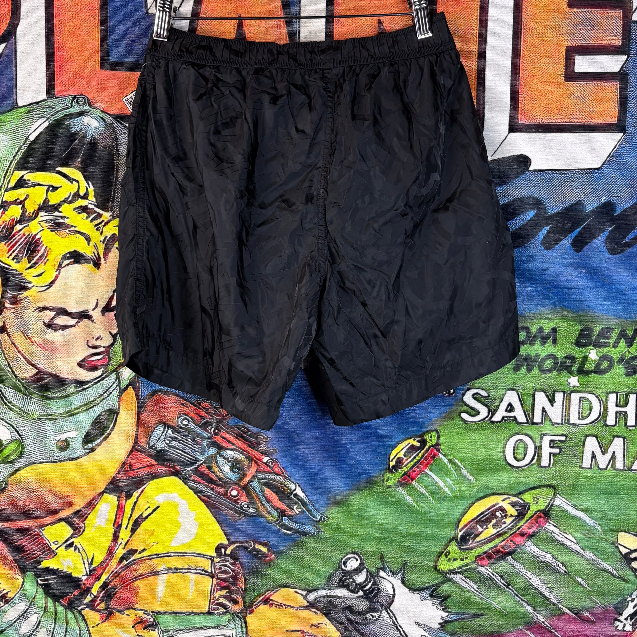 Elevate your resort or streetwear collection with these authentic Moncler shorts, marked as a size Small. These black shorts feature a subtle all-over tonal logo pattern in the nylon fabric, giving them a sophisticated texture. They are detailed with a large, tone-on-tone rubberized Moncler logo patch on the leg and have a comfortable mesh lining and elastic waistband, making them suitable for swimming or casual wear.