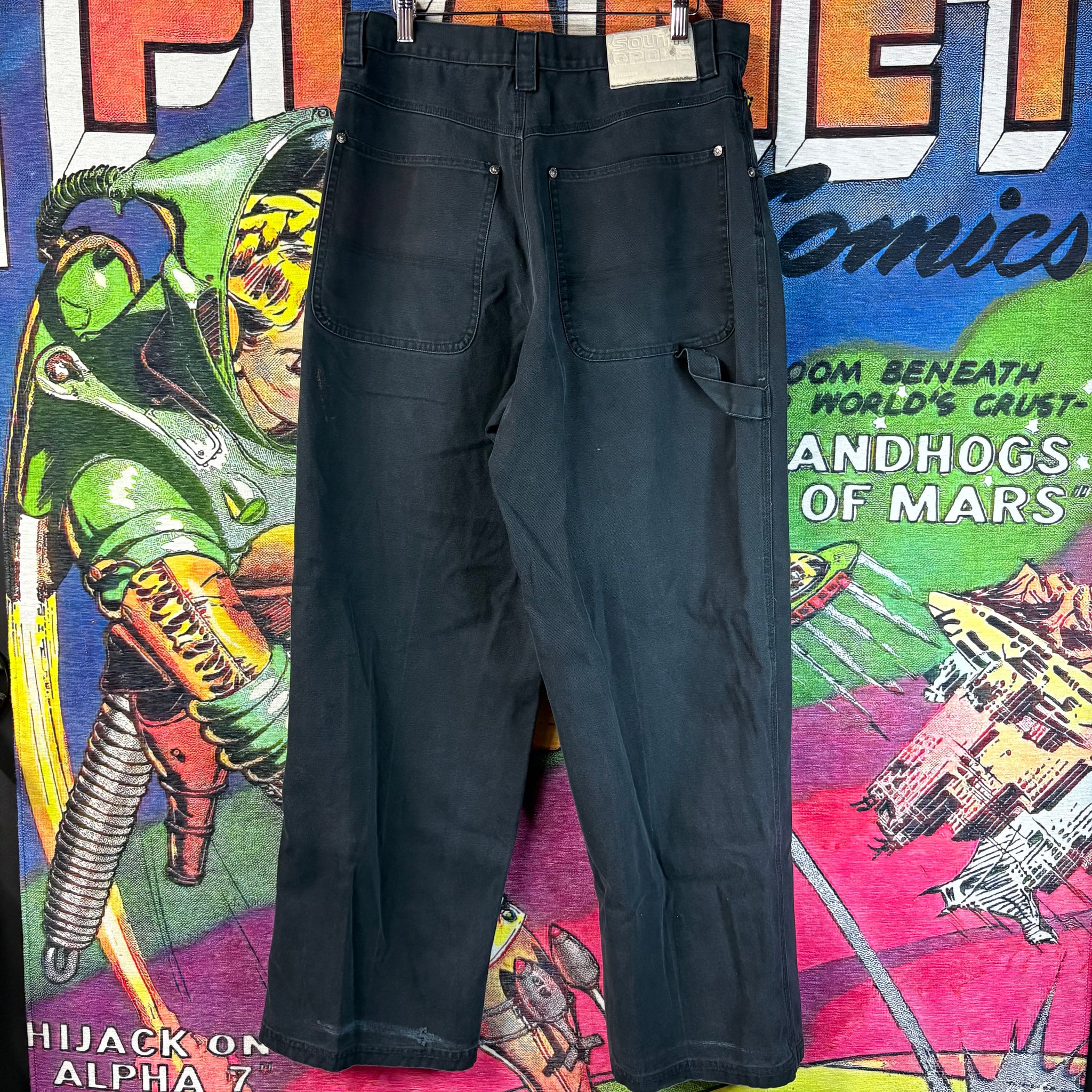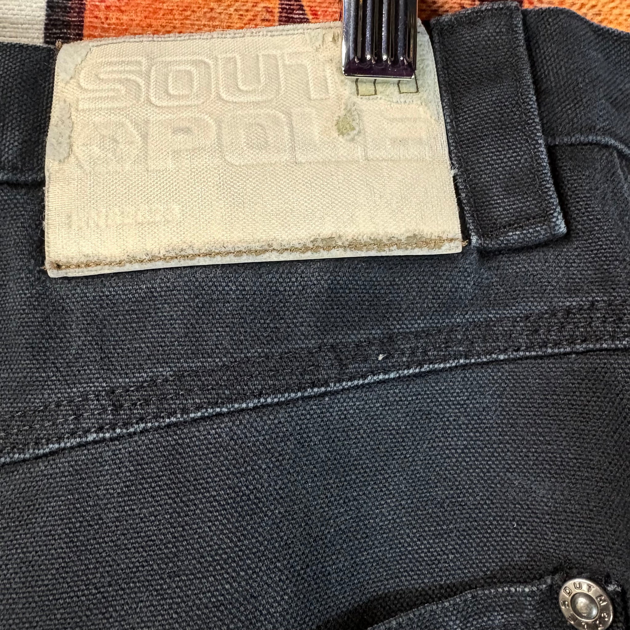Classic Y2K South Pole pants in dark denim, featuring a relaxed fit through the thighs and legs for a comfortable, streetwear-ready silhouette. These pants have a mid-rise waist and slightly tapered leg opening, perfect for layering with sneakers or boots. Durable construction with a vintage early-2000s aesthetic makes them a standout piece for any retro-inspired outfit.