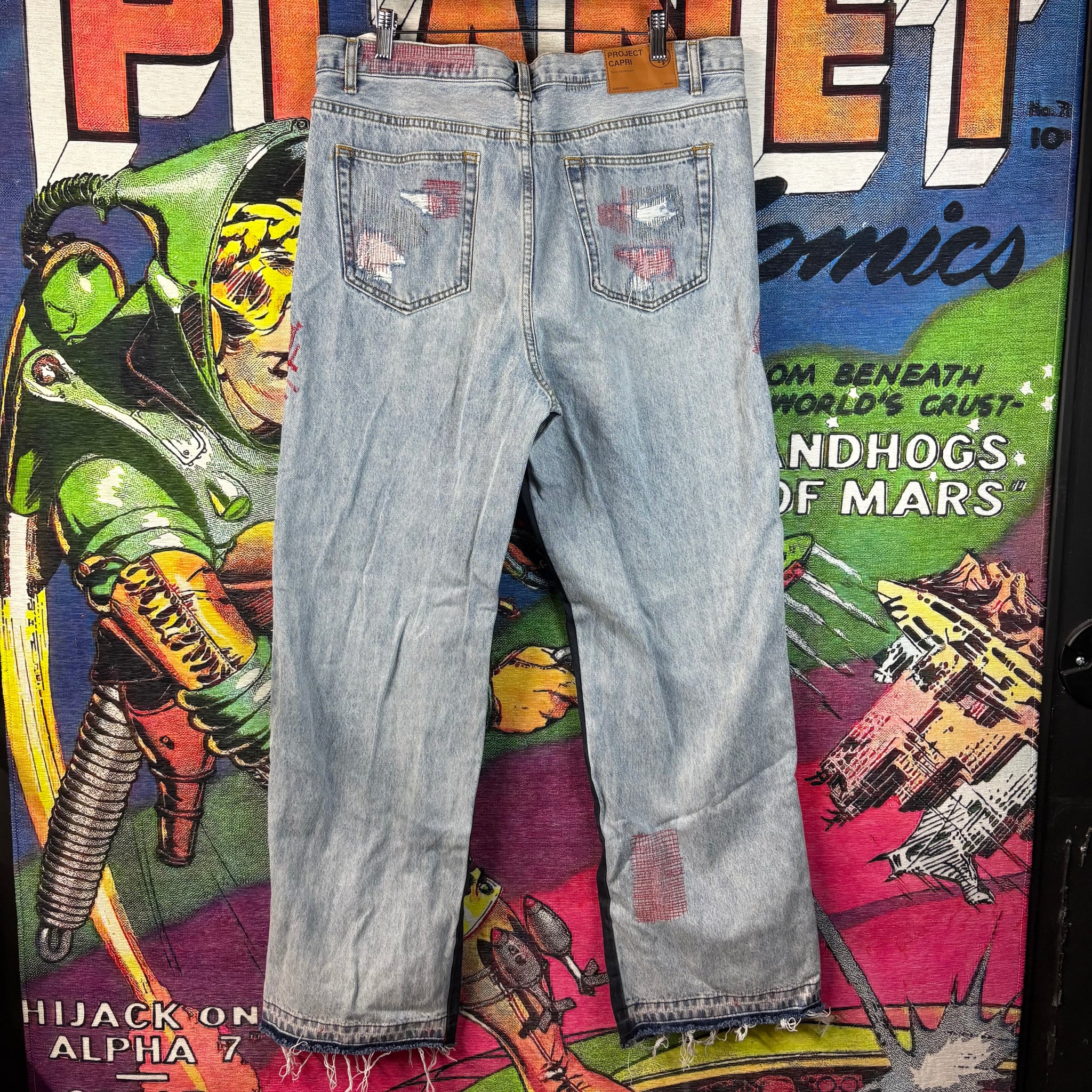 A rugged pair of distressed denim jeans from Project Capri, built with a relaxed top block and a straight, easy-draining leg. The mid-rise fit and wider knee and leg opening create a comfortable, classic silhouette, while the distressing adds character and a lived-in edge. Ideal for casual everyday wear and pairs well with tees, hoodies, and sneakers.
