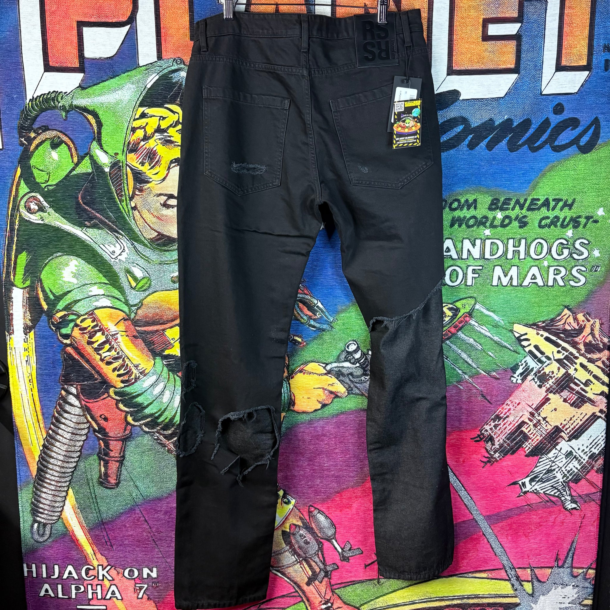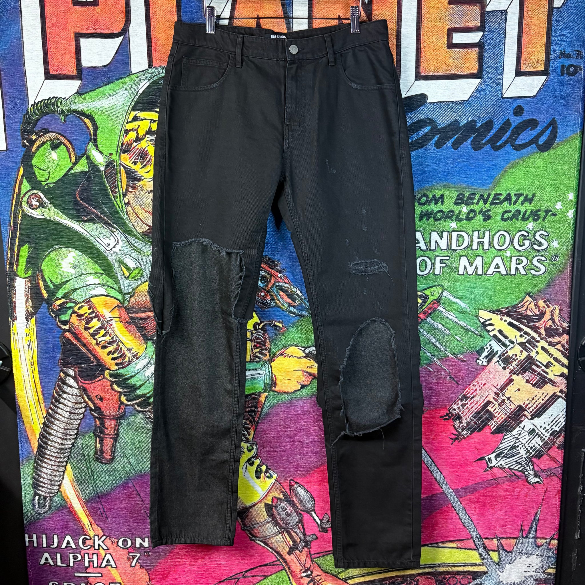 A pair of Raf Simons double-denim jeans built with that signature industrial edge — heavy texture, intentional wear, and a raw, deconstructed feel. The wash sits in that perfect mid-blue zone, with distressed detailing that looks naturally broken-in rather than overdone. Thick stitching and paneled construction give them a sculpted shape while still staying comfortable and wearable.