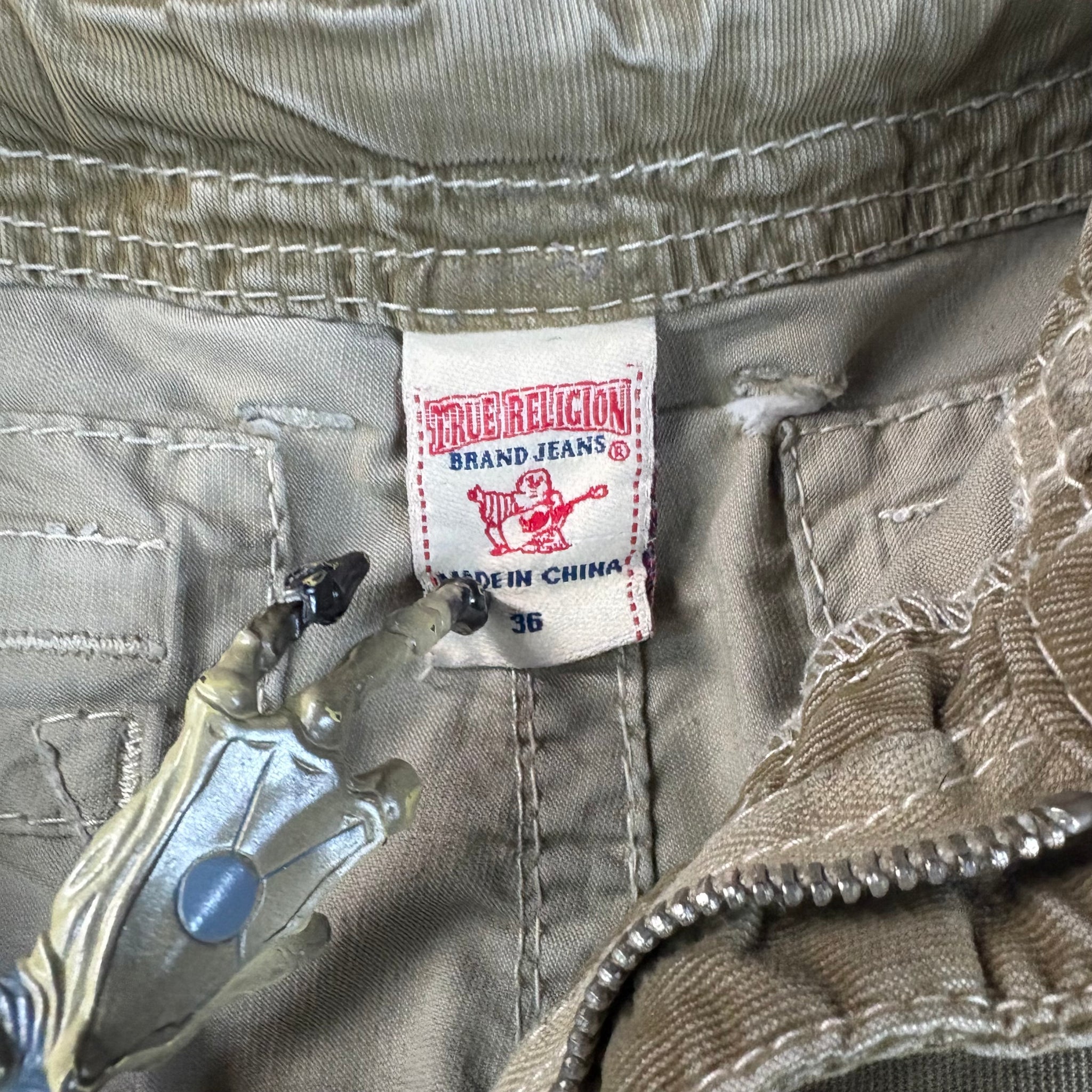 True Religion Isaac Cargo Shorts in either the “Old Sage” green or “Wheat” brown wash, finished with signature Big T white contrast stitching. These shorts embody True Religion’s classic rugged style, featuring multiple cargo pockets, heavy-duty stitching, and premium denim-inspired cotton construction. A standout Y2K-era piece blending streetwear edge with functional design.