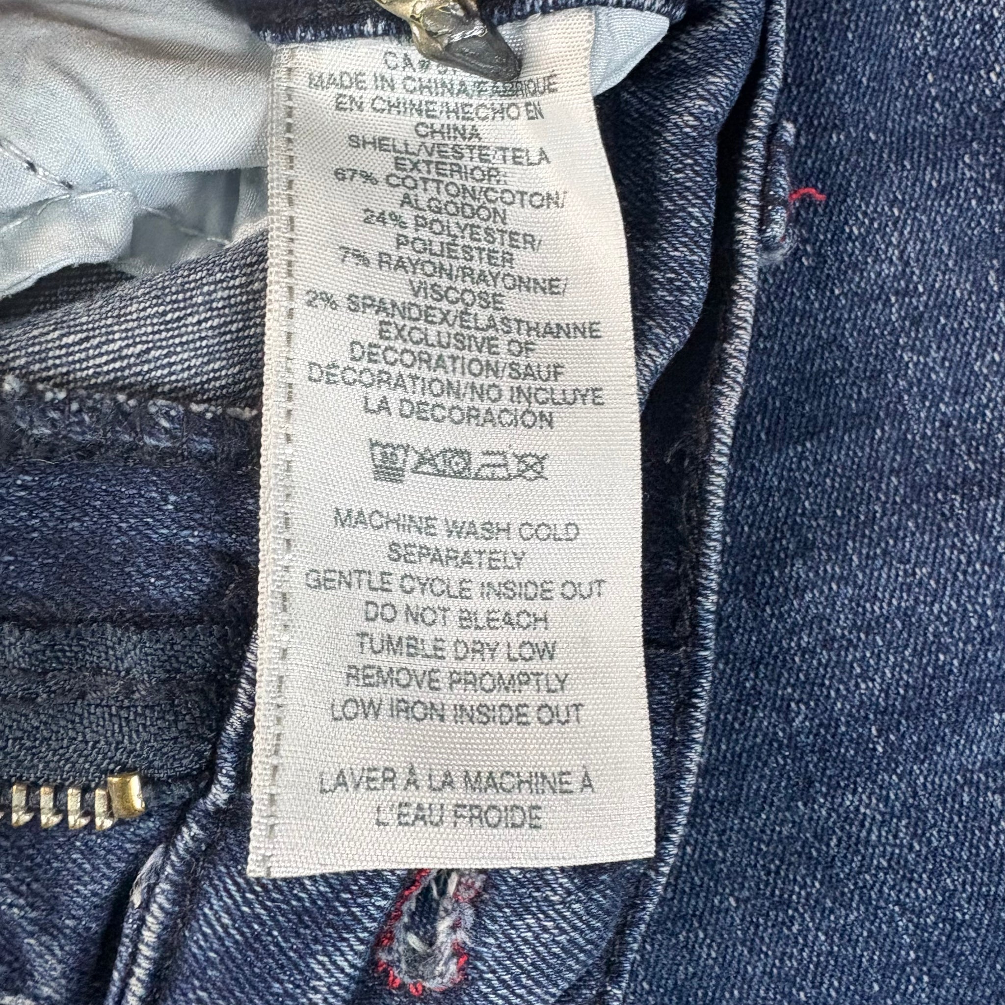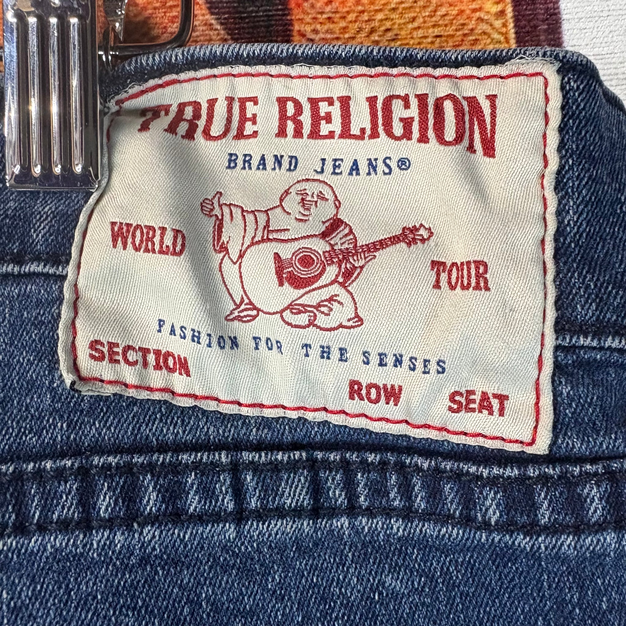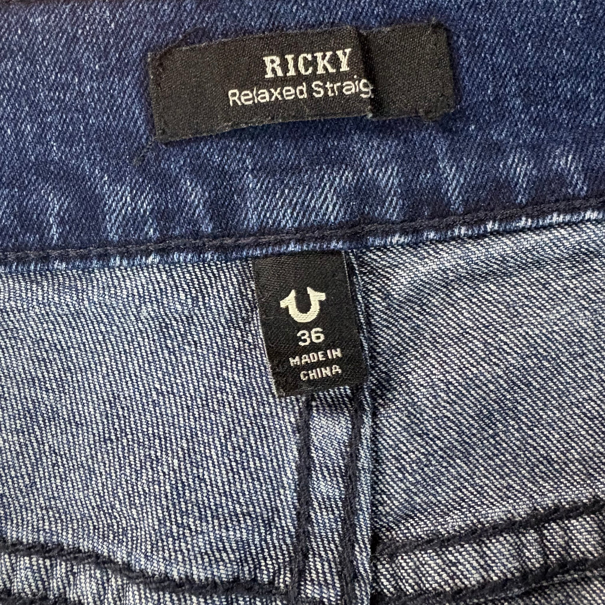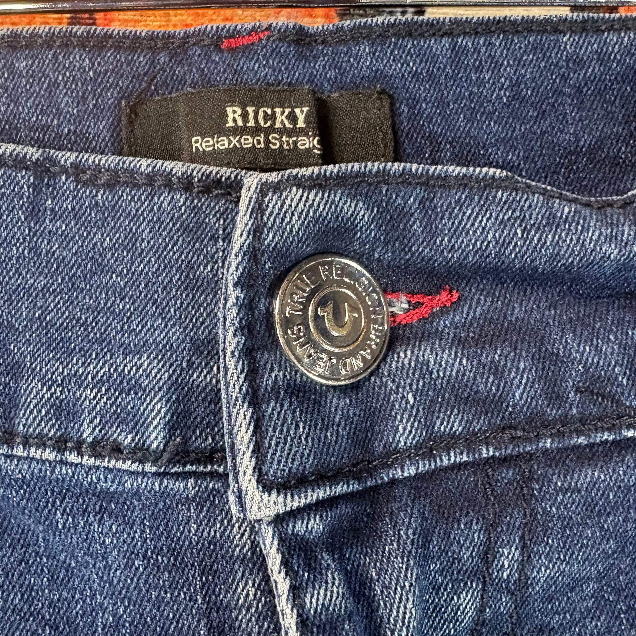 These True Religion Ricky jeans feature a dark indigo wash with signature red stitching, offering a bold yet classic look. Designed with a relaxed straight fit through the leg, they provide comfort without sacrificing style. The back flap pockets showcase the brand’s iconic red horseshoe embroidery, making these jeans instantly recognizable. Sized at 36”, they are perfect for anyone seeking a versatile, high-quality pair of jeans with authentic True Religion detailing.