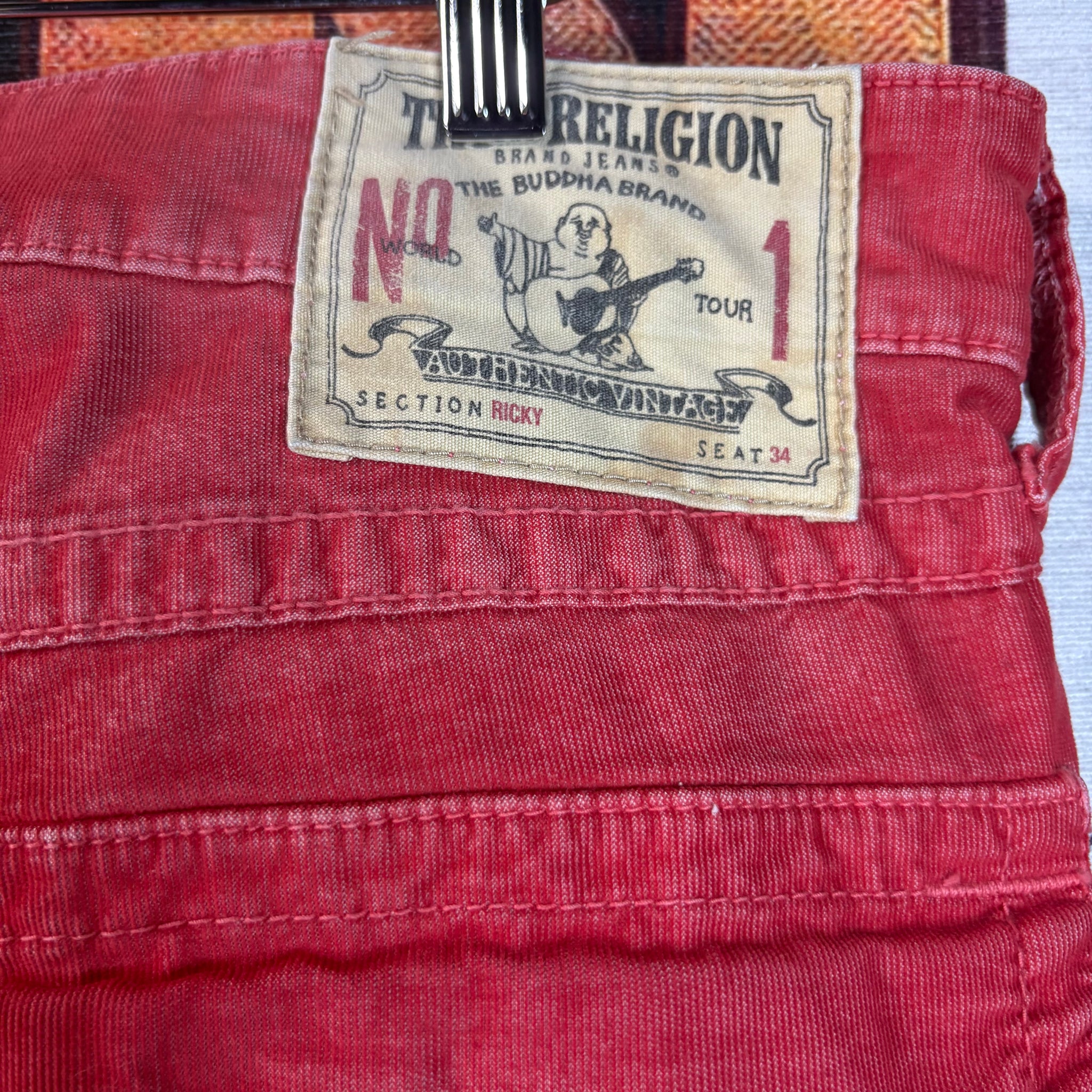 Get noticed in these authentic True Religion "Ricky" corduroy pants that deliver a punch of vintage style. The bold distressed coral-red color and signature stitched flap back pockets give them that iconic look, ensuring a comfortable, head-turning addition to any collection.