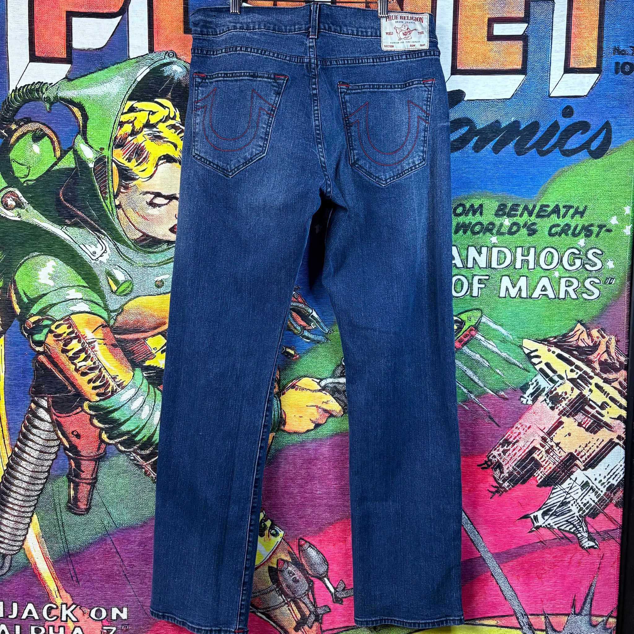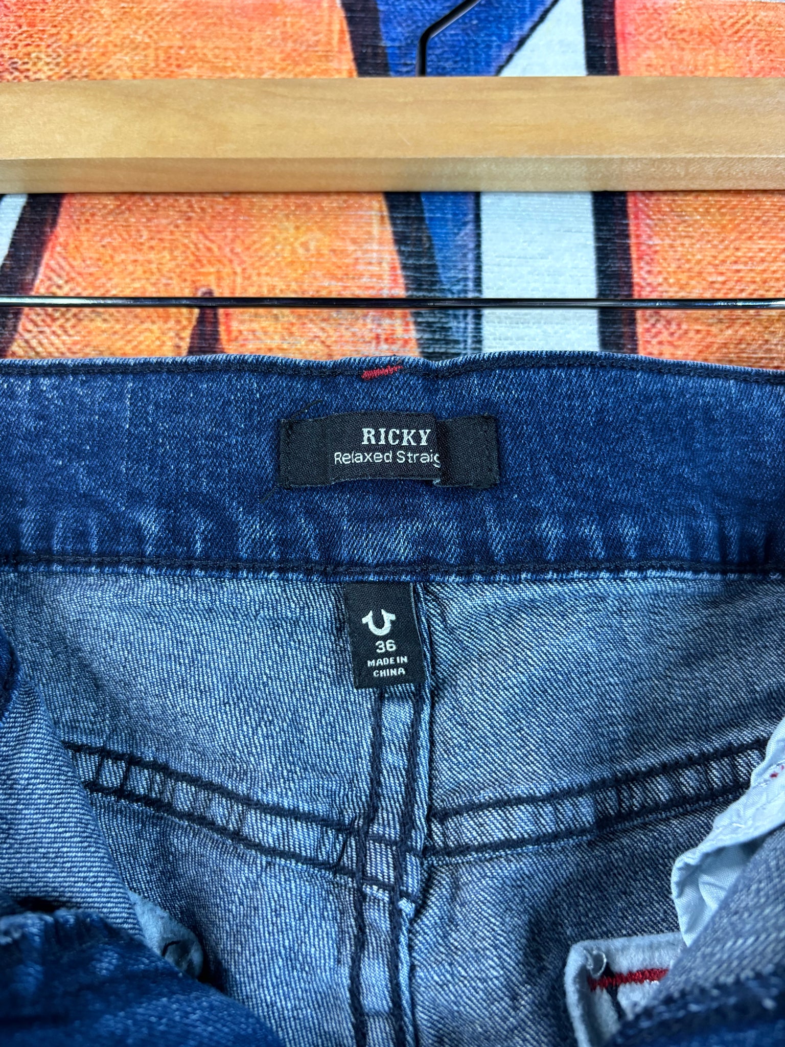 Grab these authentic True Religion "Ricky" Relaxed Straight jeans featuring a deep indigo wash and the brand's signature red horseshoe stitching on the back pockets. This iconic size 36 denim offers a comfortable, laid-back fit that perfectly channels the sought-after Y2K designer aesthetic.