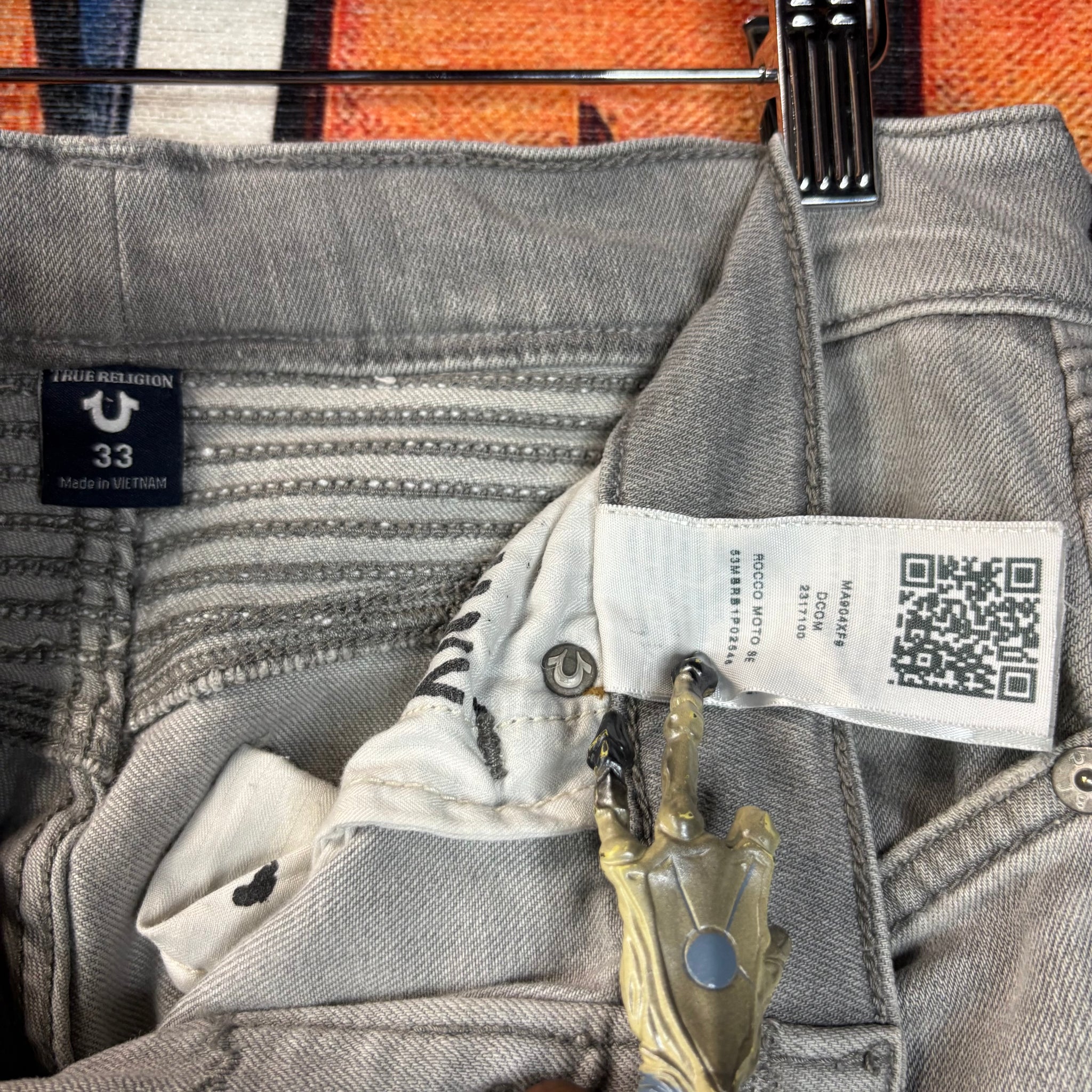 These are a striking pair of True Religion Rocco Moto jeans in a faded grey wash, featuring a slim fit with distinctive ribbed moto paneling on the knees and thighs for an edgy, textured look. The distressed wash and unique moto detailing make them a great, eye-catching statement piece for casual wear.