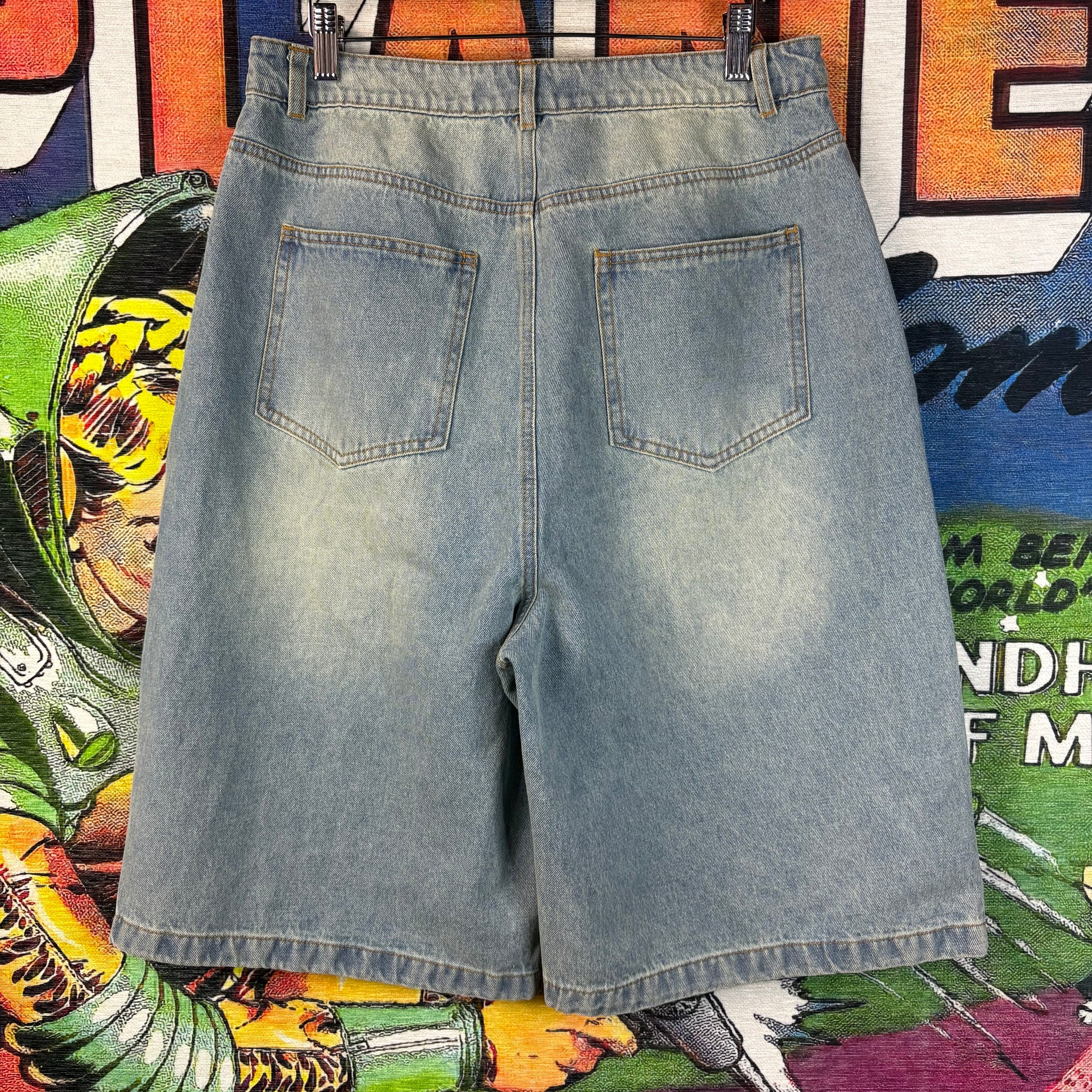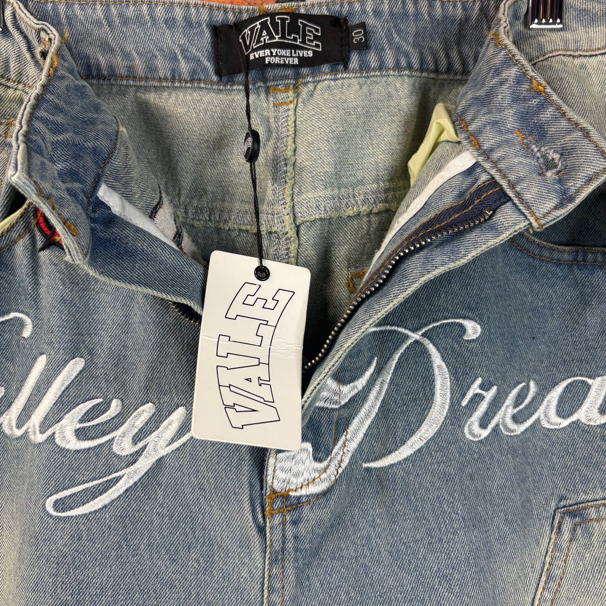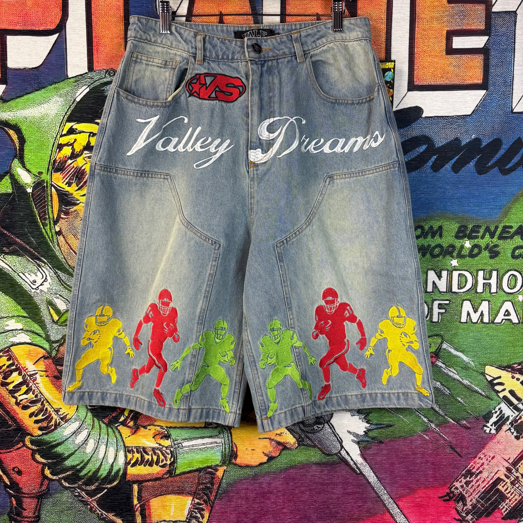 Vale Forever “Valley Dreams” Jorts featuring detailed embroidered football players and text graphics. These denim shorts capture a playful yet nostalgic aesthetic, blending sporty motifs with streetwear design. Crafted from sturdy denim with a relaxed Y2K-inspired fit, they offer both character and comfort — a standout piece for vintage and graphic lovers alike.