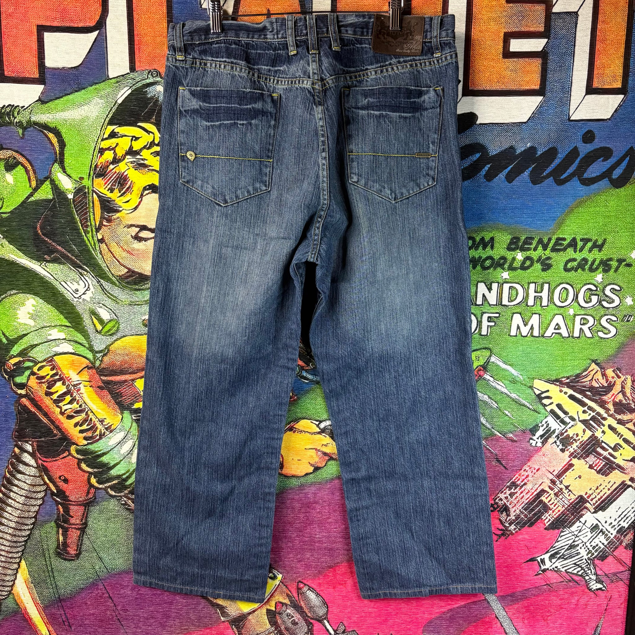 These Y2K Alademiks jeans bring early-2000s streetwear vibes with a relaxed, baggy fit and standout detailing. Crafted from durable denim, they feature subtle design accents that capture the brand’s signature aesthetic while the vintage wash adds a worn-in, authentic look. Sized at 36”, these jeans offer a roomy silhouette perfect for layering and making a statement in classic Y2K style.