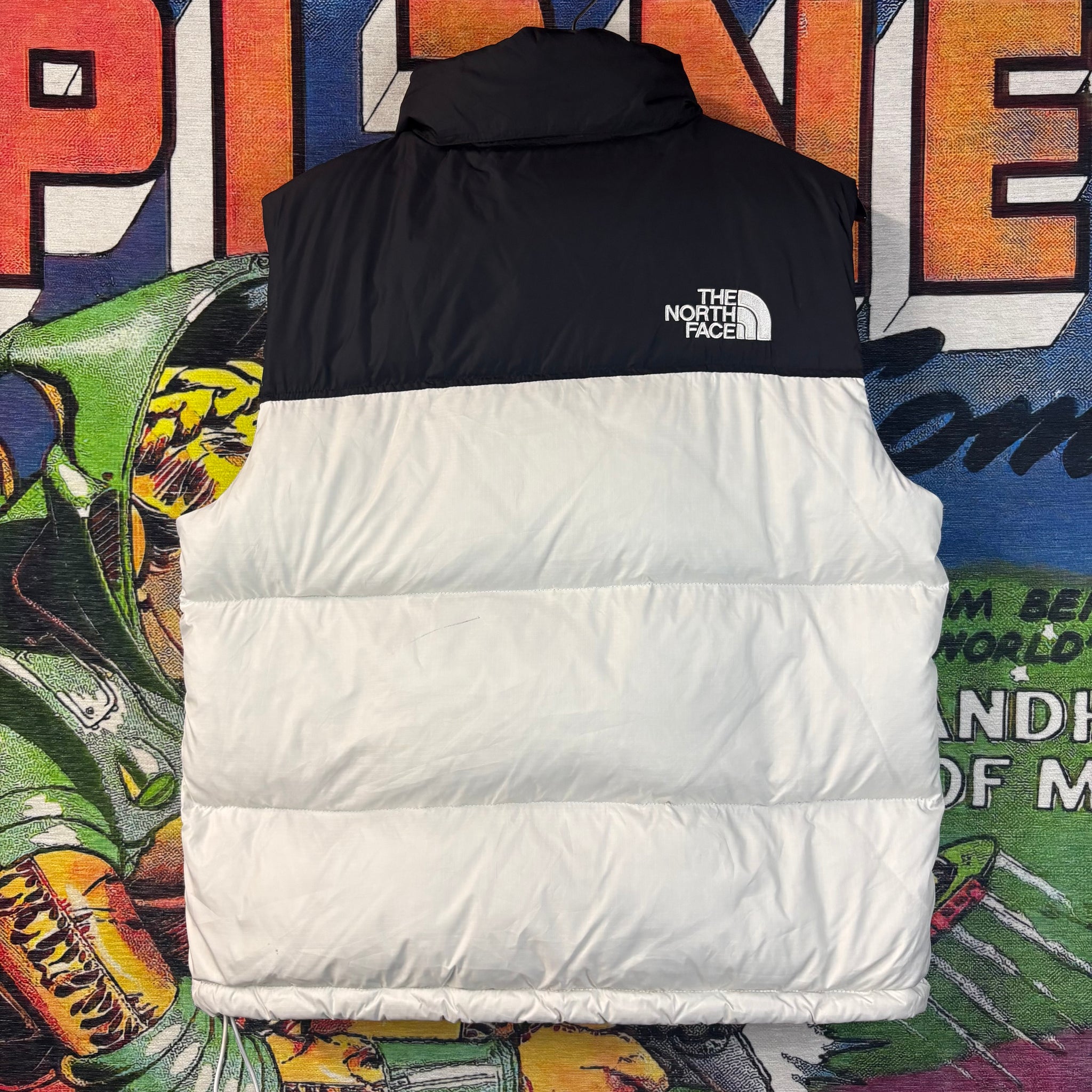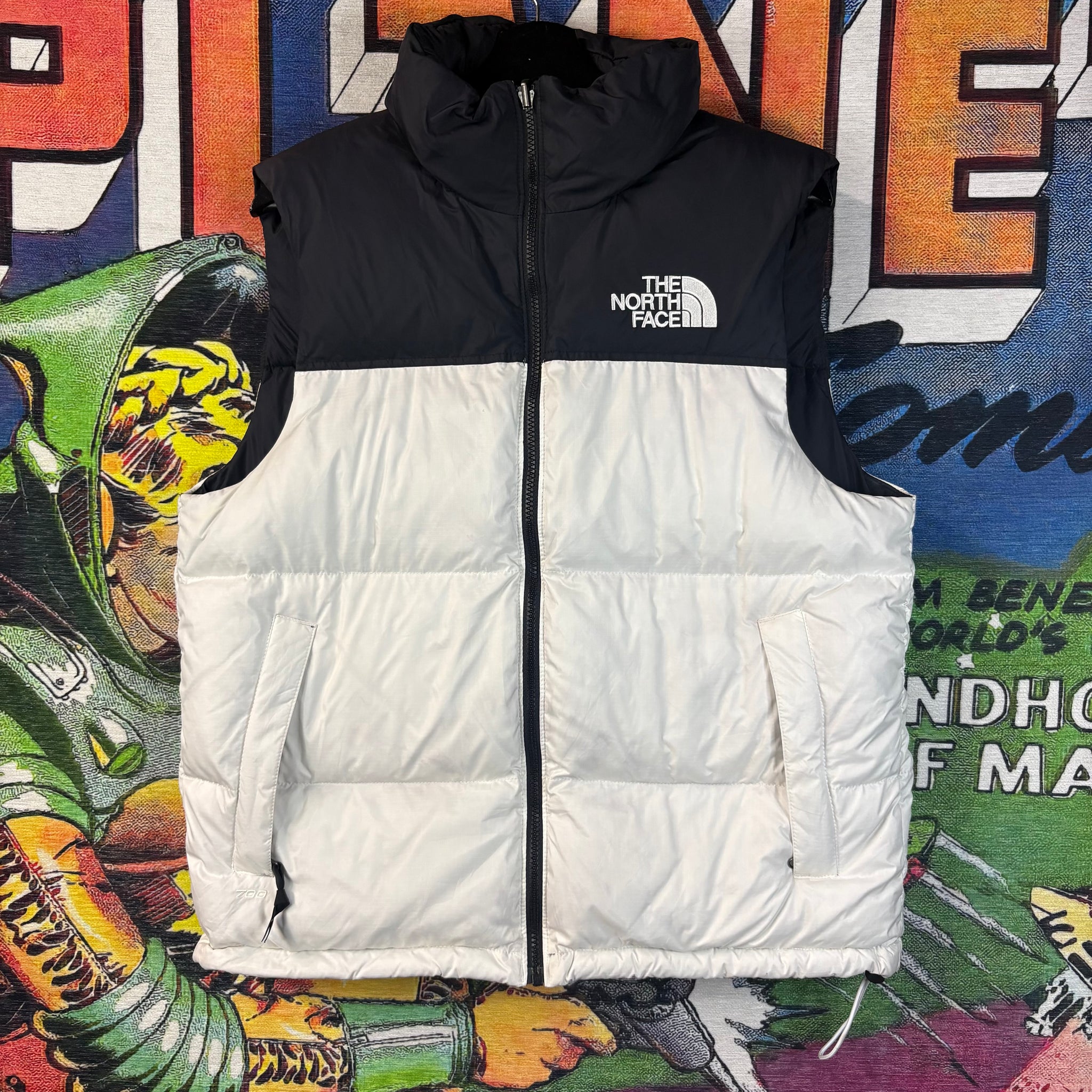 The North Face 1996 Retro Nuptse Vest in a clean white and black colorway. A modern reissue of the iconic 90s design, featuring durable ripstop fabric, lofty 700-fill down insulation, and a boxy silhouette for that classic mountaineering-meets-streetwear look. Lightweight yet exceptionally warm, this piece embodies both function and timeless style.
