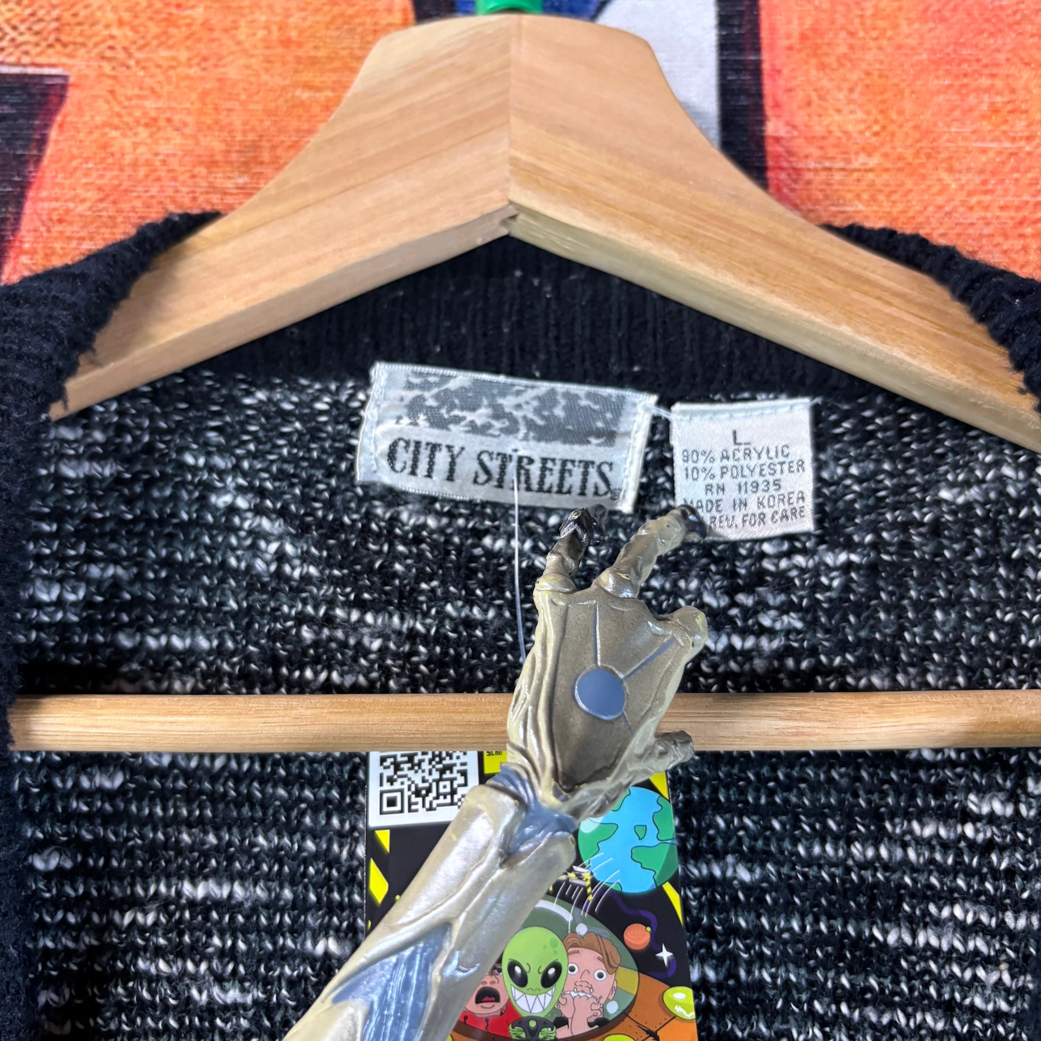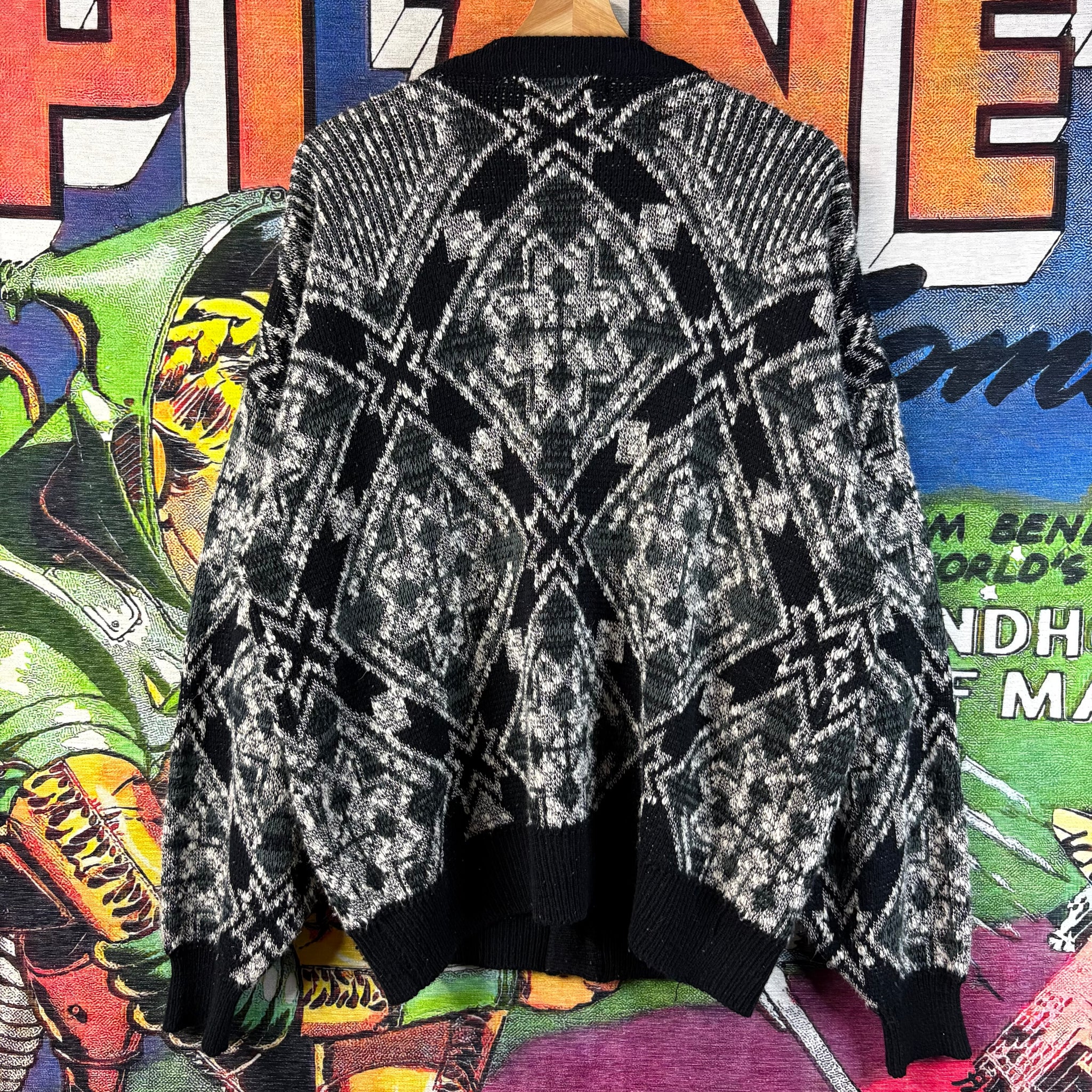 This is an excellent vintage City Streets cardigan featuring a bold, striking black, white, and grey geometric argyle/diamond pattern reminiscent of the sought-after 90s era. The soft, chunky knit with a wide V-neck and simple button closure makes this an instantly eye-catching and cozy throwback piece perfect for layering.