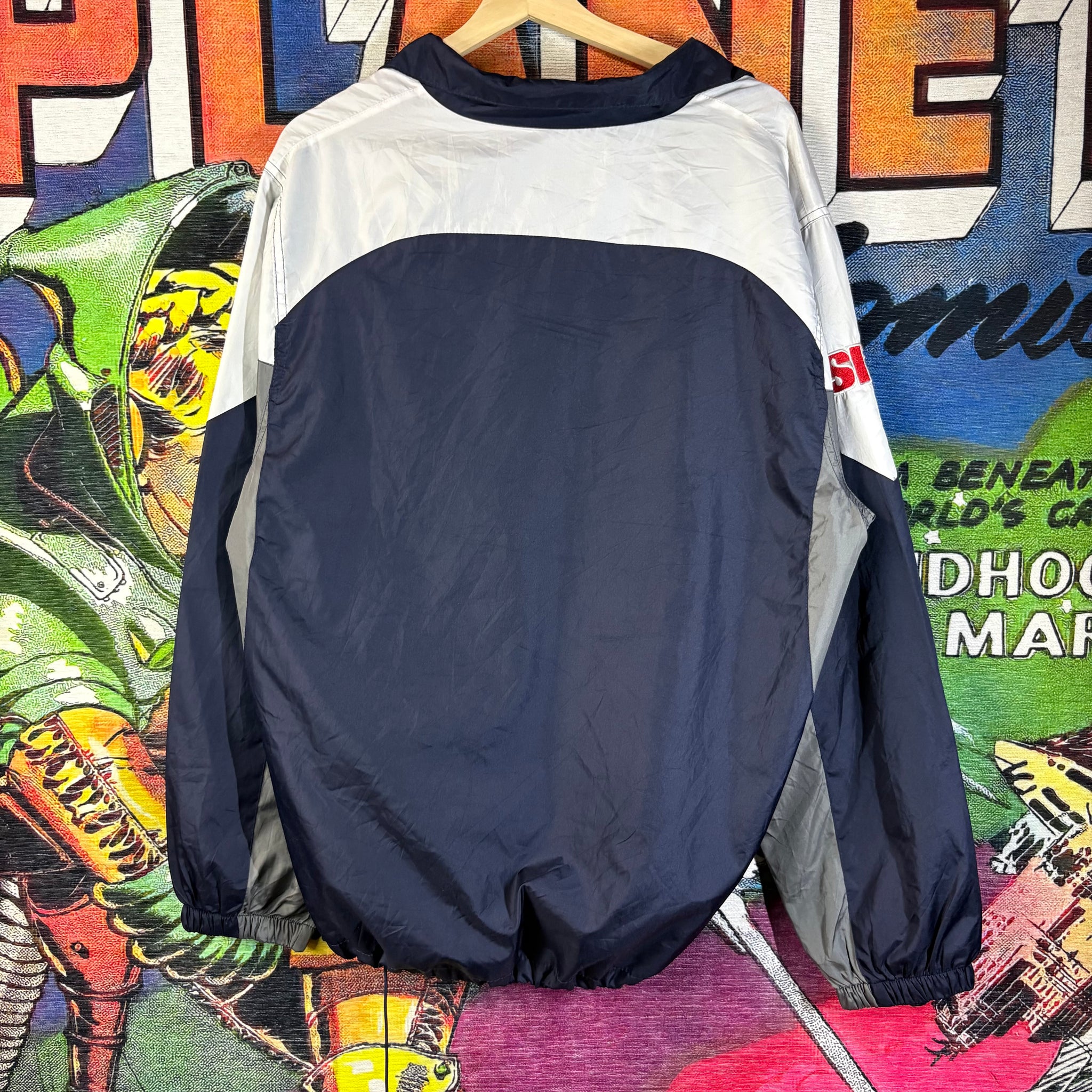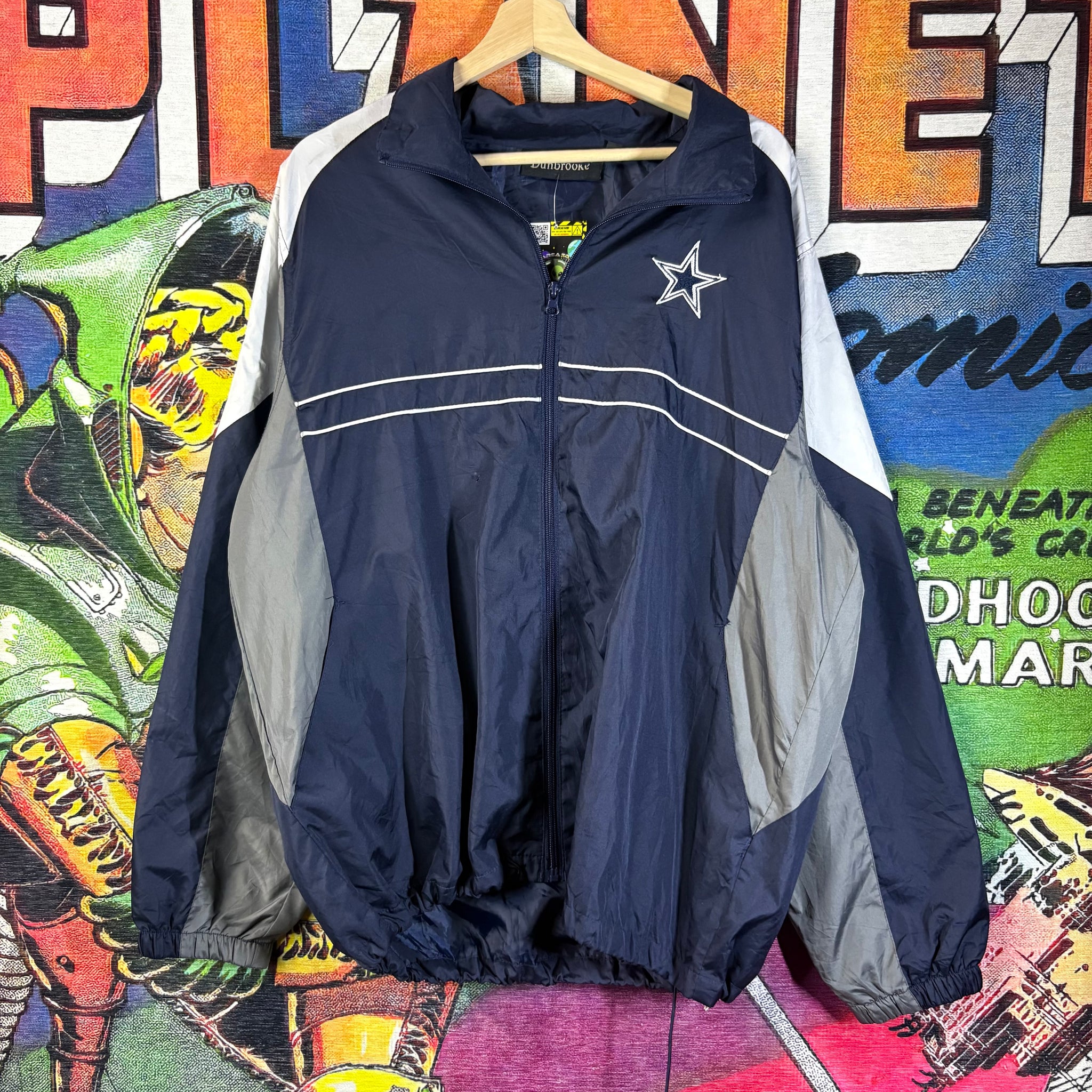This is an eye-catching Dallas Cowboys track jacket from the brand Dunbrooke, featuring a bold, multi-panel color block design in navy blue, white, and grey. The front is accented with two horizontal white stripes and the classic Cowboys Star logo on the chest, making it a perfect piece of vintage outerwear for any dedicated fan.