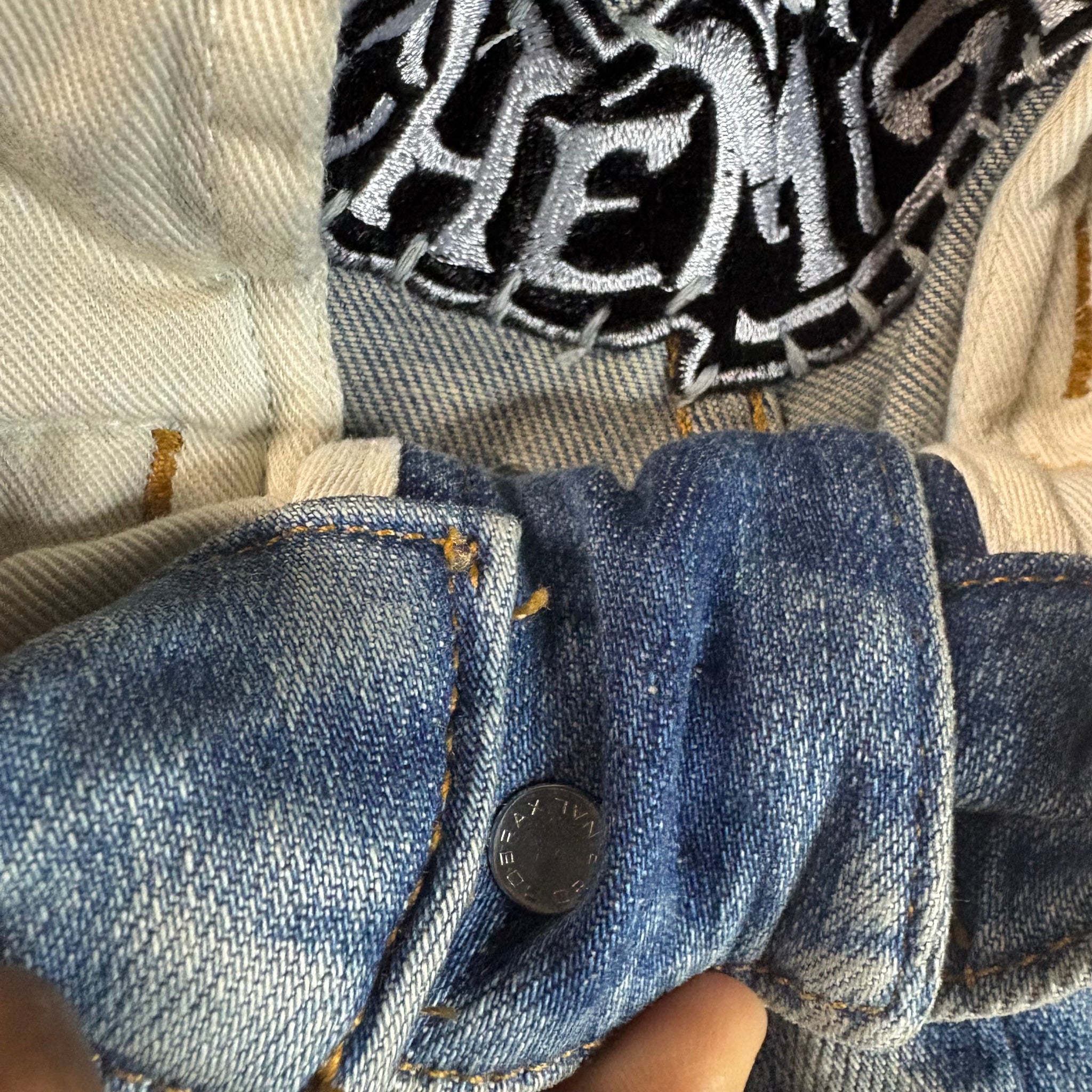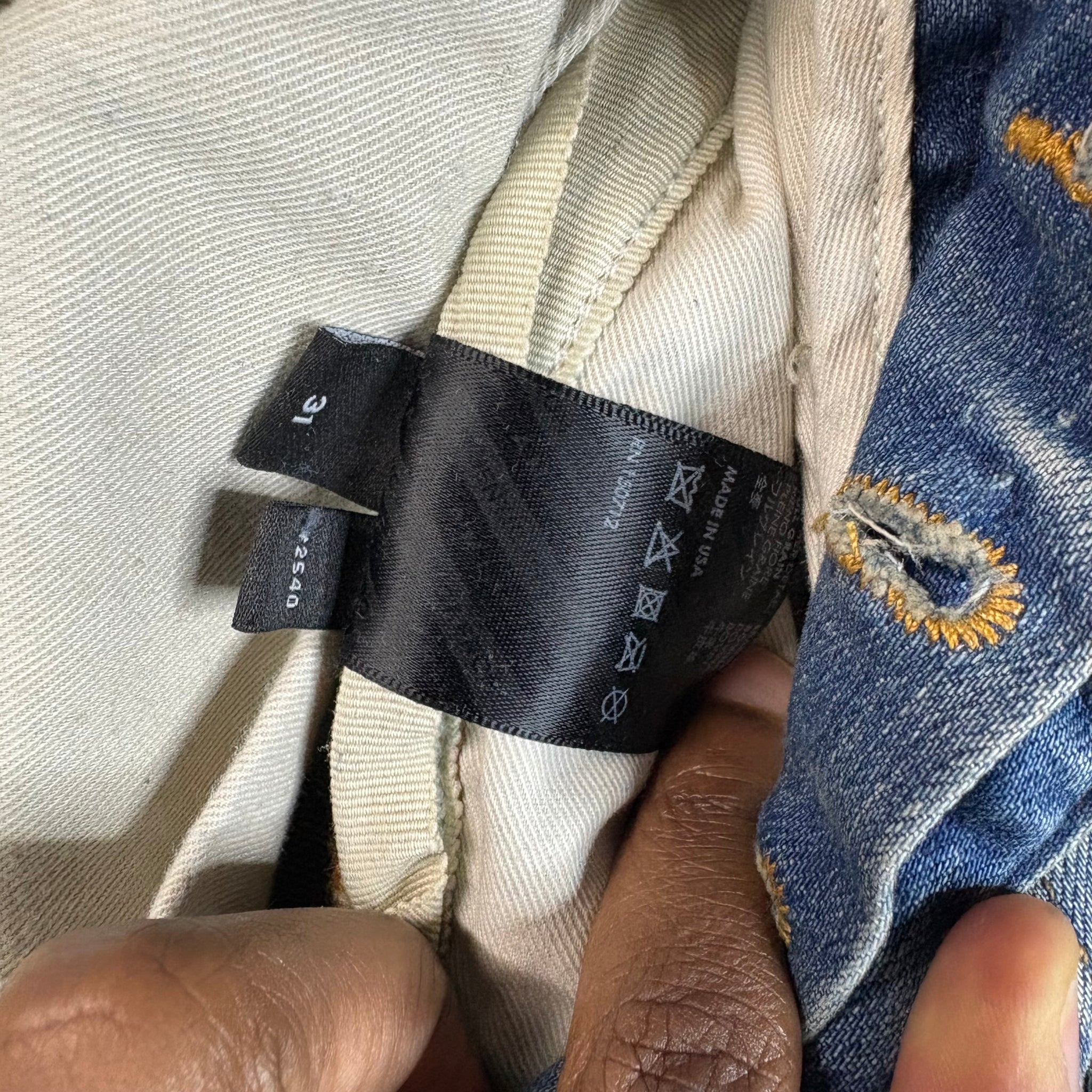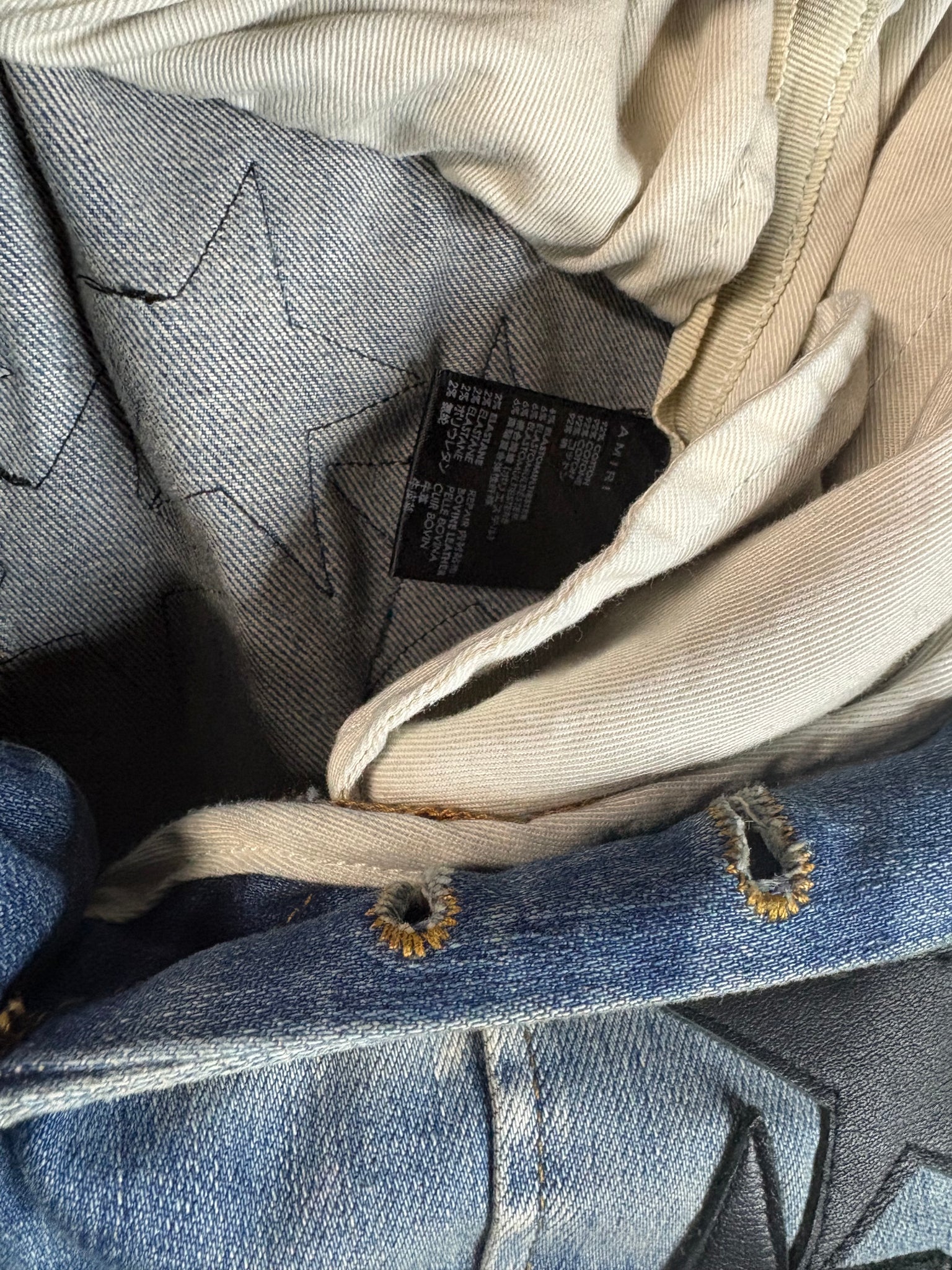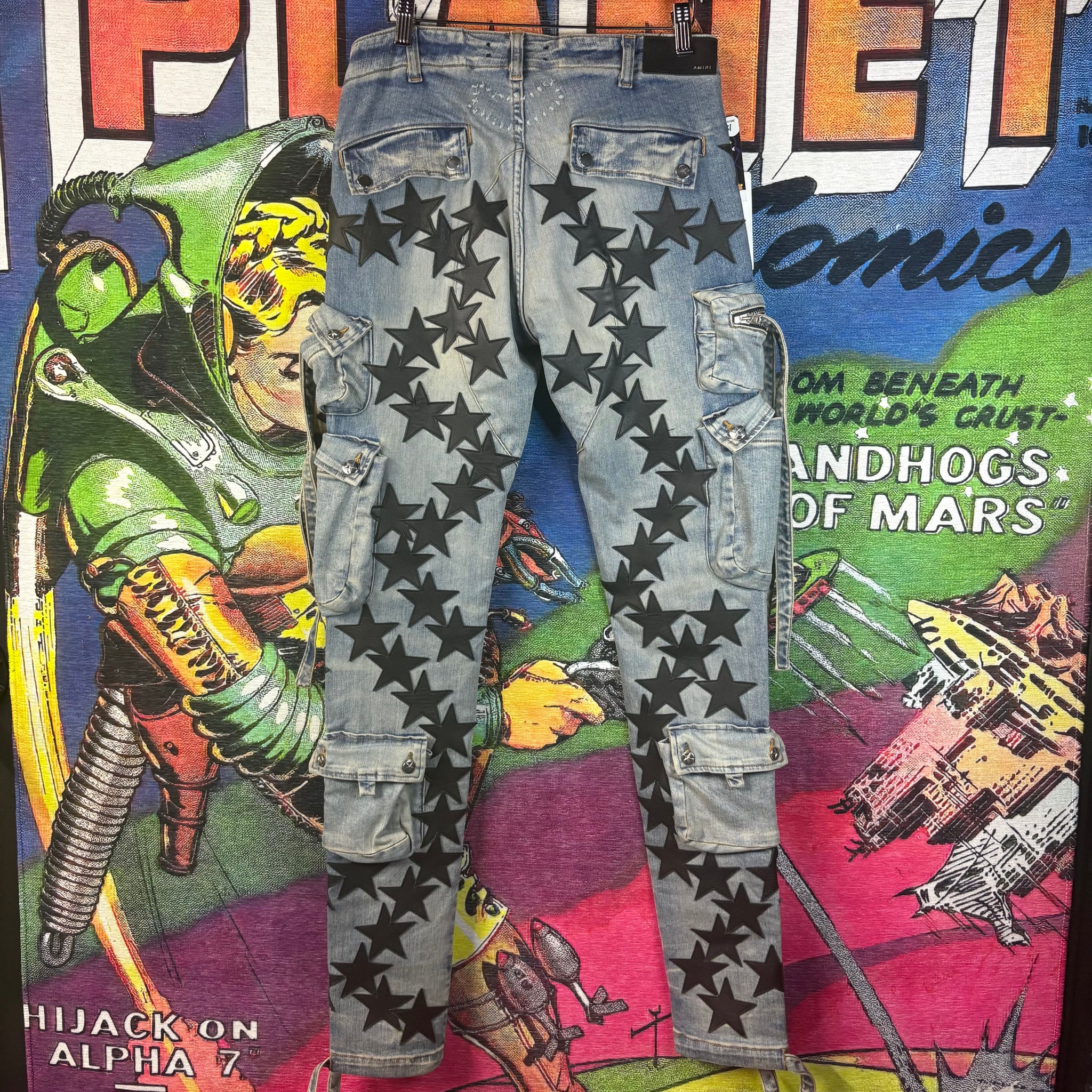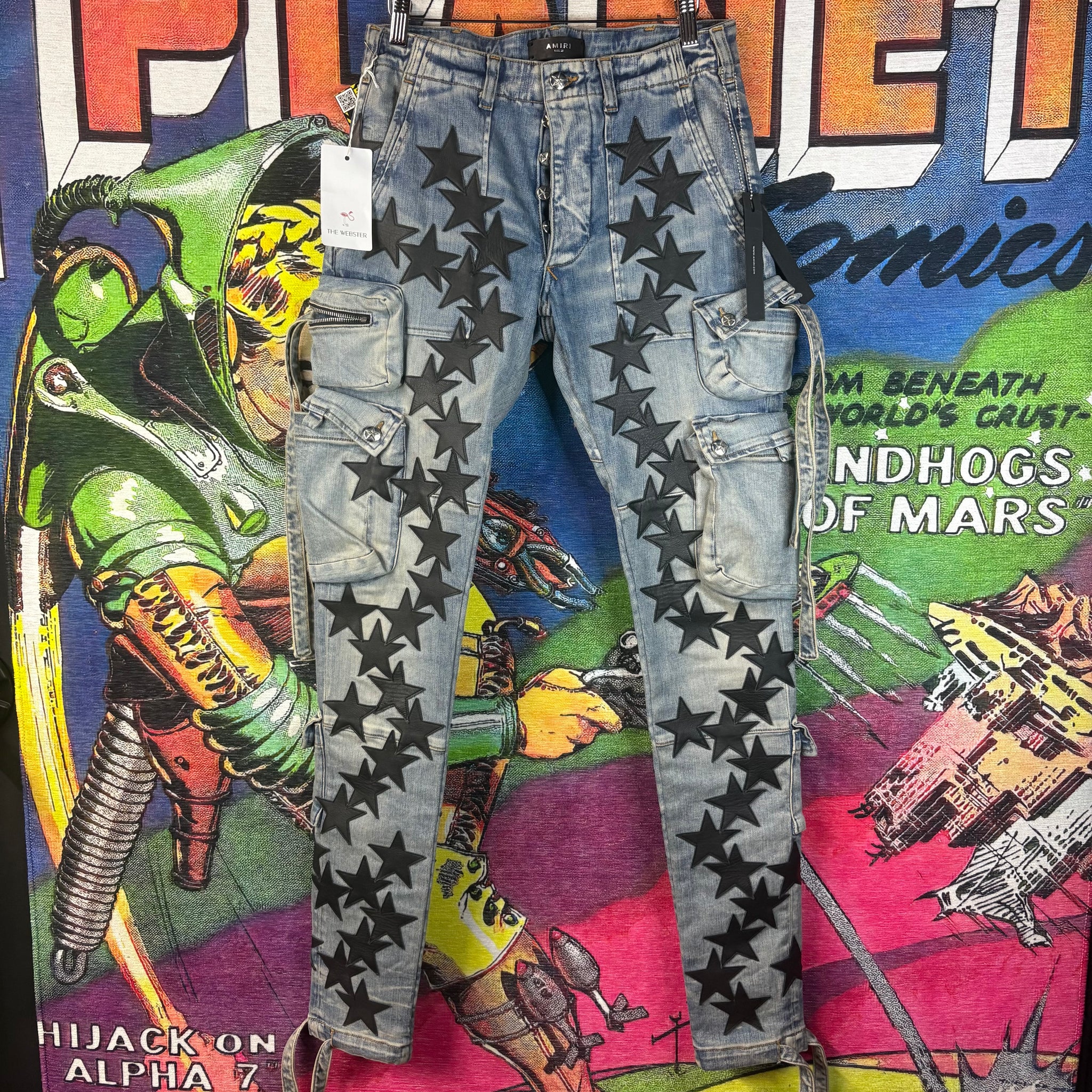These highly distinctive Amiri denim pants feature a light wash with an abundance of stitched-on black star patches covering the front and back for a bold, rock-and-roll aesthetic. Blending utility with high-end streetwear, the jeans boast multiple cargo pockets and zippered details, creating a standout piece that perfectly captures the brand's signature luxury rebel style.