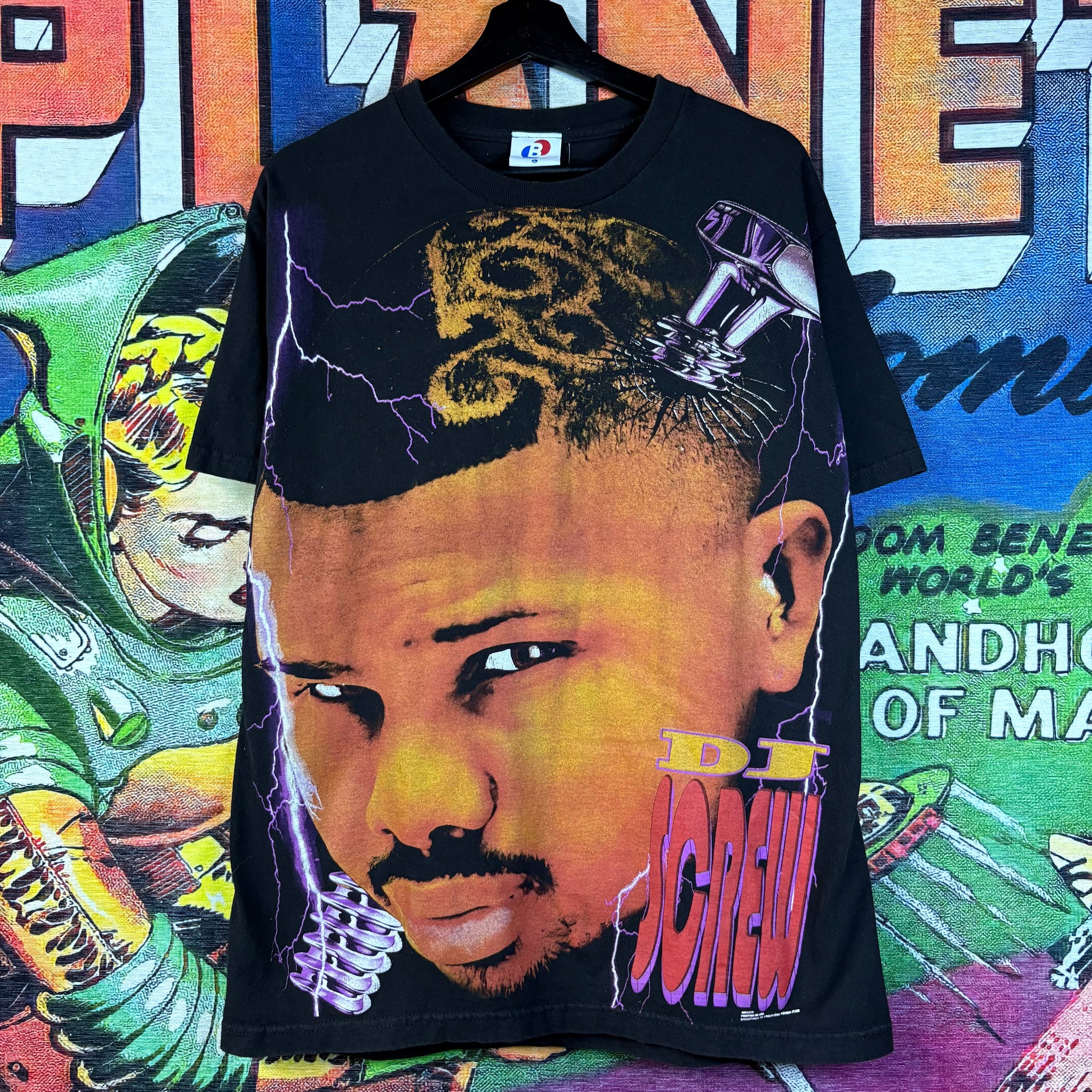 This is an explosive, highly collectible tribute tee to the Houston legend, DJ Screw, and the Screwed Up Click (S.U.C.). The front features a vibrant, almost psychedelic graphic of the artist surrounded by lightning, while the back boasts an elaborate, colorful skull and crossbones motif set against the Houston cityscape, truly capturing the raw, iconic style of Texas hip-hop culture.