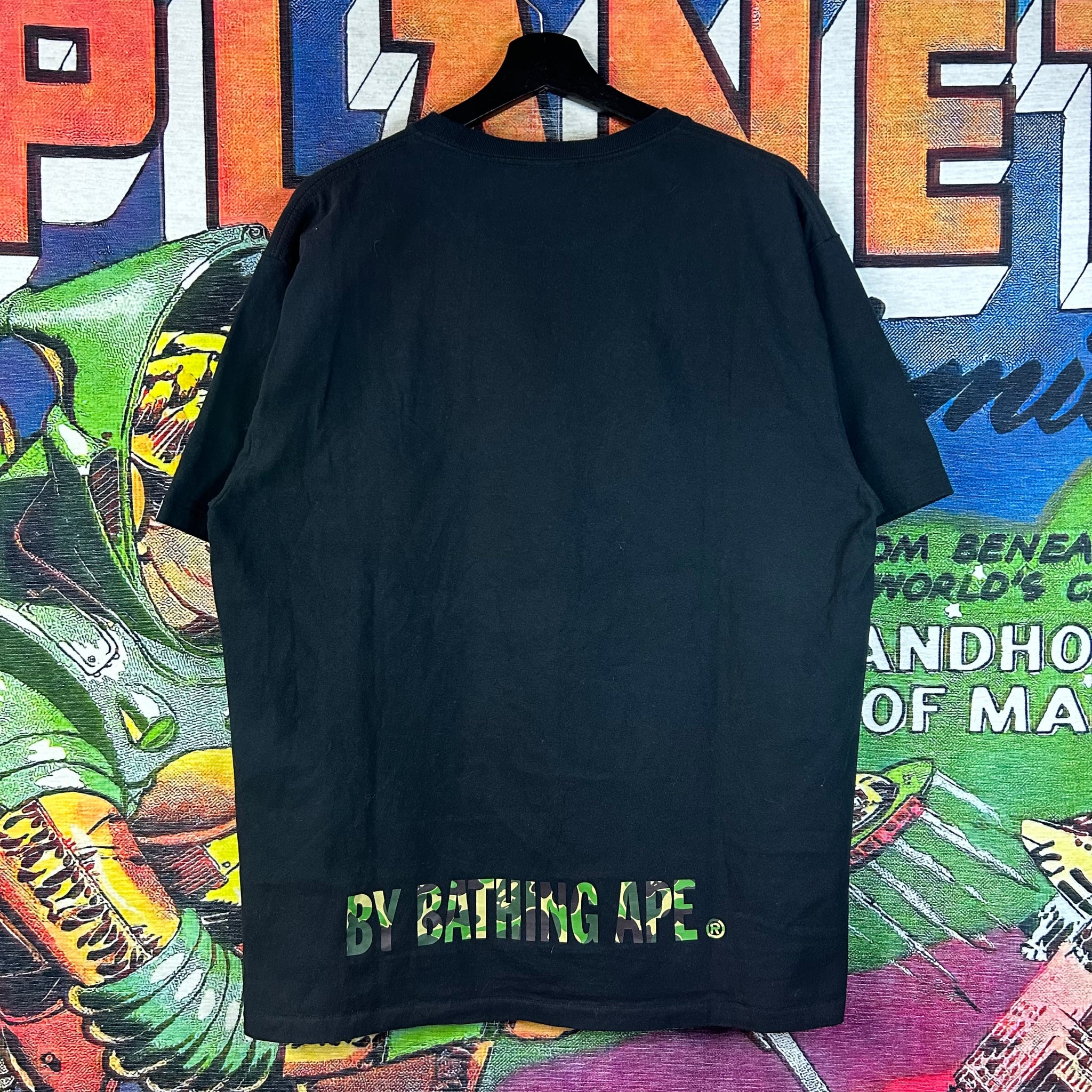 Iconic Bape tee featuring the signature ABC camo face graphic on the front. Made from soft, high-quality cotton, this XL piece has a relaxed fit, making it a standout in any streetwear collection.