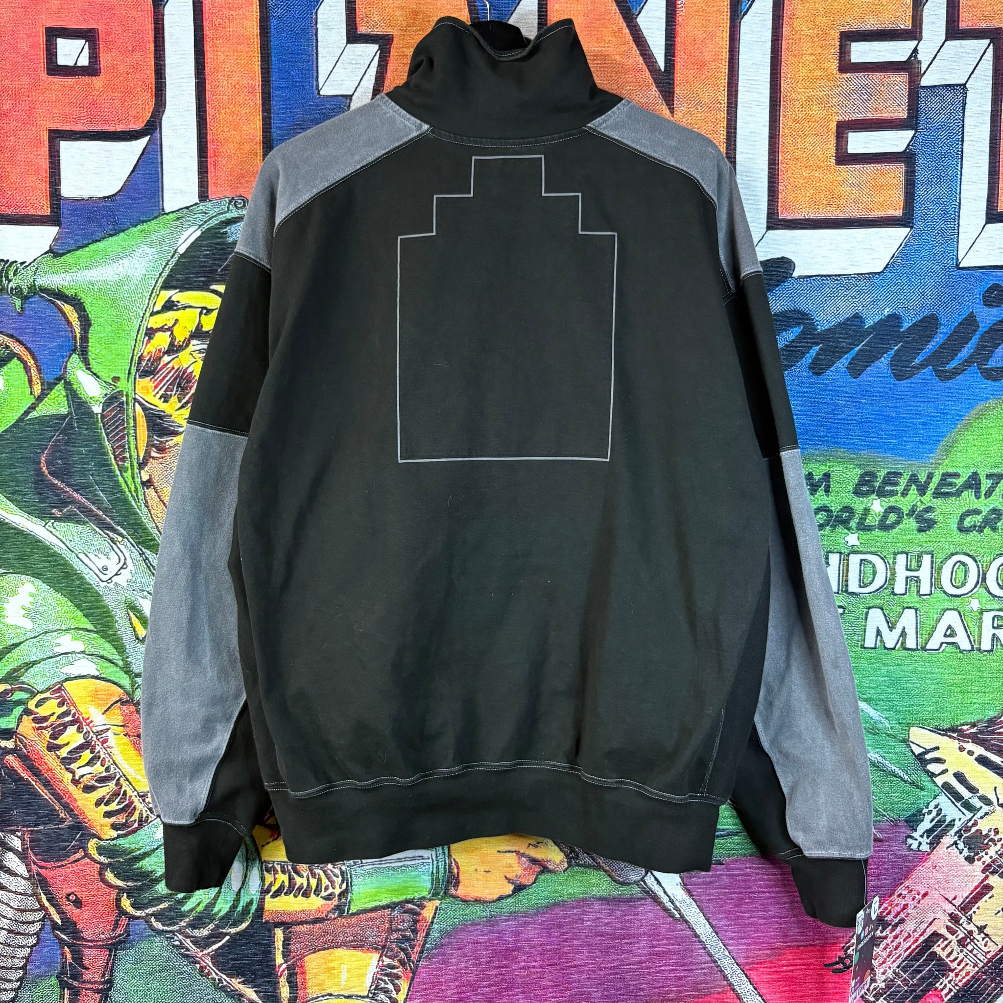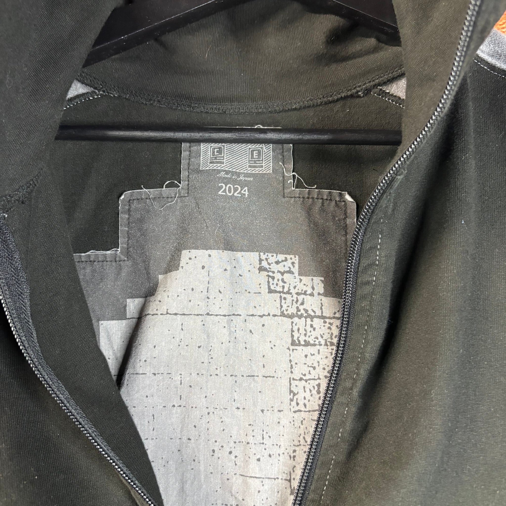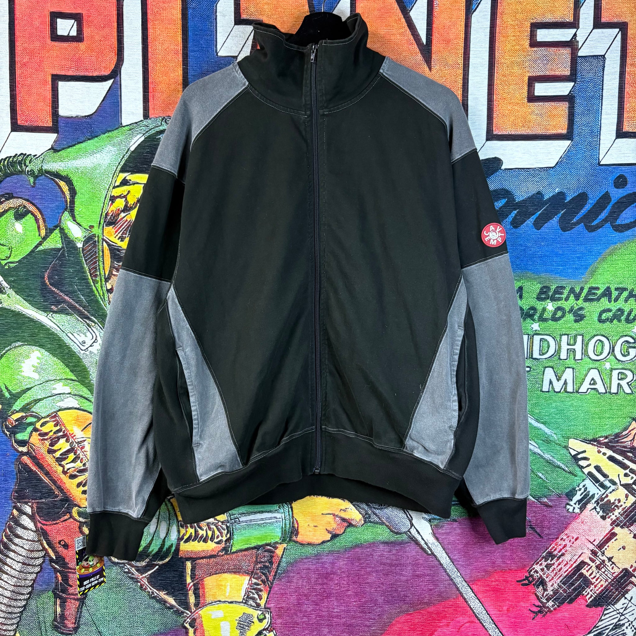 This is a distinctive Cav Empt zip-up jacket featuring a sharp, color-blocked design in black and washed gray panels for a rugged, yet technical aesthetic. It features a high collar, the iconic CE rubber patch on the sleeve, and a subtle pixelated graphic inside the garment, solidifying its status as a piece of desirable, Made in Japan street-wear. This jacket expertly blends utilitarian construction with graphic design elements.