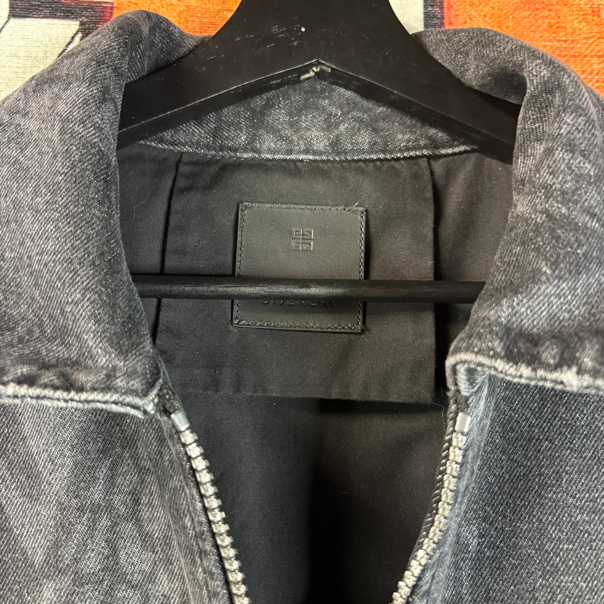 a luxurious Givenchy denim jacket featuring a striking black-on-black dragon motif subtly printed throughout the faded wash. The oversized fit, high-quality silver-tone zipper, and iconic GIVENCHY leather neck patch elevate this piece from standard denim to high-fashion streetwear with an edge.
