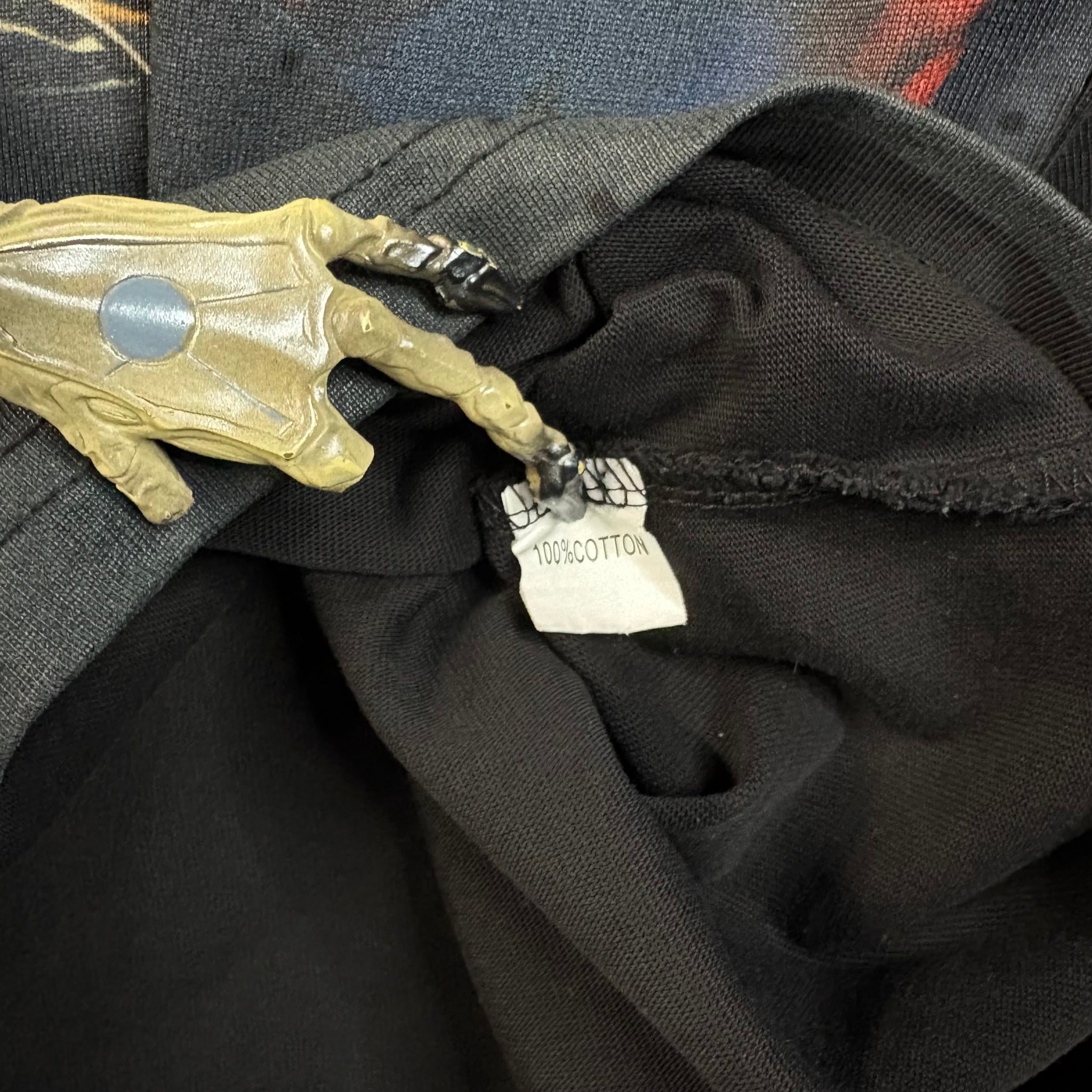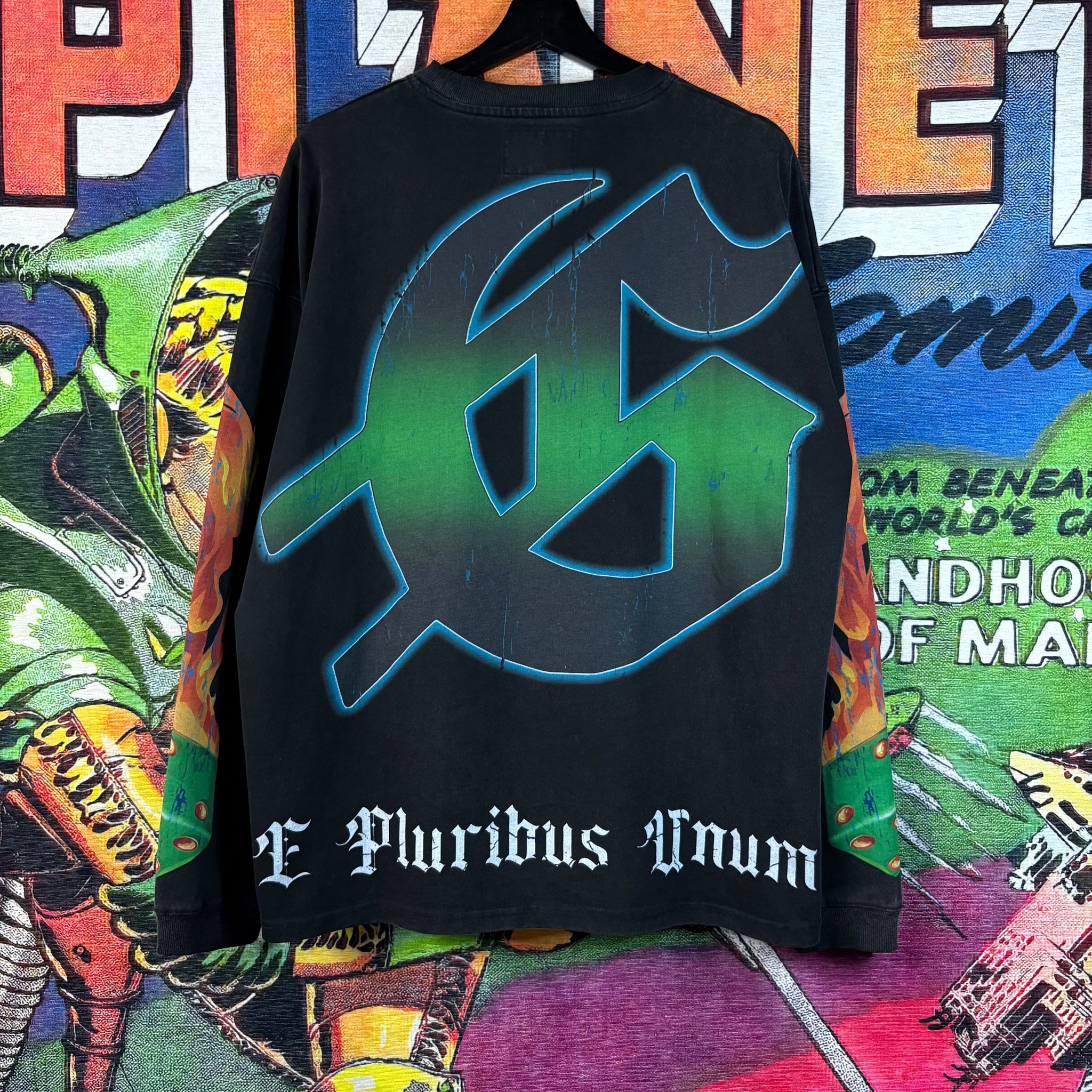 This striking Godspeed Rarity Collection long-sleeve shirt features a macabre graphic of a skeleton in a top hat gambling, surrounded by vibrant flames and dice on the sleeves, embodying a high-stakes, edgy style. The bold design is amplified on the back by a large, glowing green and blue logo above the Latin phrase "E Pluribus Unum," making this a truly distinctive and powerful streetwear piece.