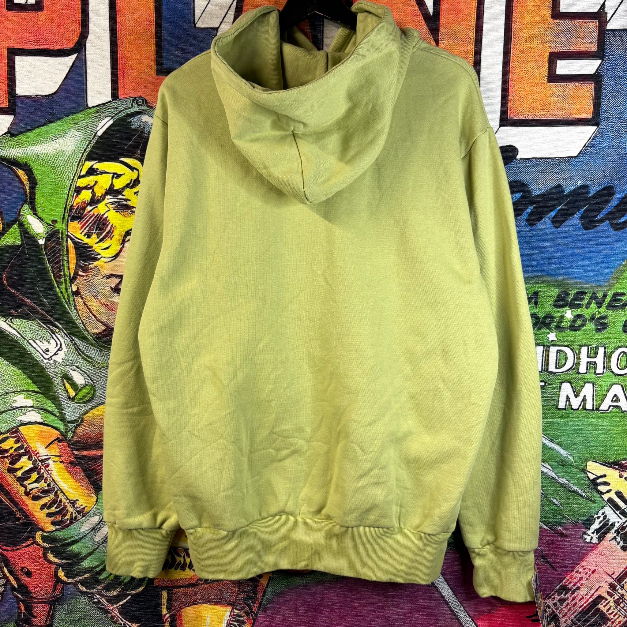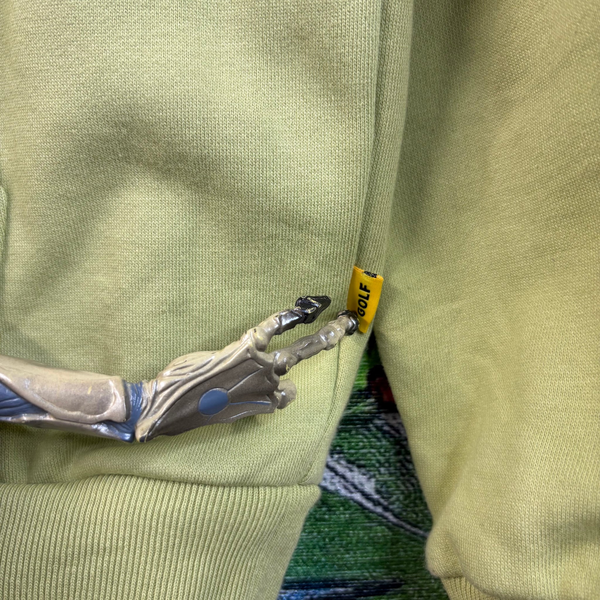 This oversized Golf Wang pullover hoodie comes in a vibrant, distinctive lime green/chartreuse color that is sure to turn heads. The chest features the brand's logo in a unique, block-letter script with a light blue outline, offering a subtle yet stylish contrast to the bold hue.