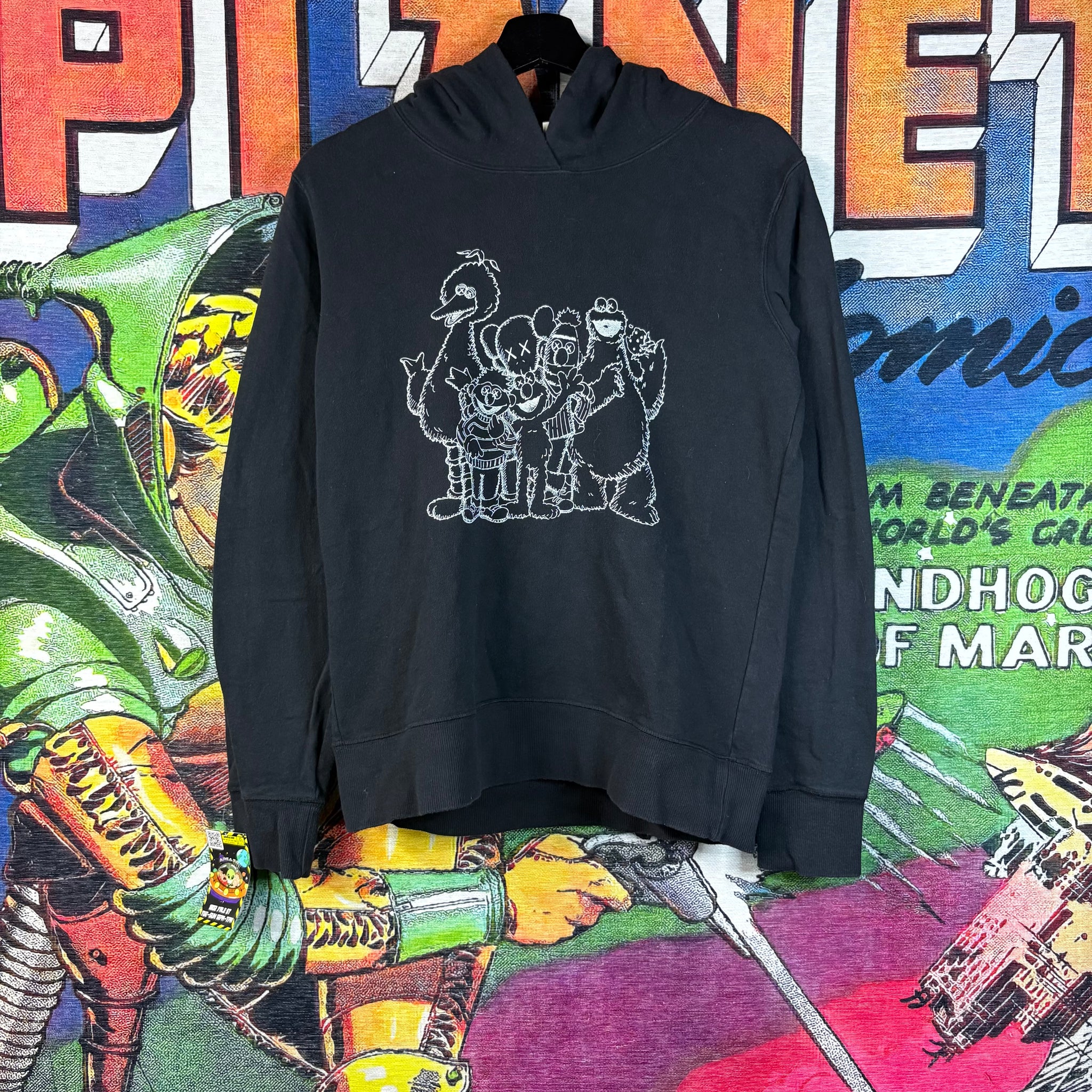 Score an iconic piece of streetwear with this KAWS x Sesame Street x Uniqlo UT black hoodie, featuring a large white outline graphic of the beloved Sesame Street crew—including Big Bird, Elmo, and Cookie Monster—on the front. This highly sought-after collaboration combines celebrated contemporary art with nostalgic characters for a minimalist yet instantly recognizable look.