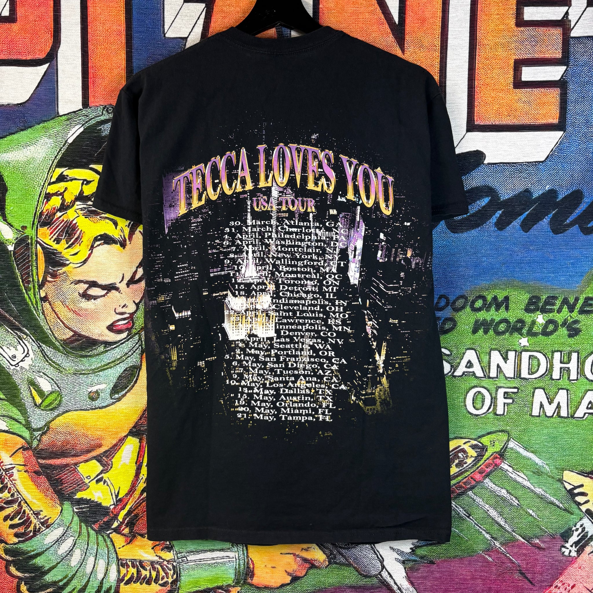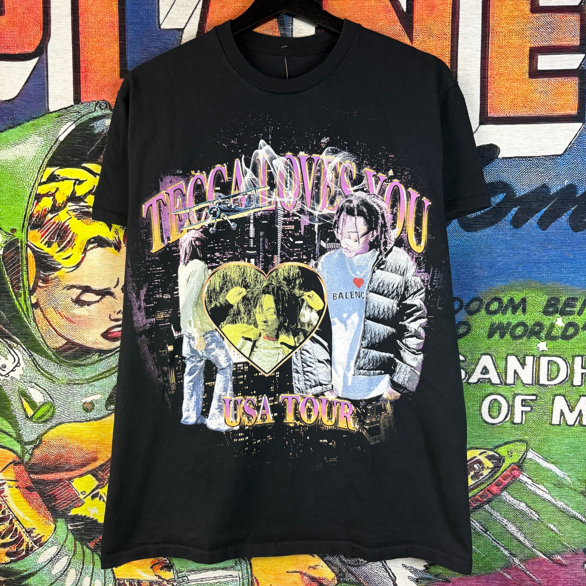This striking Lil Tecca "Tecca Loves You" USA Tour shirt features a vibrant, distressed graphic on the front with the rapper overlaid on a city skyline and a heart-shaped photo collage. The back continues the urban theme and lists the full tour schedule and cities, making this a must-have piece of hip-hop concert merchandise.