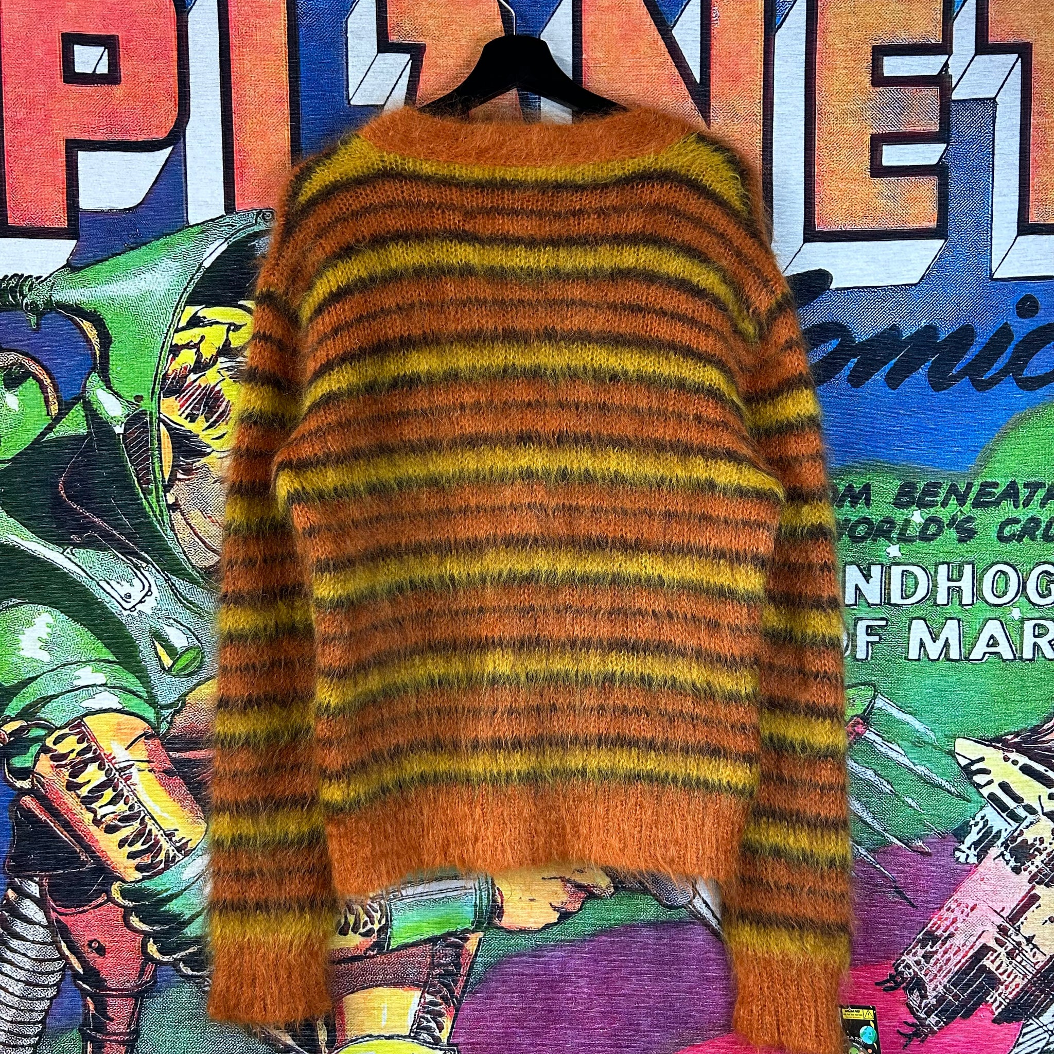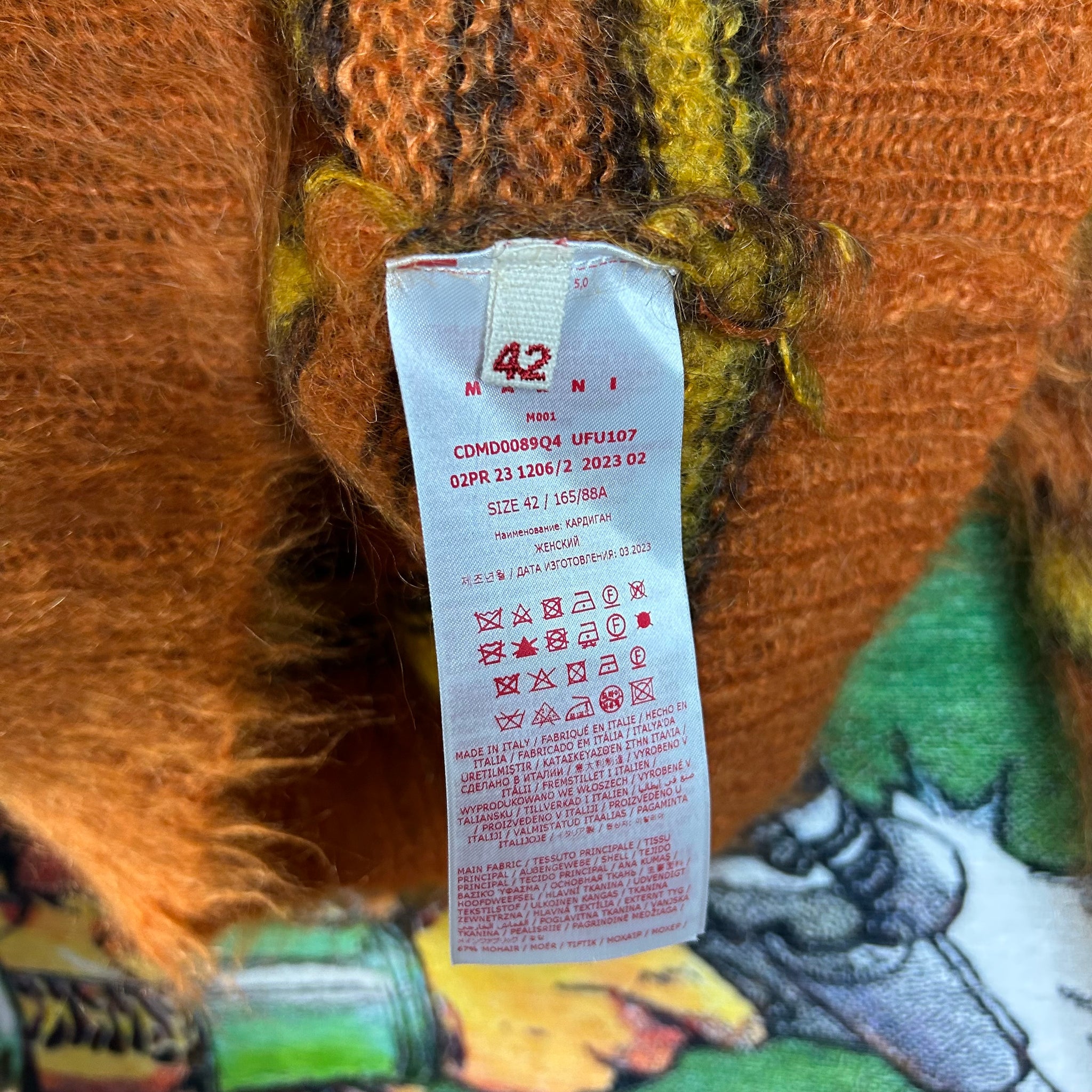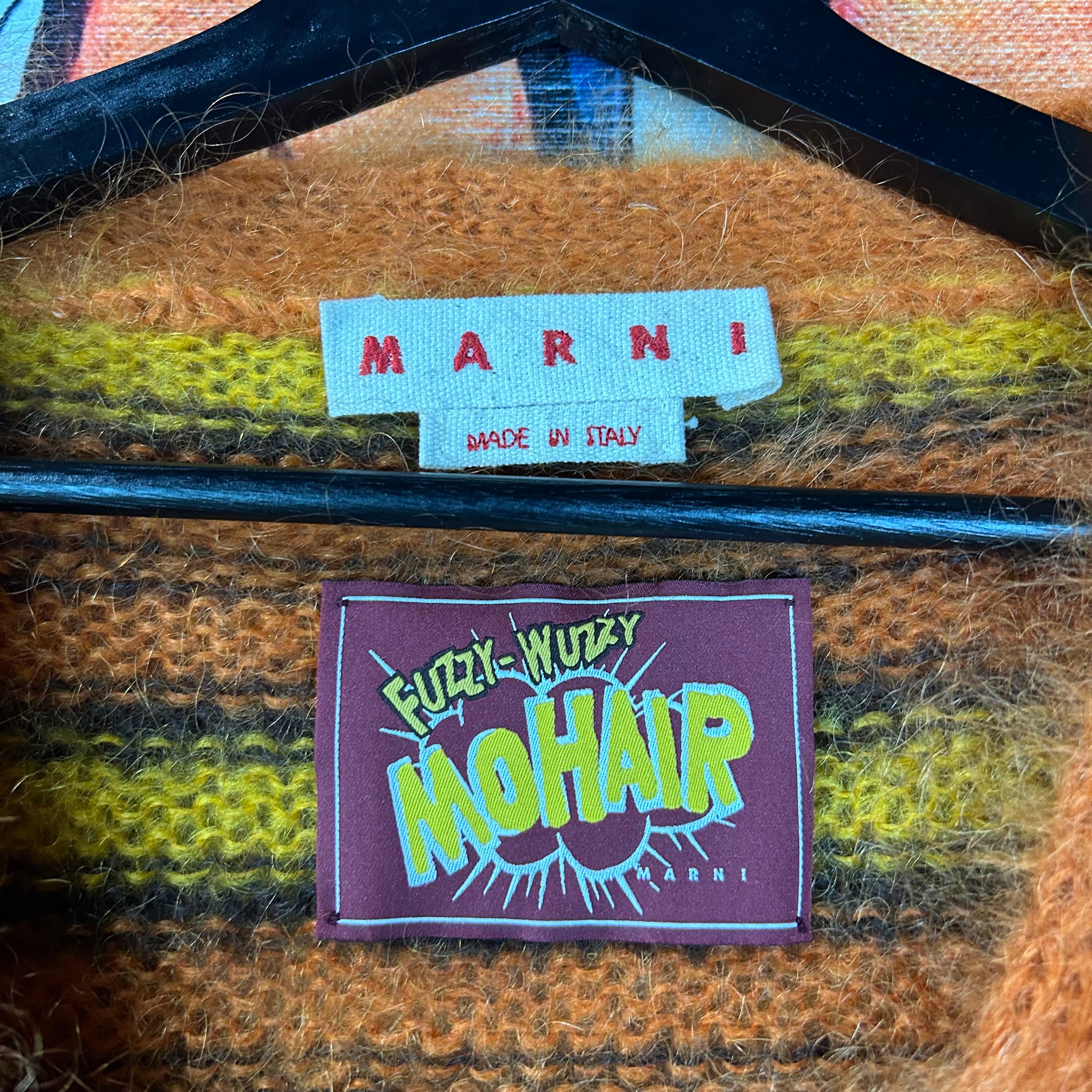 Vibrant and refined, this Marni striped V-neck cardigan showcases the brand’s playful use of color paired with elevated craftsmanship. Featuring bold orange striping and a clean V-neck silhouette, it’s crafted from high-quality mohair fabric that offers both comfort and structure. An easy statement layer that works dressed up or down, perfect for fans of modern luxury with a creative edge.