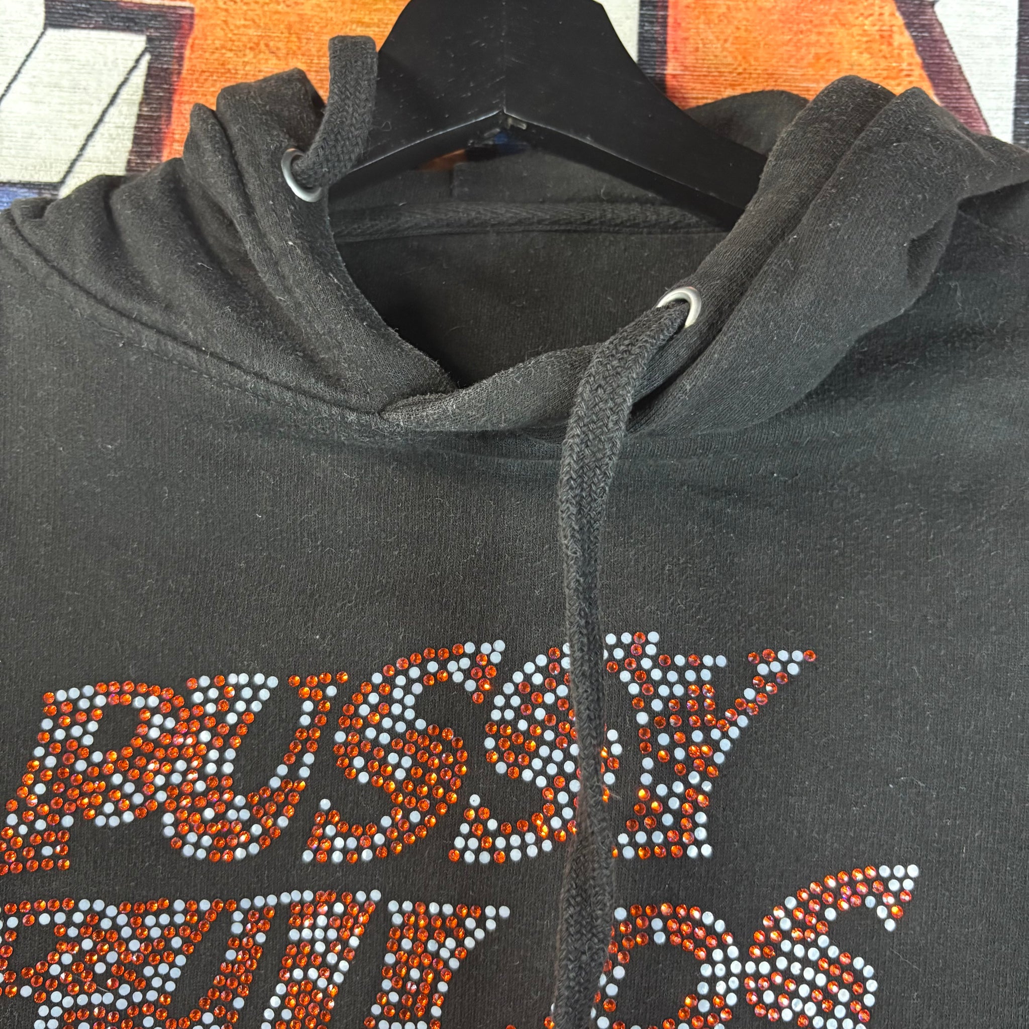 Sparkle with attitude in this bold black hoodie, featuring the memorable phrase "Pussy Builds Strong Bones" spelled out entirely in striking, sparkling orange and silver rhinestones. This pullover is the perfect statement piece, blending cozy fleece comfort with a cheeky, head-turning graphic.