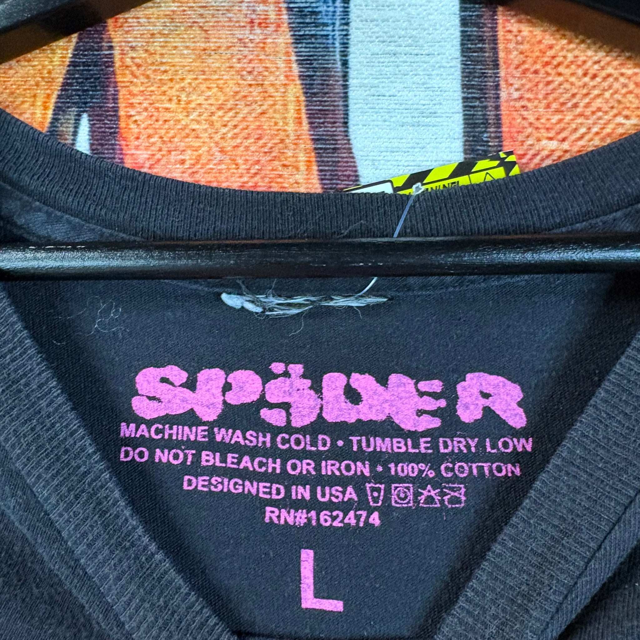 This bold Harley-Davidson collaboration tee features an explosive, vibrant graphic that merges classic Americana with a futuristic, cyberpunk aesthetic. The bright neon pink "Sp5der" branding and large "5" boldly contrast the faded American flag and black background, creating an unmissable, high-impact streetwear look.