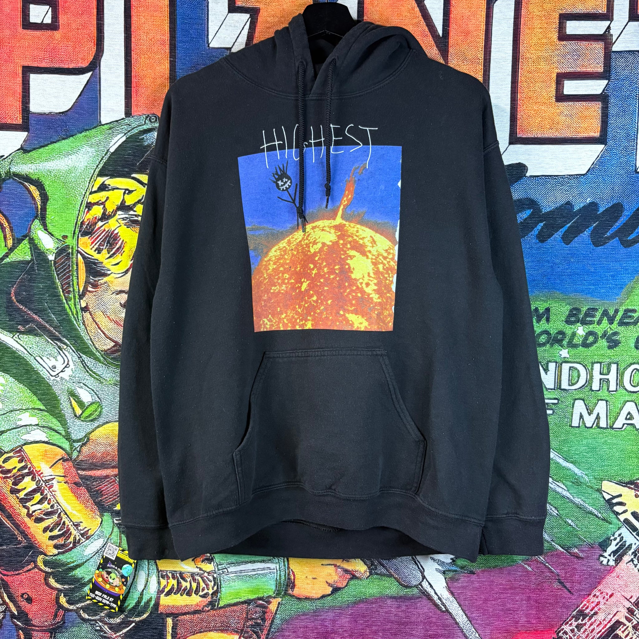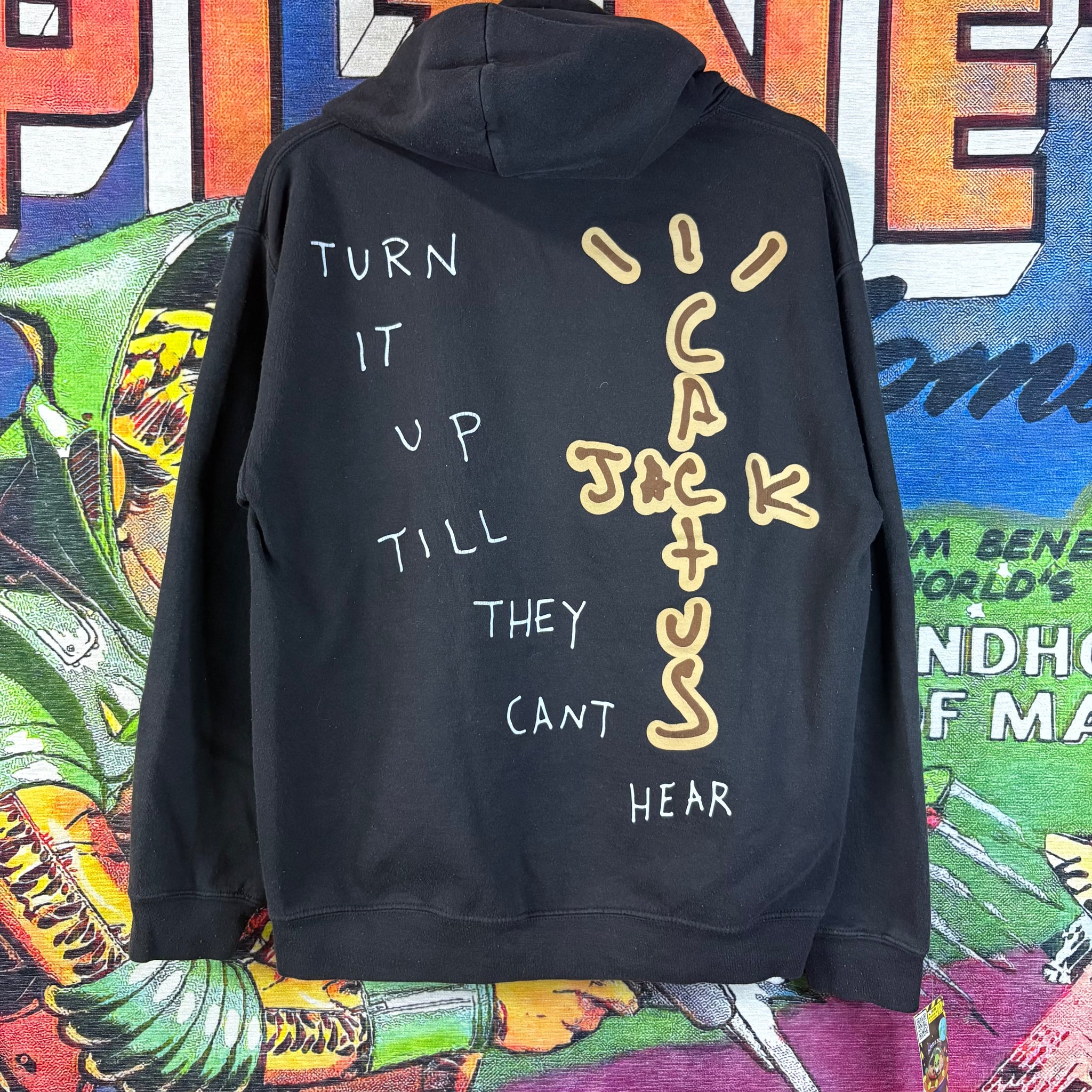 This eye-catching Travis Scott Cactus Jack "Highest" hoodie features a striking graphic of a stick figure on a fiery sun beneath the hand-drawn word "HIGHEST" on the front. The back is just as bold, displaying a large Cactus Jack cross logo alongside the phrase "TURN IT UP TILL THEY CANT HEAR," making this an unmistakable piece of artist merchandise.