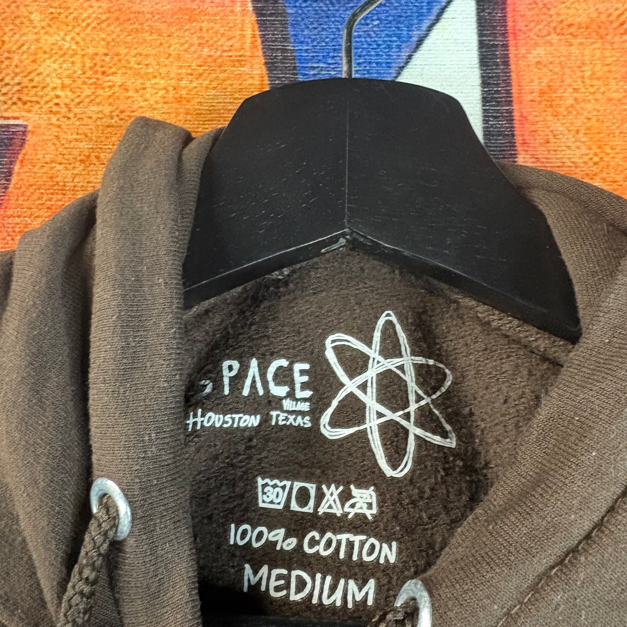 Step out in this vintage-inspired Space Village Houston Texas hoodie in a rich brown color, featuring a striking neon-yellow graphic of a stylized atomic or molecular symbol on the back that demands attention. The front is kept clean with a smaller matching yellow graphic centered on the chest, making this an effortlessly cool and unique piece of Houston street-wear.