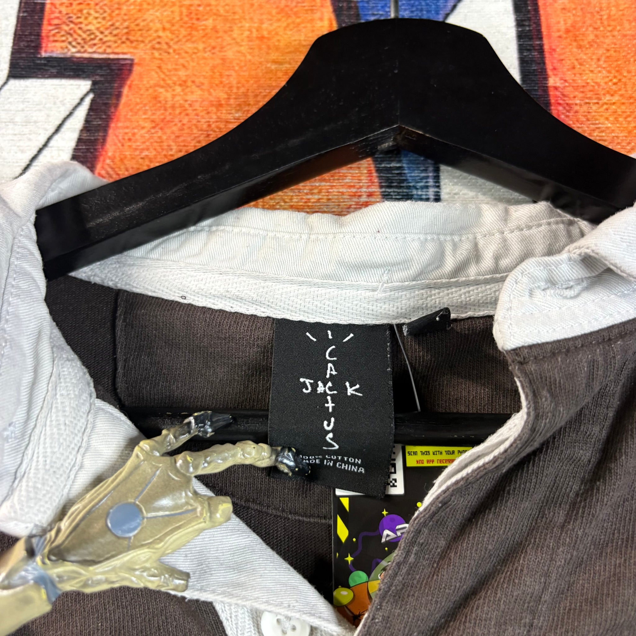 Drop jaws in this highly coveted Travis Scott Cactus Jack long-sleeve rugby shirt, featuring a classic brown and bright red stripe design that gives it a rugged, vintage athletic look. The iconic small yellow Cactus Jack logo is embroidered on the chest, adding an exclusive, subtle flex that speaks volumes to those in the know. This heavy-duty, collared pullover is perfect for adding an instant, elevated edge to your rotation.