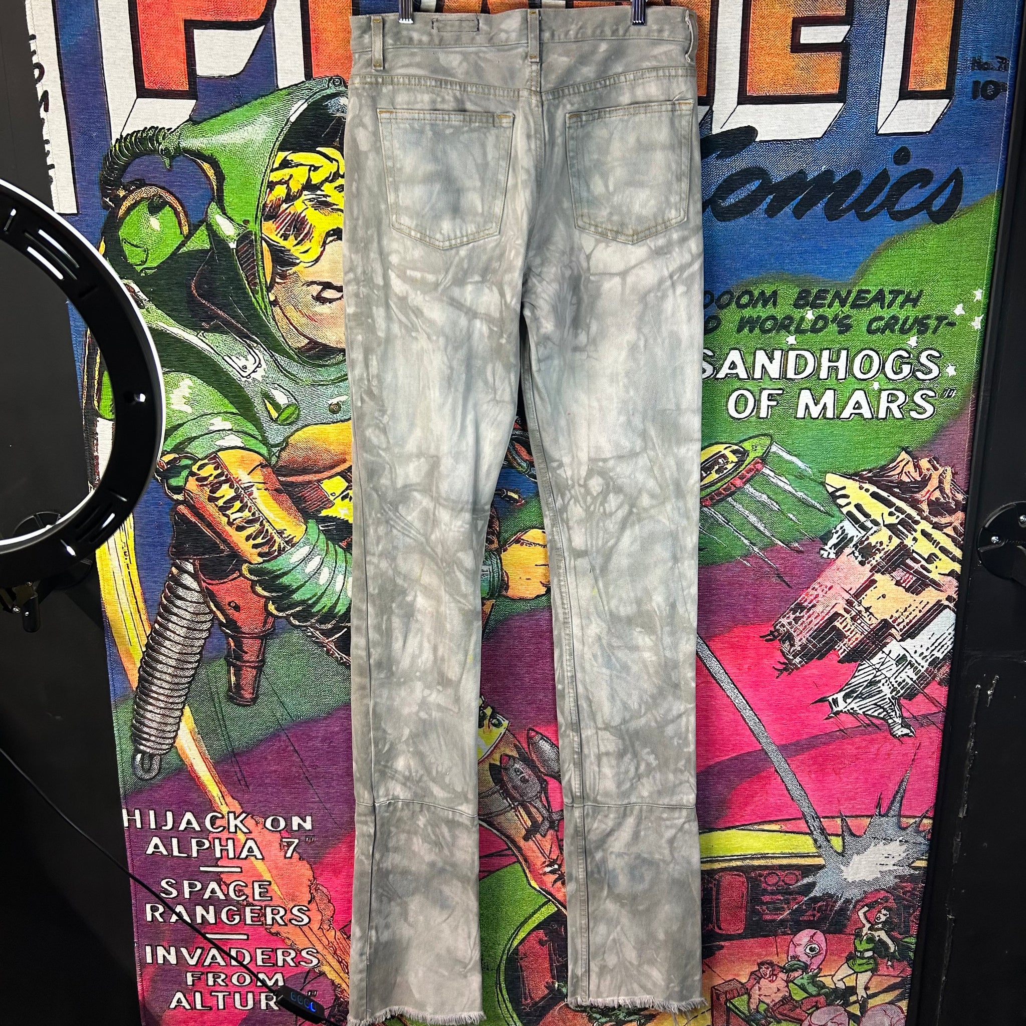 Vale Lives Forever jeans featuring a washed finish with an exaggerated stacked silhouette. Designed with extended length for heavy stacking and a modern streetwear look. All flaws if any shown in photos.