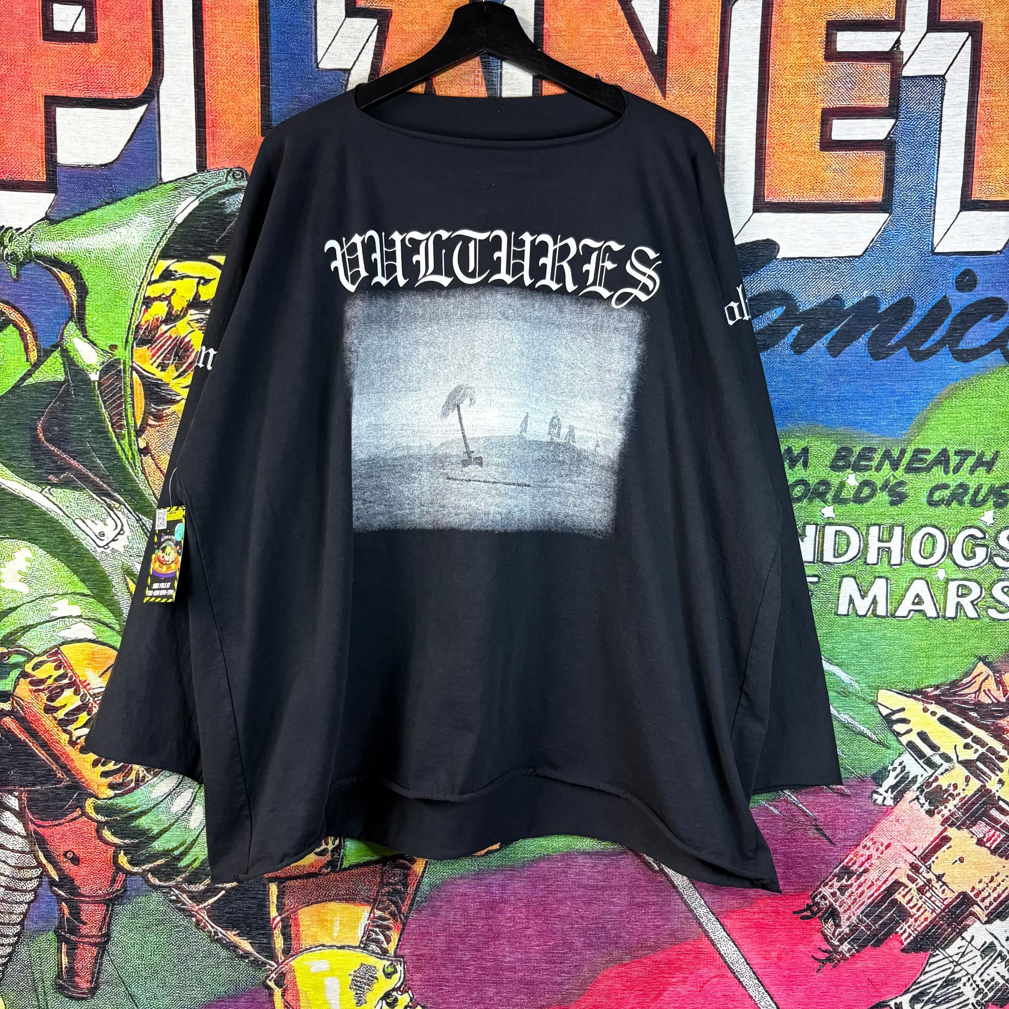 This oversized black Vultures long sleeve captures dark artistry with a haunting desert print and gothic lettering that demands attention. The back features a striking vertical tracklist, giving off pure tour-merch energy and underground edge. Perfect for anyone who thrives in the shadows but dresses like a statement.