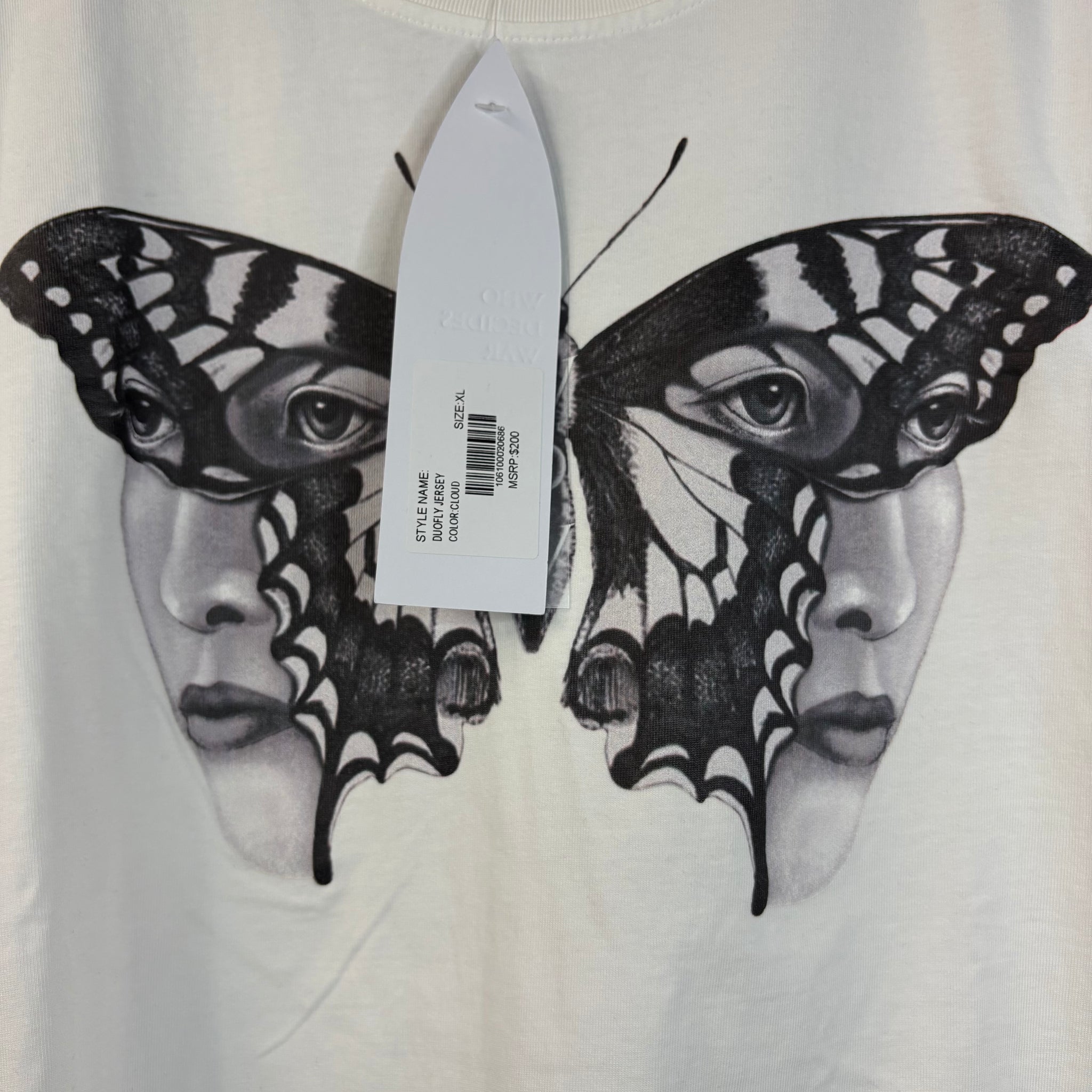 This tee features a captivating, surreal butterfly graphic on the chest, where the wings are subtly formed by two partial human faces with dramatic, artistic makeup. The bold black-and-white print creates a striking, conversation-starting piece that masterfully merges nature's elegance with human complexity.