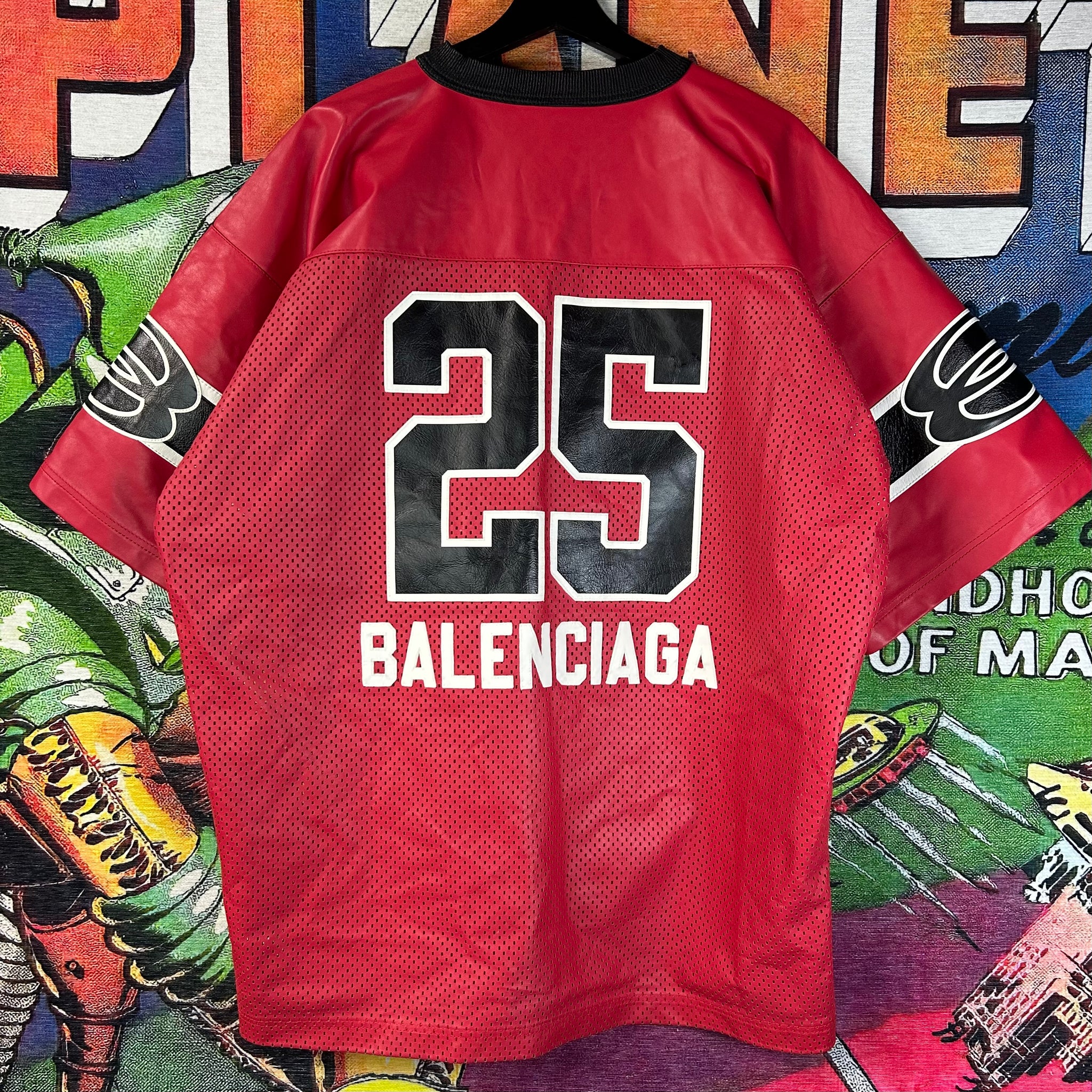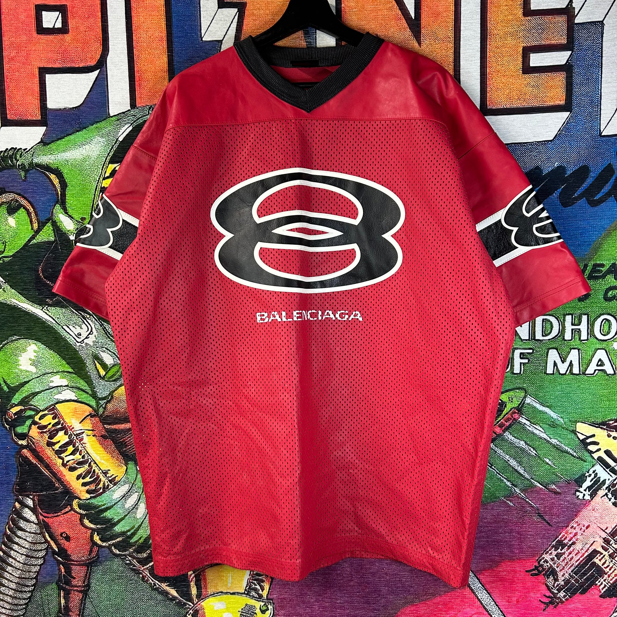 An ultra-rare and luxurious statement piece from Balenciaga, this leather football jersey reimagines classic sportswear through a high-fashion lens. Crafted from premium leather, it features an oversized, structured silhouette with bold jersey-inspired detailing. Worn only once, this piece is in excellent condition and stands out as a true collector’s item. Originally retailing for $5,590, it represents Balenciaga’s elevated approach to contemporary luxury and streetwear fusion.