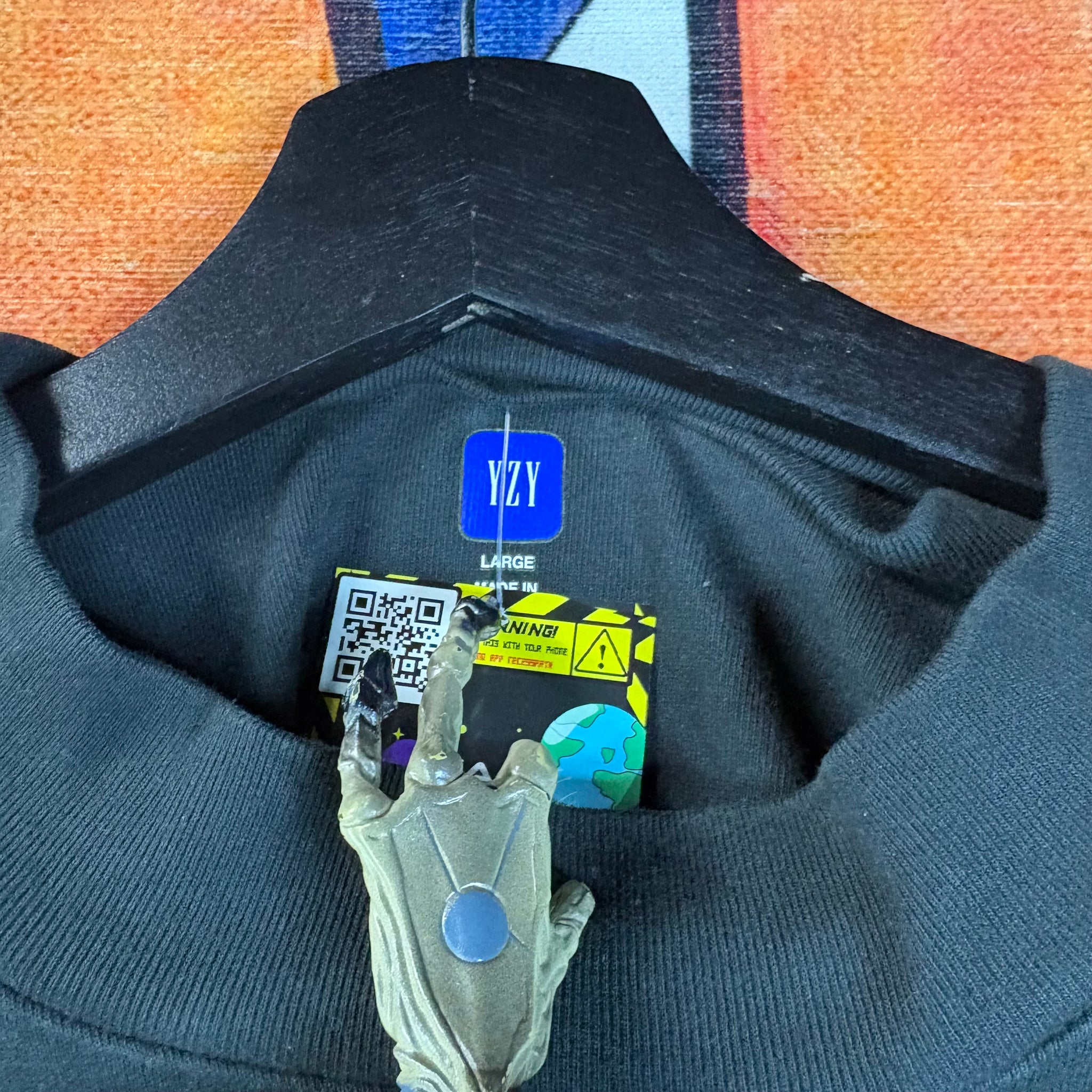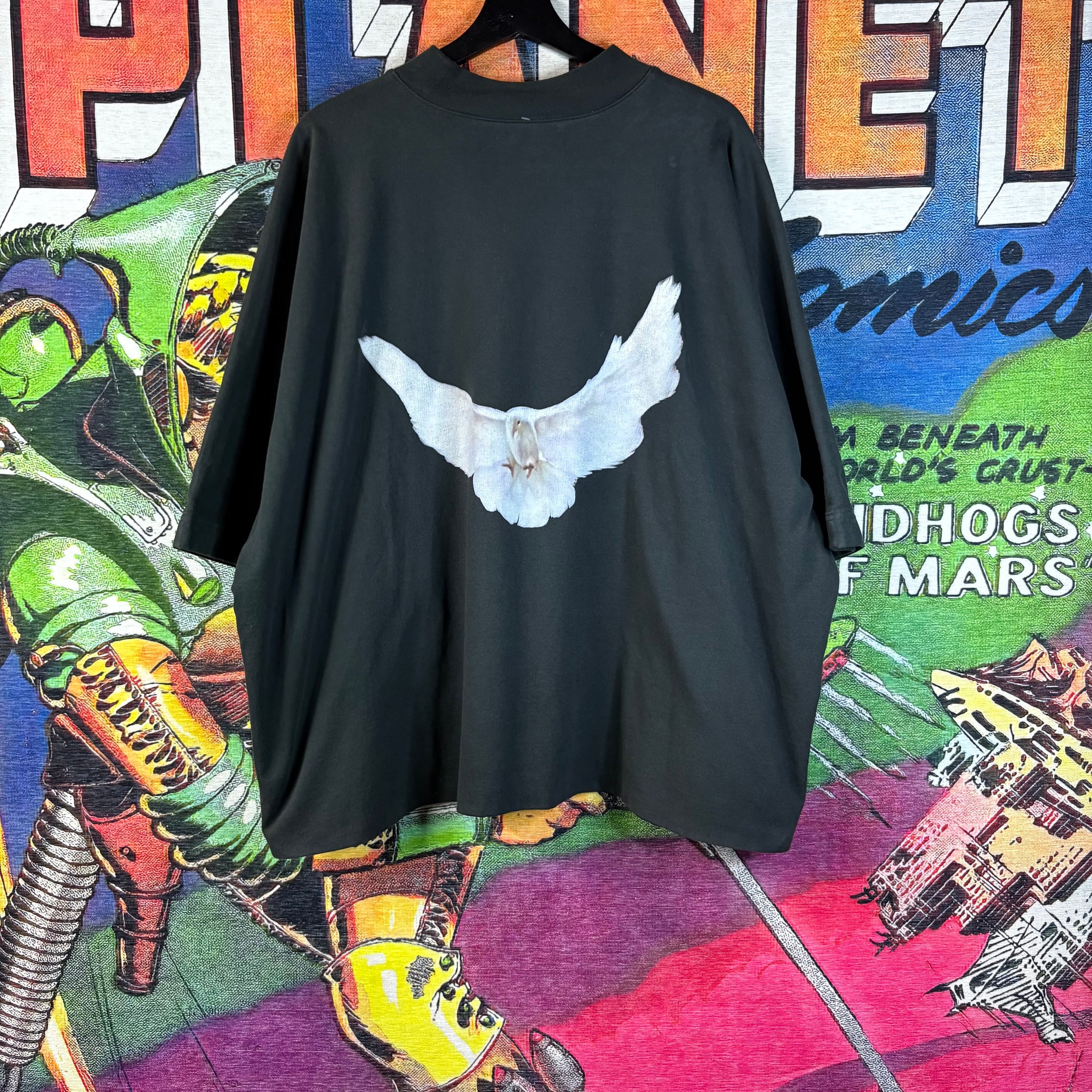 This highly sought-after Yeezy Gap Engineered by Balenciaga Dove T-Shirt features a dramatic, oversized, boxy fit and a thick, high mock-neck collar for a distinct modern silhouette. The back is anchored by a striking, ethereal graphic of a white dove in flight, making this black tee a powerful piece of contemporary streetwear.