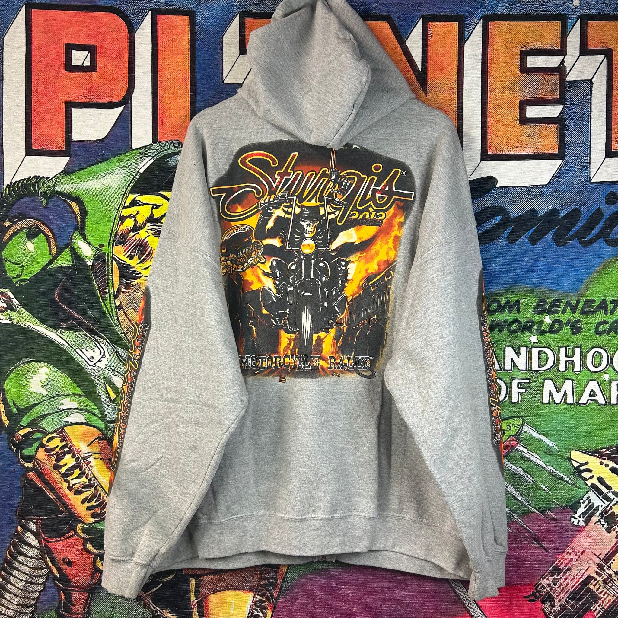 Rugged and unmistakably biker-inspired, this 2012 Sturgis Motorcycle Rally zip up hoodie features bold skeleton graphics that capture the raw energy of the legendary rally. Made for comfort and durability, it offers a relaxed fit with a full zip front, making it perfect for layering or everyday wear. A standout piece for motorcycle enthusiasts, rally collectors, or anyone into classic American biker style.