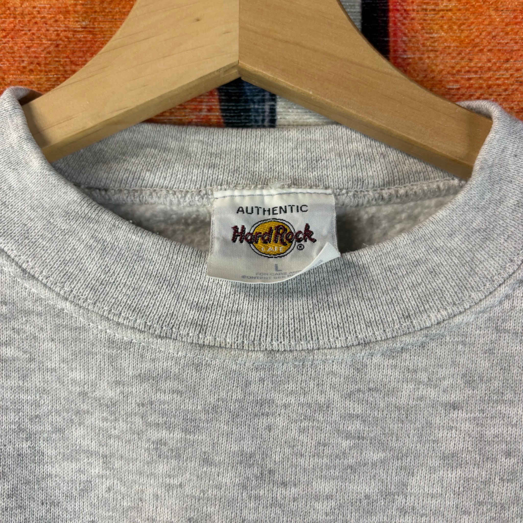 This is a cozy vintage Hard Rock Cafe Denver sweatshirt in a classic heather gray, perfect for authentic '90s streetwear style. It features the subtle Denver logo on the chest and the large, distressed oval graphic prominently across the back, making it a great find for collectors of international rock memorabilia.