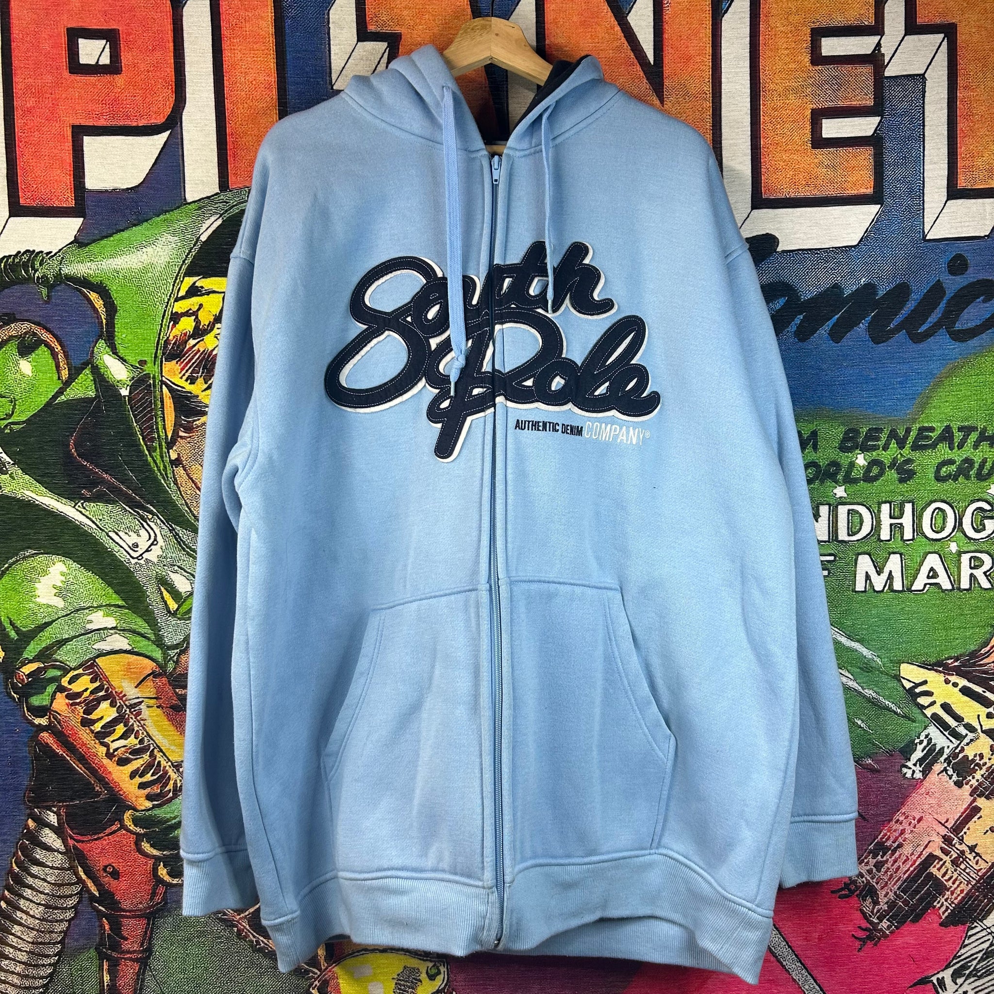 A true early-2000s staple, this Southpole Authentic denim zip-up hoodie captures classic Y2K streetwear style. Featuring a baby blue washed denim exterior, full zip front, and relaxed oversized fit, it blends rugged denim construction with casual hoodie comfort. A standout throwback piece that pairs perfectly with baggy jeans or cargos for a full Y2K look.