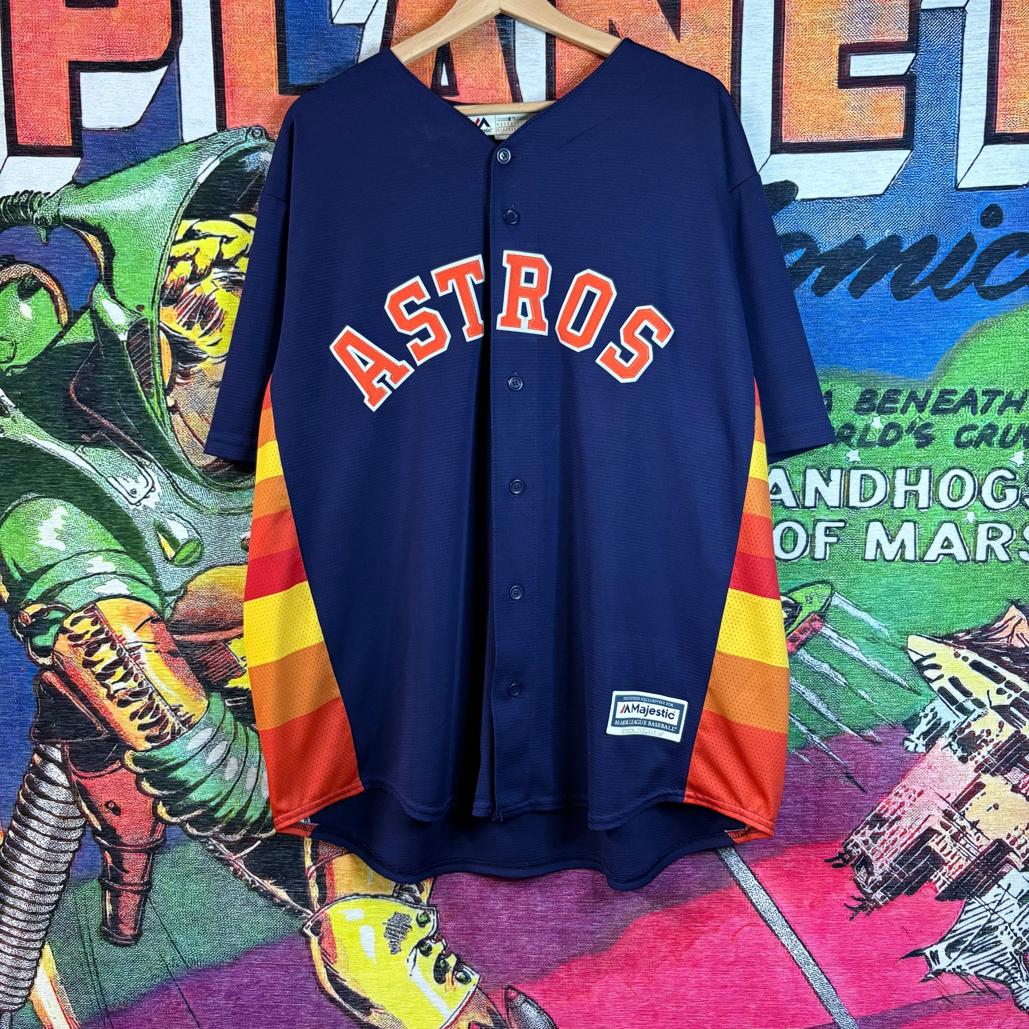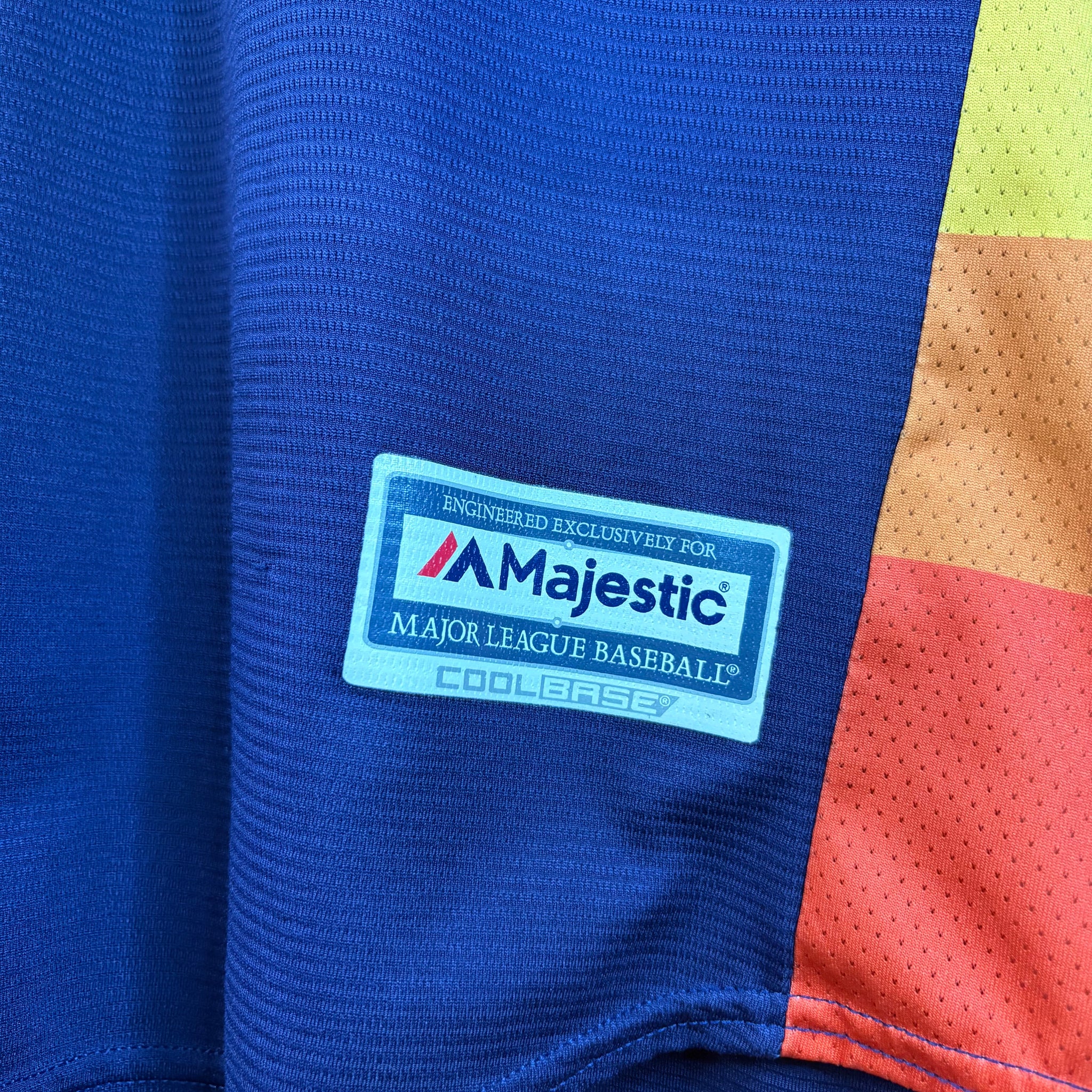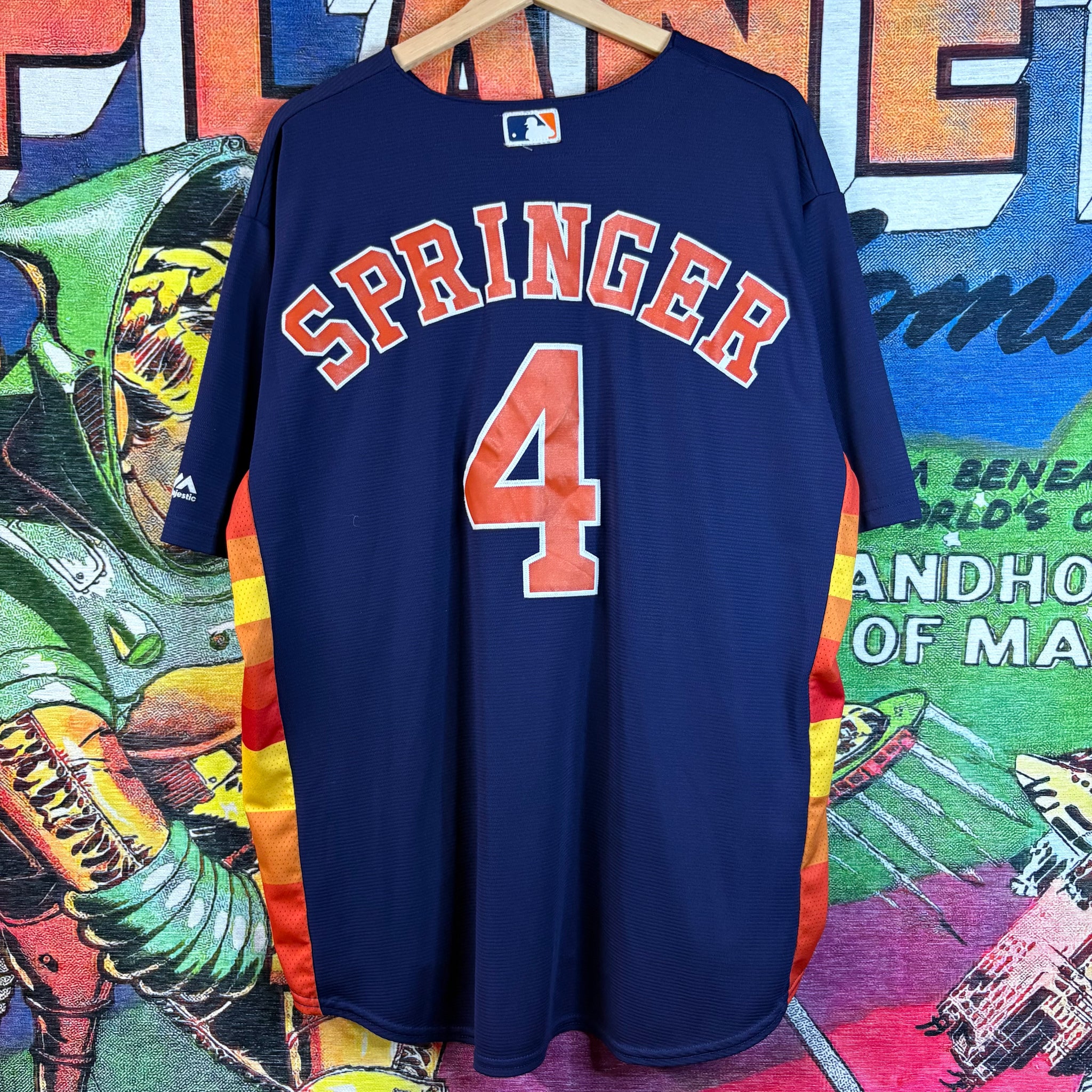 This striking George Springer Houston Astros jersey in deep navy is a throwback to a vibrant era, featuring his iconic number 4 in bold orange and white on the back. It sports the Majestic Cool Base patch, confirming its official Major League Baseball quality and breathable, athletic design. The jersey's eye-catching side panels in a sunset-like gradient of yellow, orange, and red make it a unique piece perfect for any Astros fan.