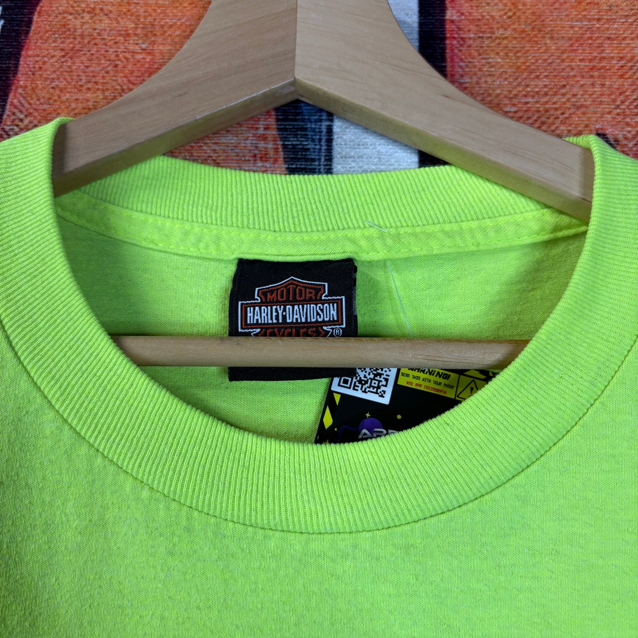 This is an unmissable Harley-Davidson t-shirt in an electric neon yellow-green, combining classic biker attitude with Texas pride. The front displays a rugged "Legendary Motorcycles" graphic featuring a winged skull, while the back showcases a vibrant design for Stubbs Harley-Davidson, Houston, Texas, set against the state's silhouette and featuring an iconic Space Shuttle launch and a custom bike. This eye-catching piece is perfect for Houston locals or collectors of unique dealer memorabilia.