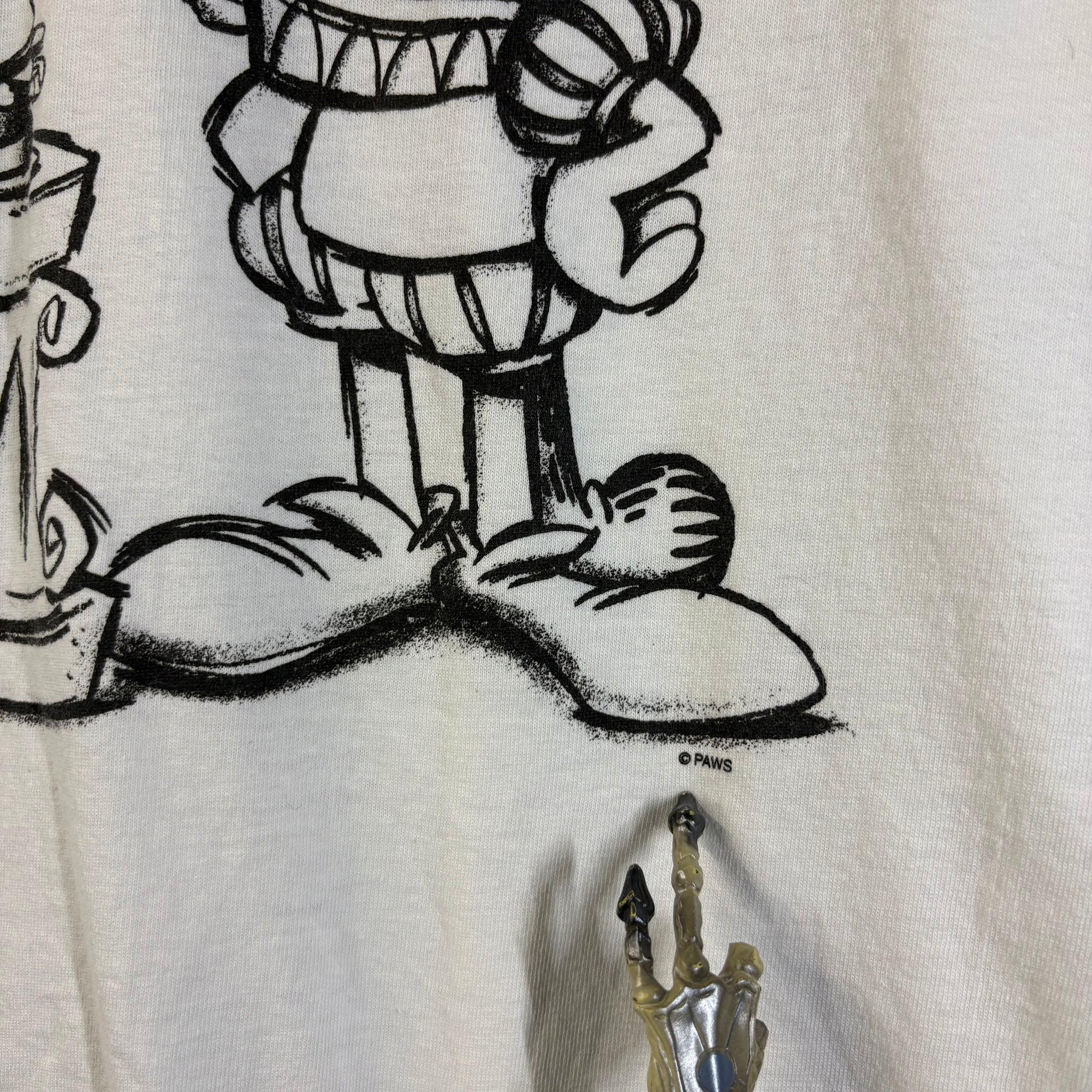 This unique, vintage Garfield T-shirt features the beloved cartoon cat hilariously dressed as Hamlet, pondering a covered burger instead of a skull, with the caption: "To eat or not to eat? That is a stupid question." Made on a comfortable Tultex cotton blank, this shirt is a perfect blend of pop culture and classic literature, making it a must-have funny piece for collectors and fans of classic comics.