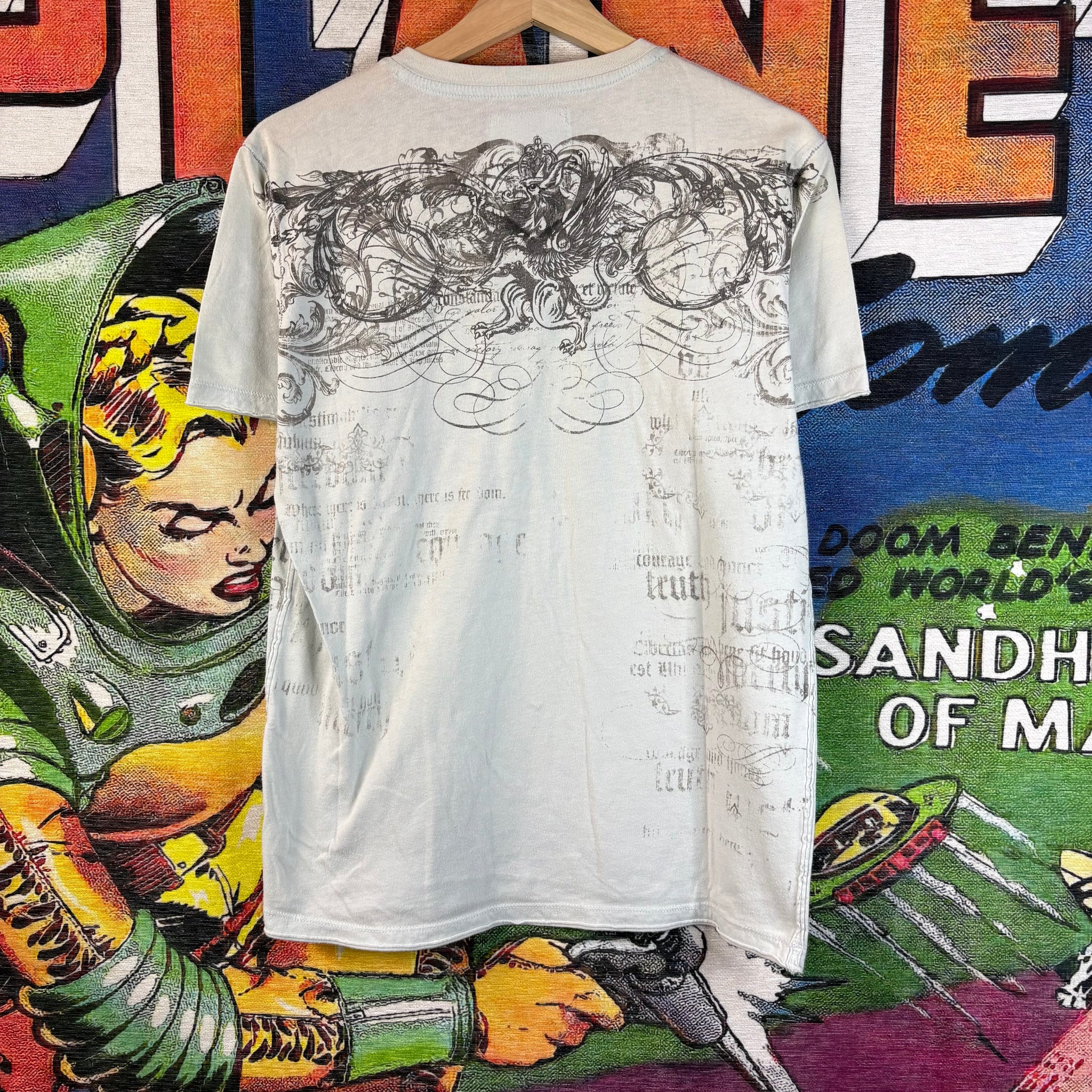 Affliction (or Xtreme Couture by Affliction) styled graphic t-shirt featuring a bold “Dagger” design with intricate detailing throughout. Set against a beige background with gray accents, this piece embodies the tattoo signature fusion of art, edge, and attitude. Perfect for fans of rock-inspired streetwear and statement graphics.