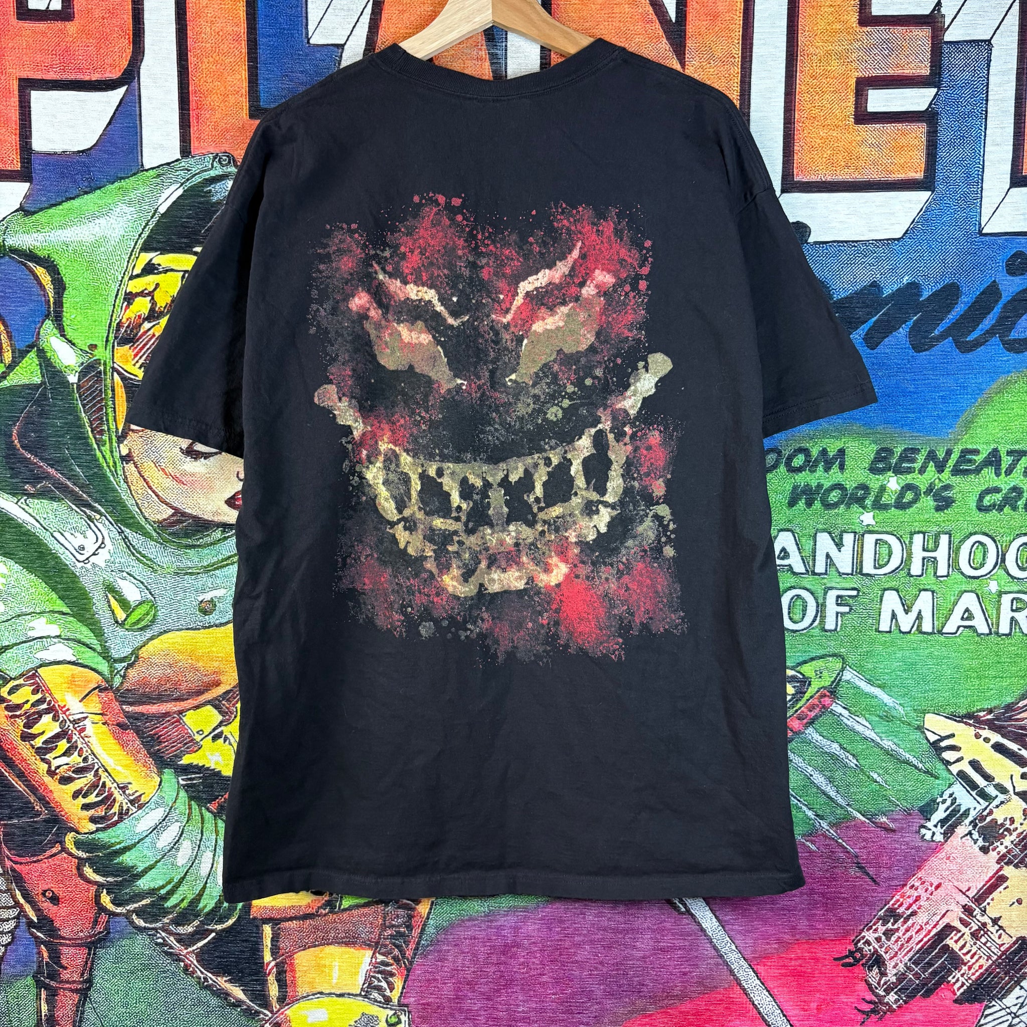 This aggressive vintage 2010 Disturbed "Asylum" album t-shirt is a perfect piece of metal merchandise, featuring a dark four-panel graphic reminiscent of unsettling asylum photos on the front. The back is just as intense, showcasing a menacing, blood-splatter-style image of their iconic mascot face. Printed on a Hanes Heavyweight XL tee, this shirt is an essential collector's item for fans of the multi-platinum band's visceral imagery.