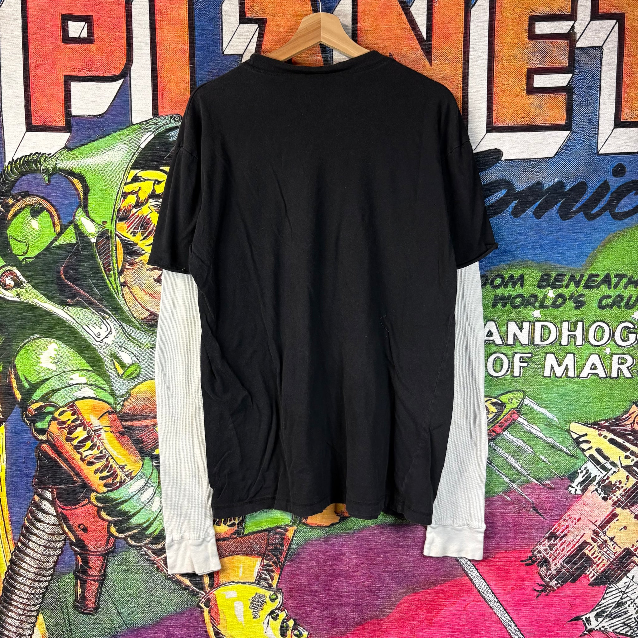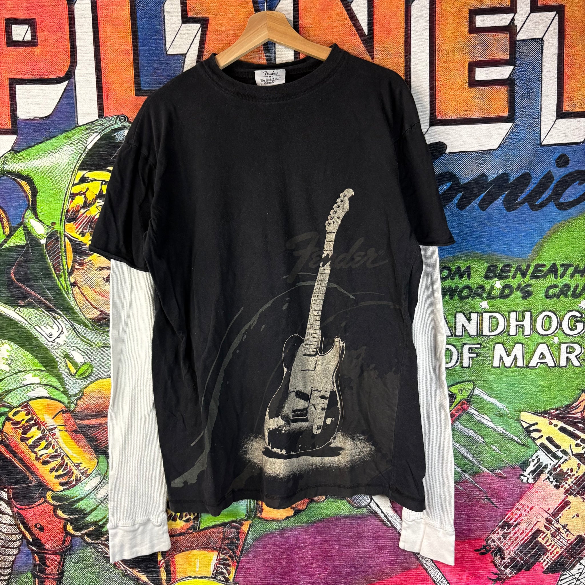 This vintage Y2K Fender t-shirt features a layered look with a long-sleeve undershirt built in, giving it a unique early 2000s rock-inspired style. Designed for men in size XL, it showcases the iconic Fender branding and is perfect for music lovers or streetwear enthusiasts.