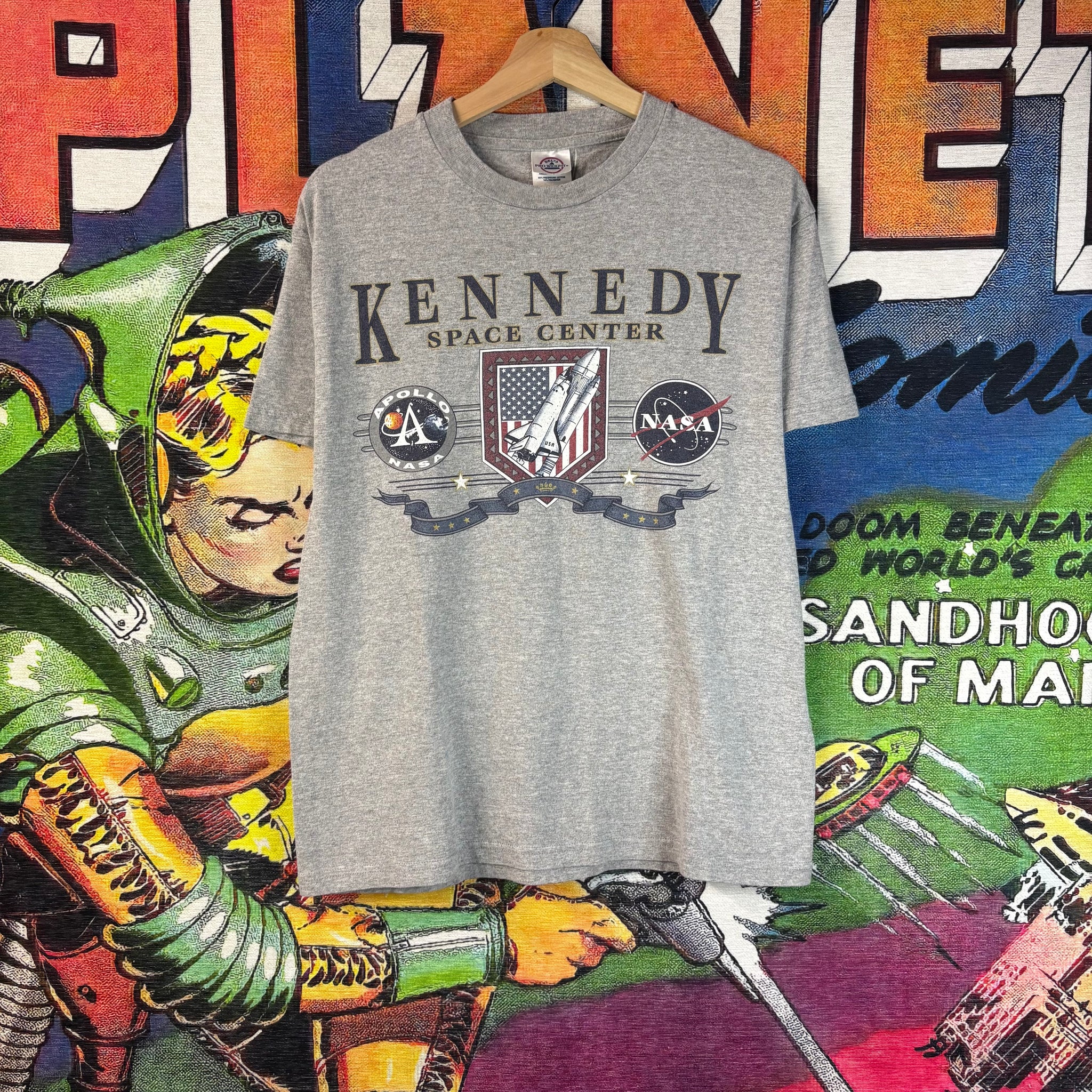 A vintage early 2000s gray cotton tee featuring a bold Kennedy Space Center NASA graphic on the front. This classic Y2K piece captures the era’s fascination with space exploration and retro tech-inspired designs, perfect for collectors or streetwear enthusiasts.