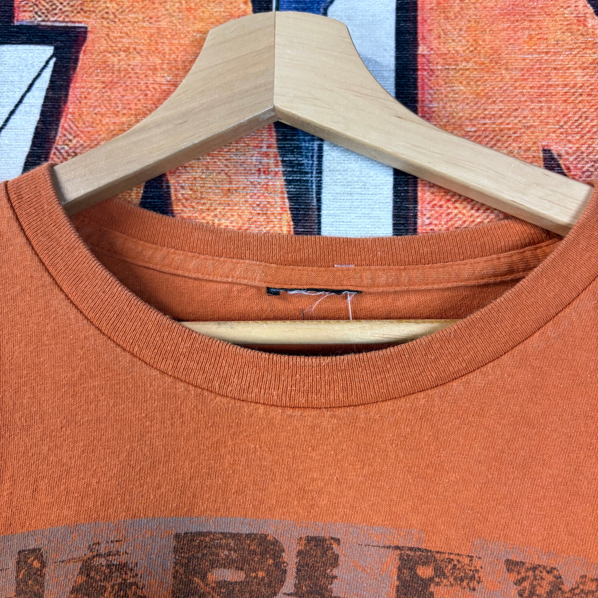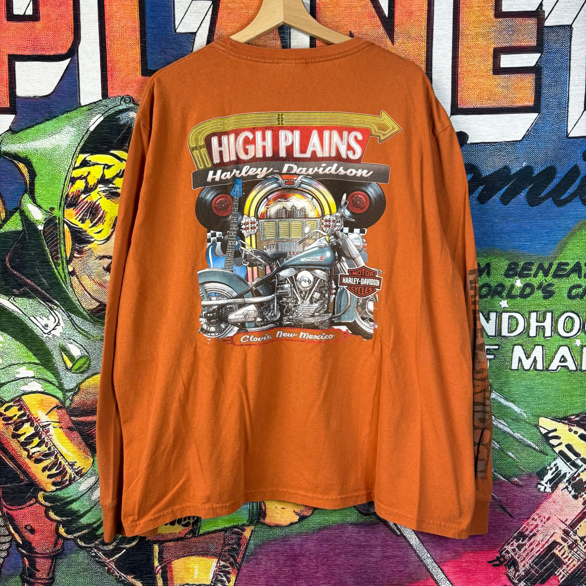 This bold Harley-Davidson long-sleeve tee in striking orange features a distressed skull and logo graphic on the front, with "Motorcycles" and smaller skulls running down the sleeves. The back boasts a colorful High Plains Harley-Davidson, Clovis, New Mexico graphic depicting a detailed bike and a retro jukebox, making it a rugged and collectible piece of dealer memorabilia.